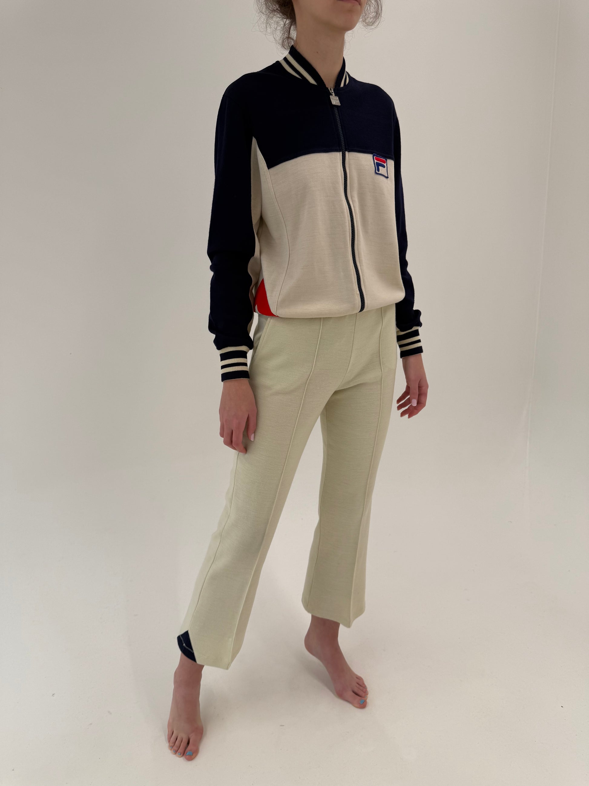 combinația de culori crem-navy cu inserție roșie este una folosită frecvent în FILA White Line în perioada 80