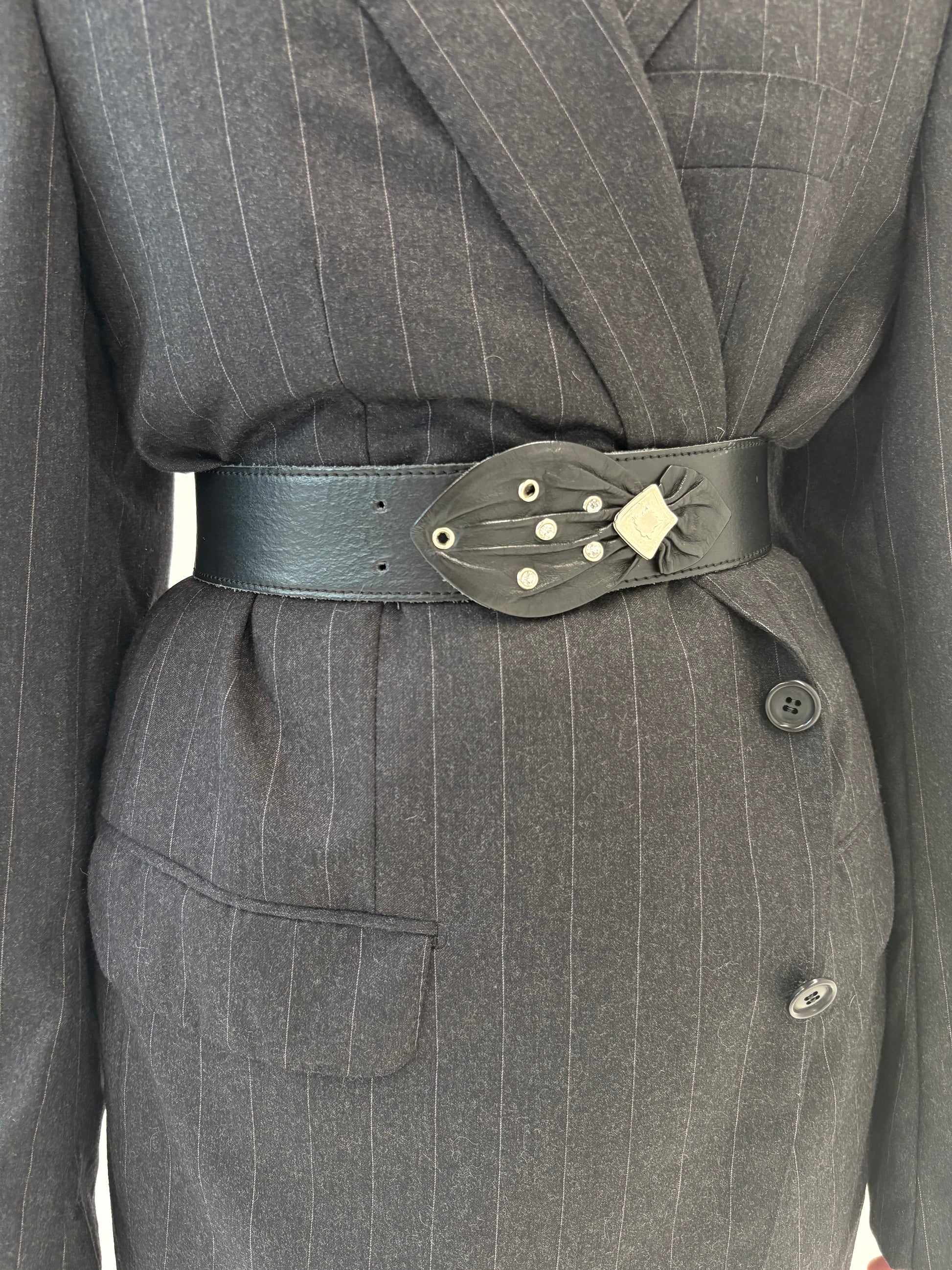 Centura vintage din piele naturală neagră extrafina cu feronerie argintie