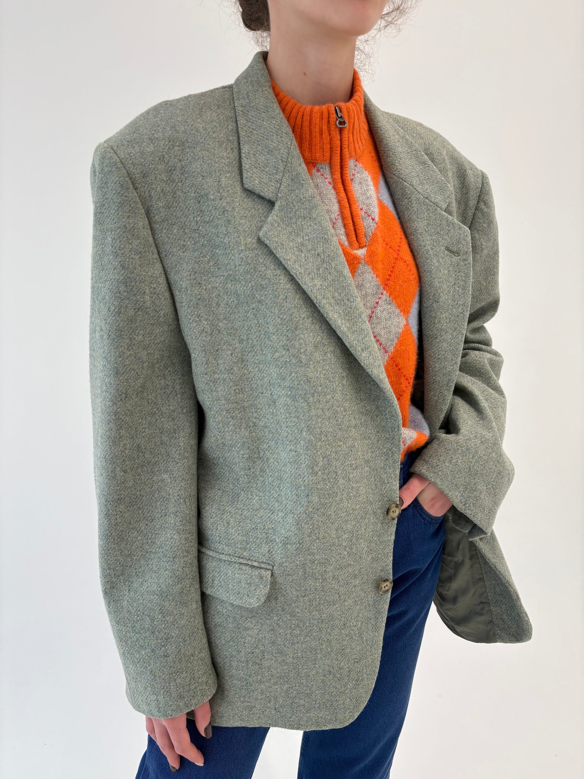 Sacou Sage green din tweed plin de lana excepțională cu inserții pudrate