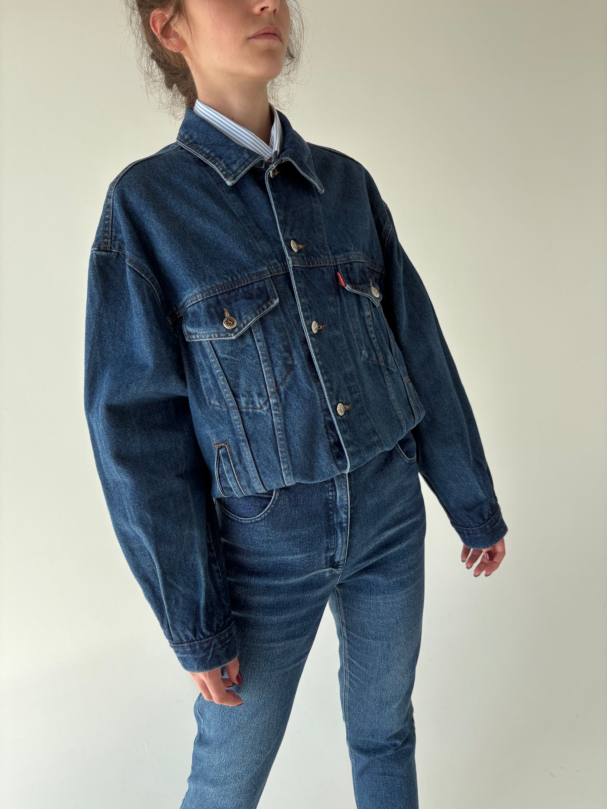 Croiul este clasic tip trucker jacket dar cu proporții ușor lăsate pe umeri și mai largă ceea ce indică final de ani 80