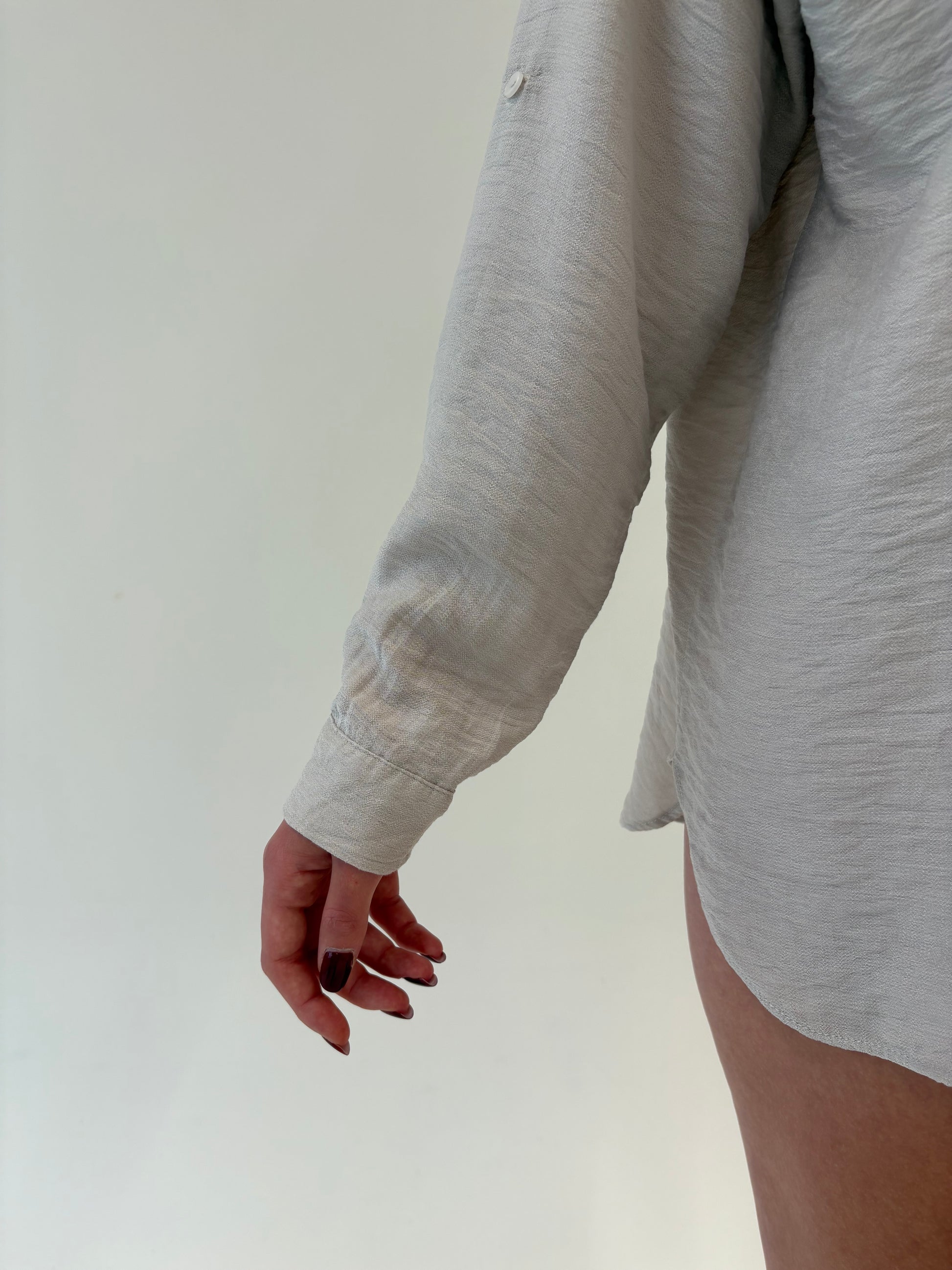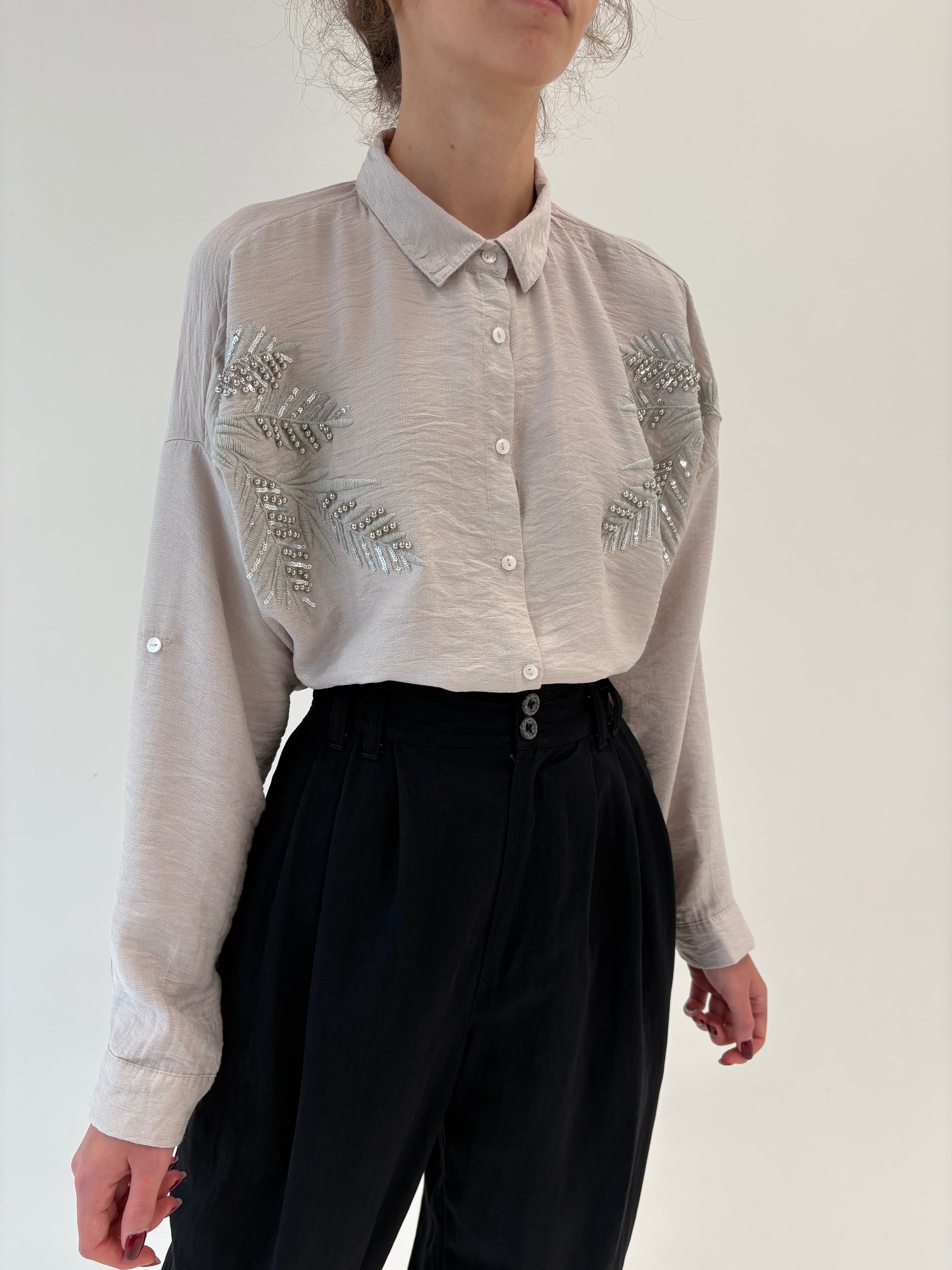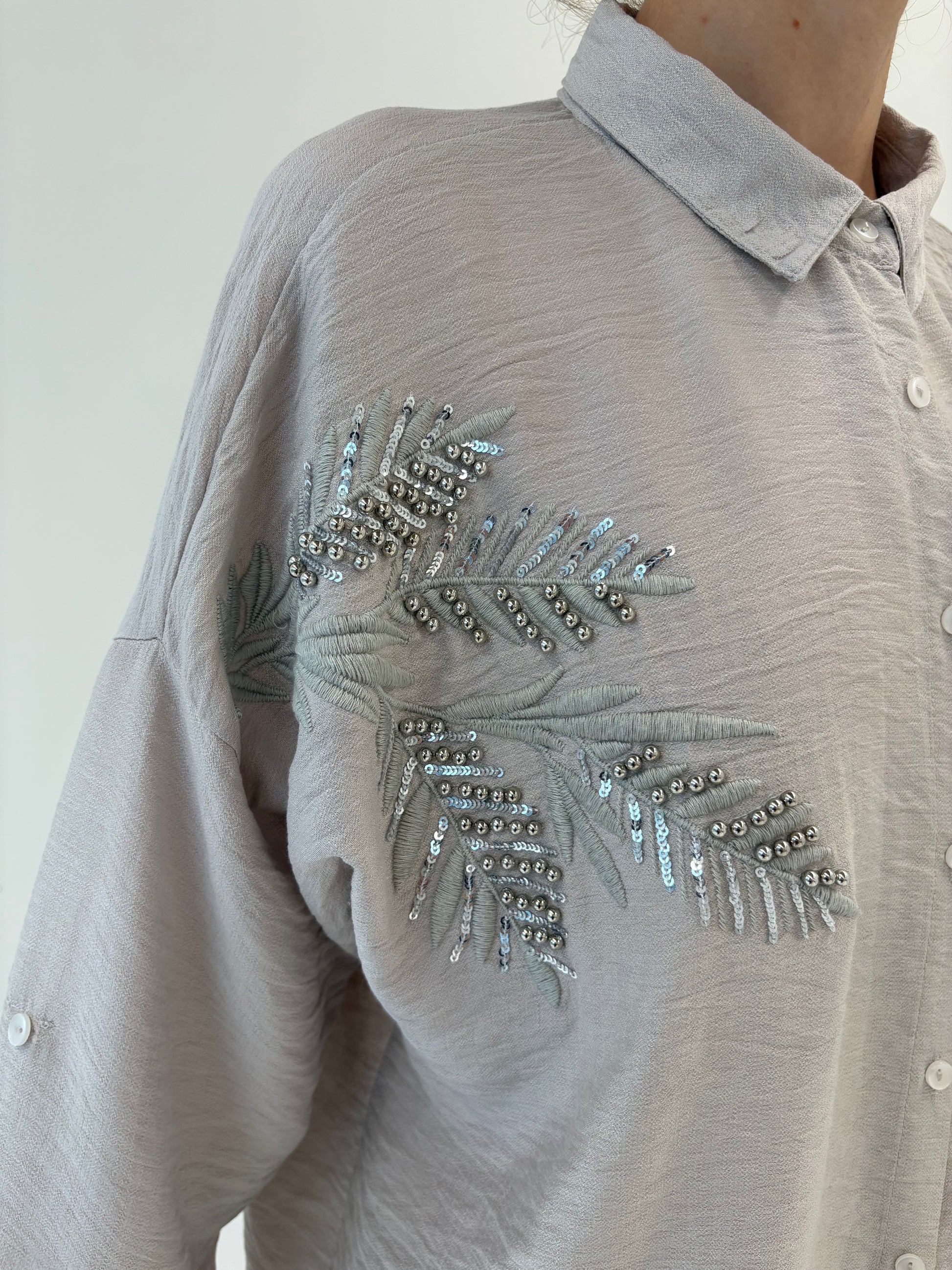 Cămașa warm gray cu aplicații argintii și broderie în croi lejer