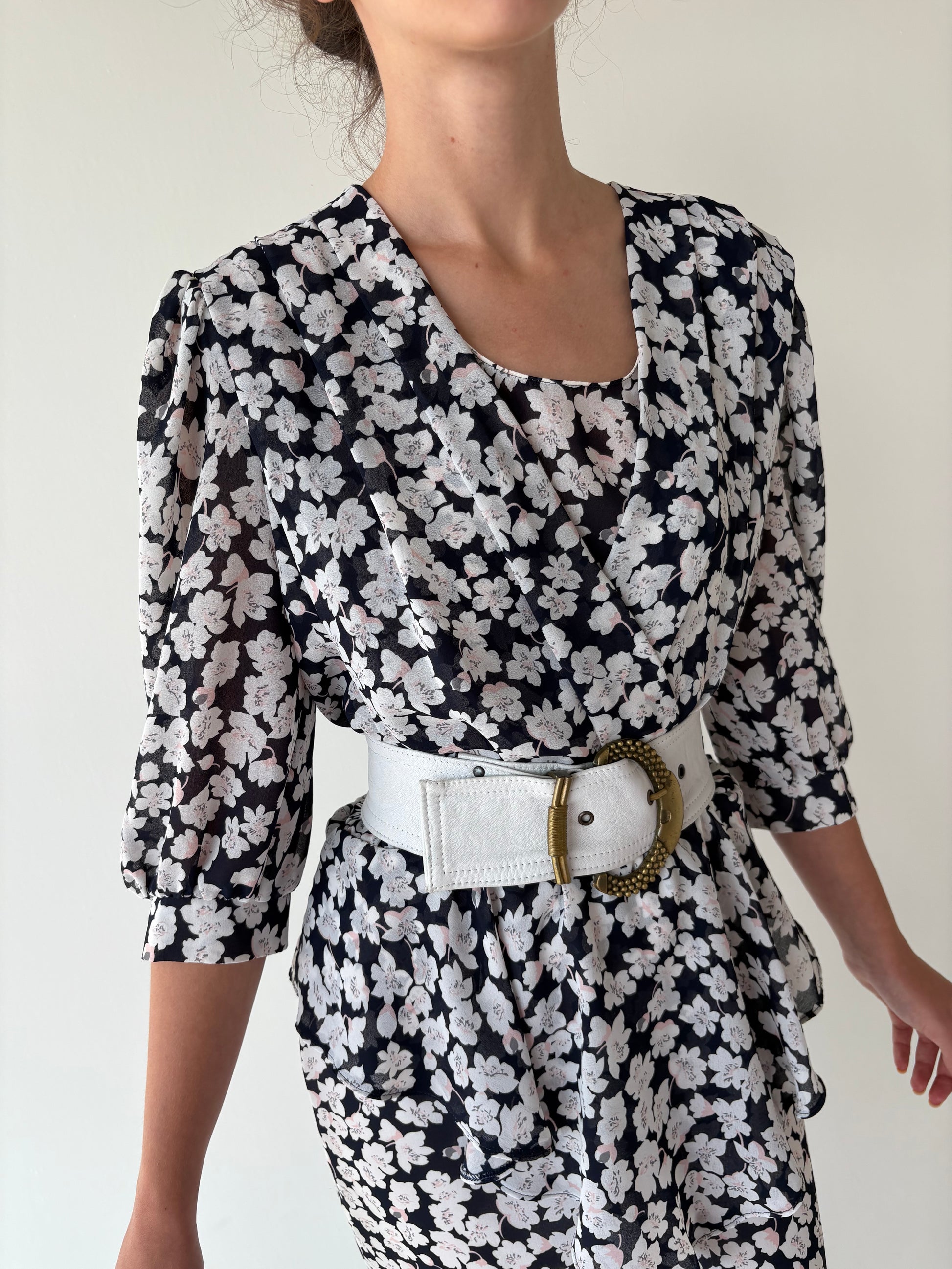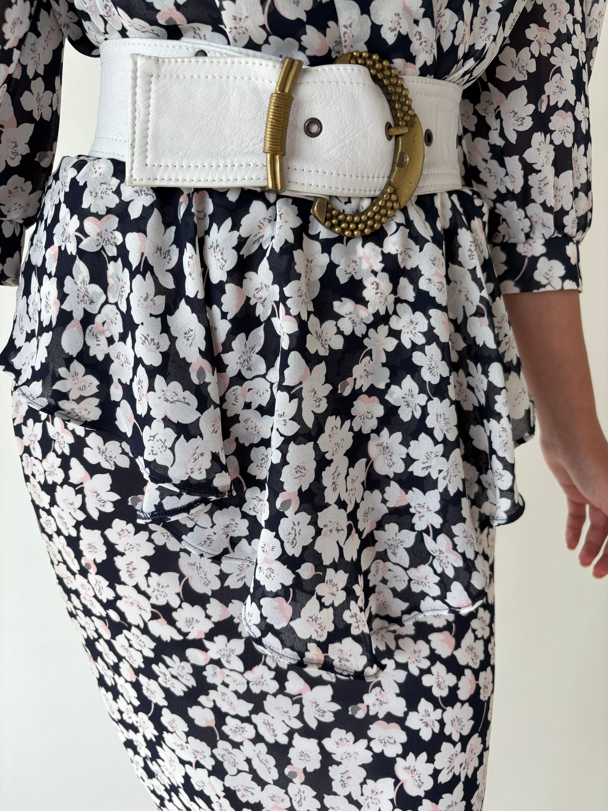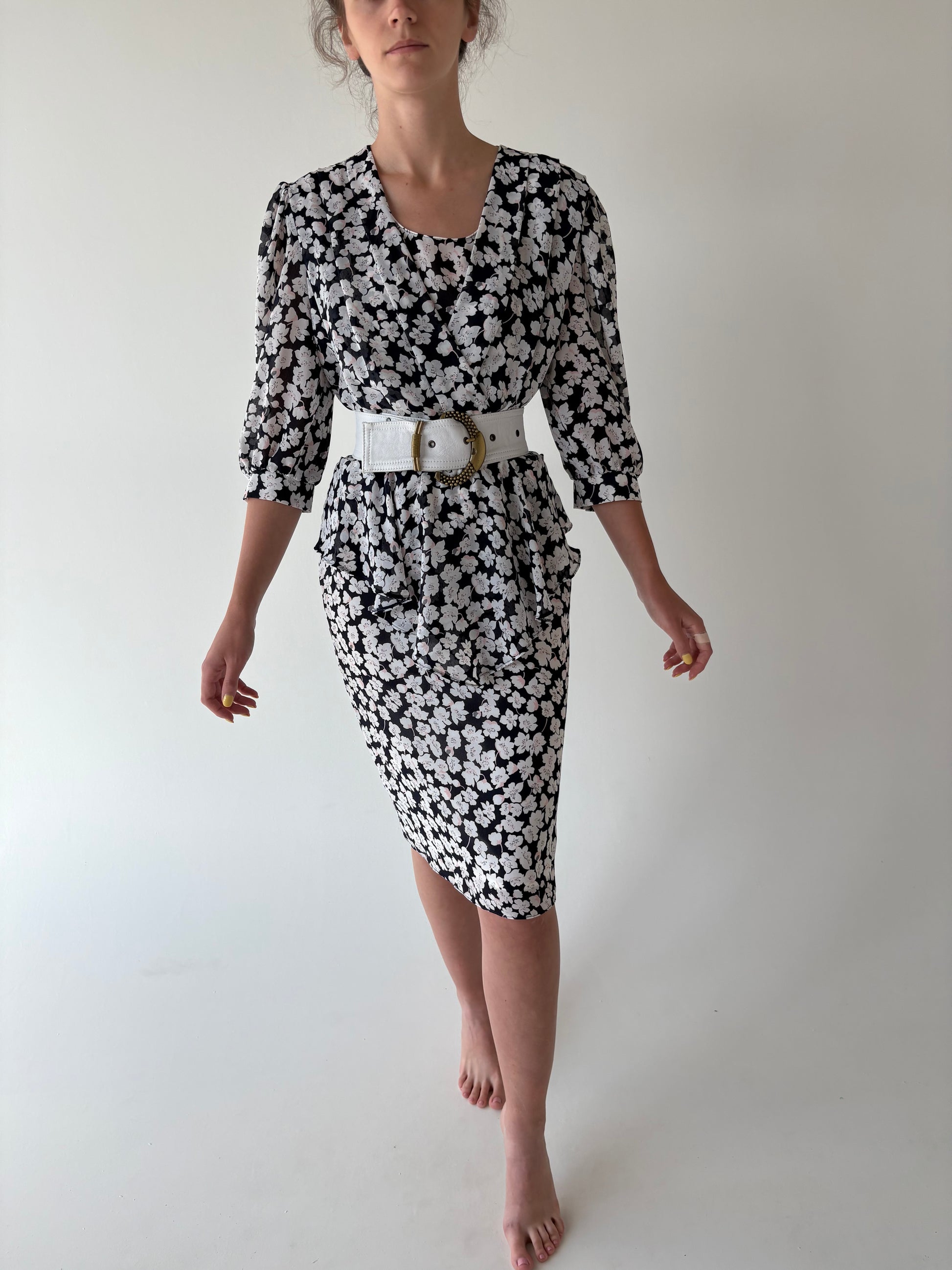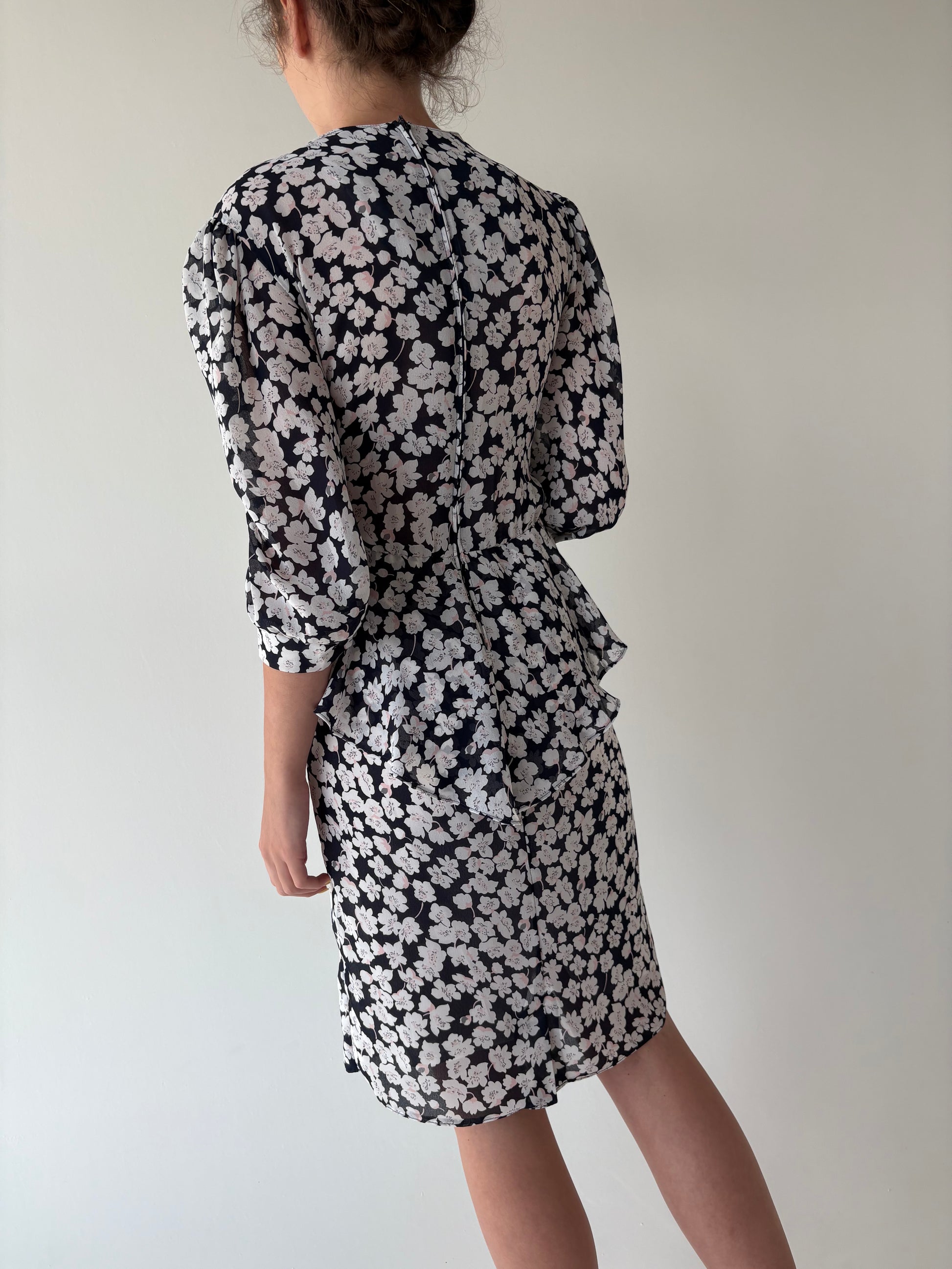 Rochie vintage cu print floral delicat și talie ultra marcată cu peplum