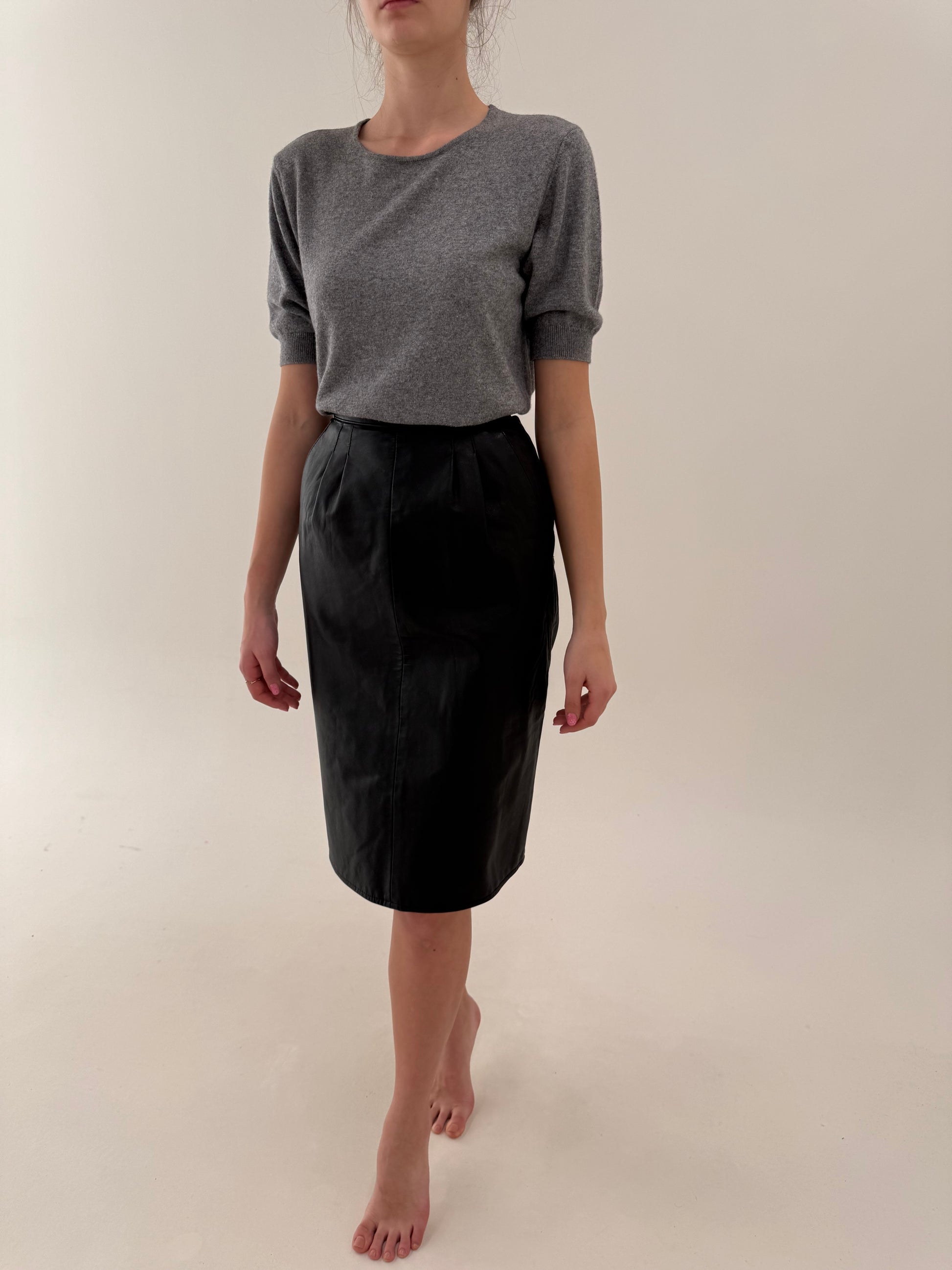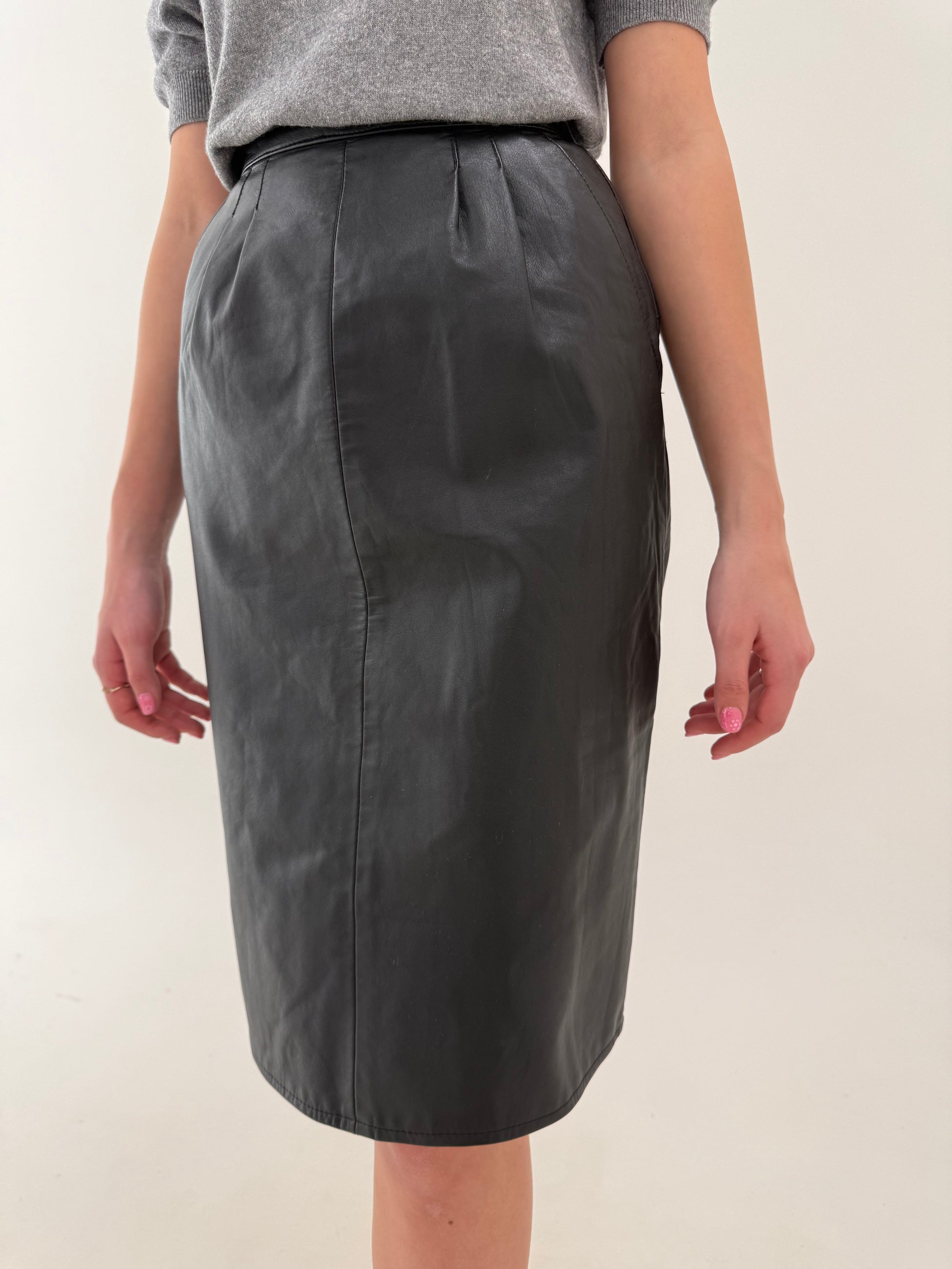 Fustă midi din piele naturală moale cu pense și talie ultra înaltă marcată