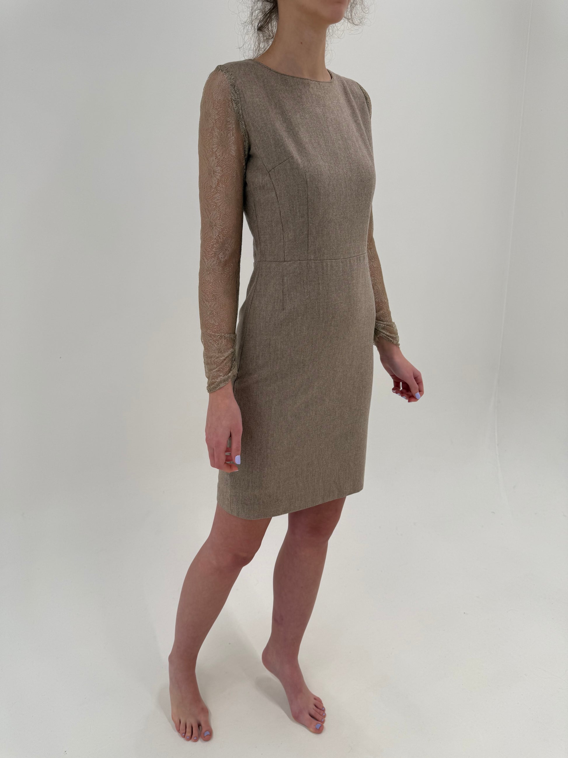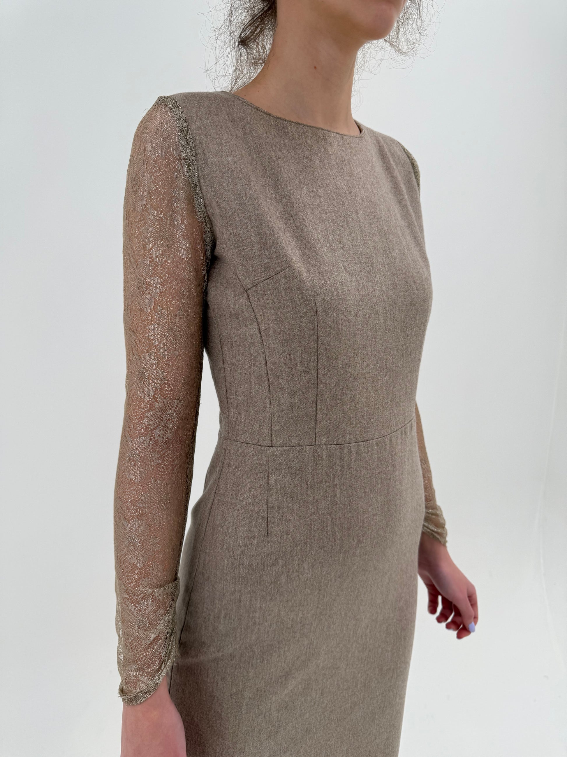 Rochie sand nude de la business la cocktail cu mâneci din dantelă chantily