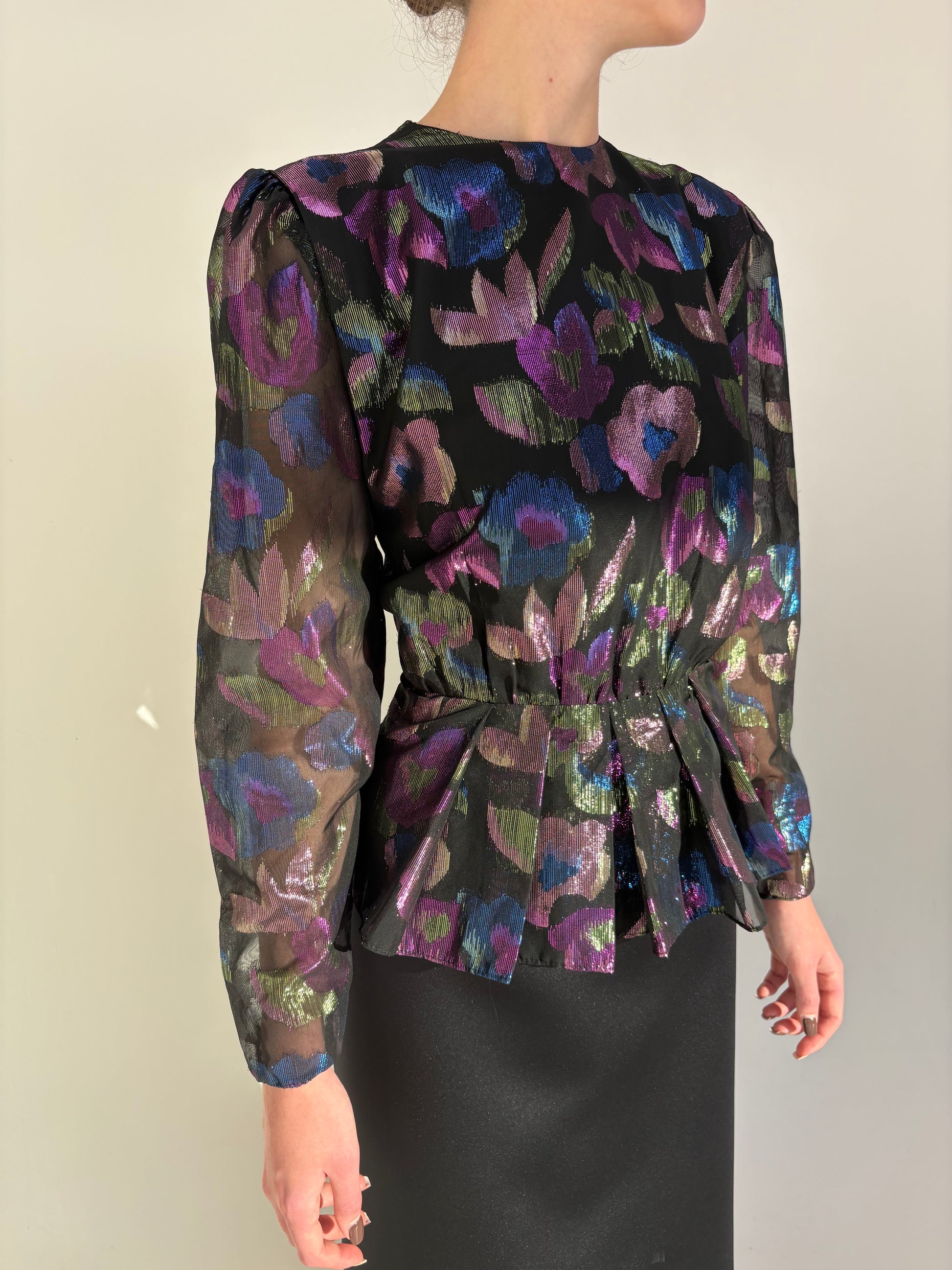 jacquard lamé floral, cu fir metalic în irizații violet-albastru-verde, o combinație frecventă în creațiile de seară din acea perioadă