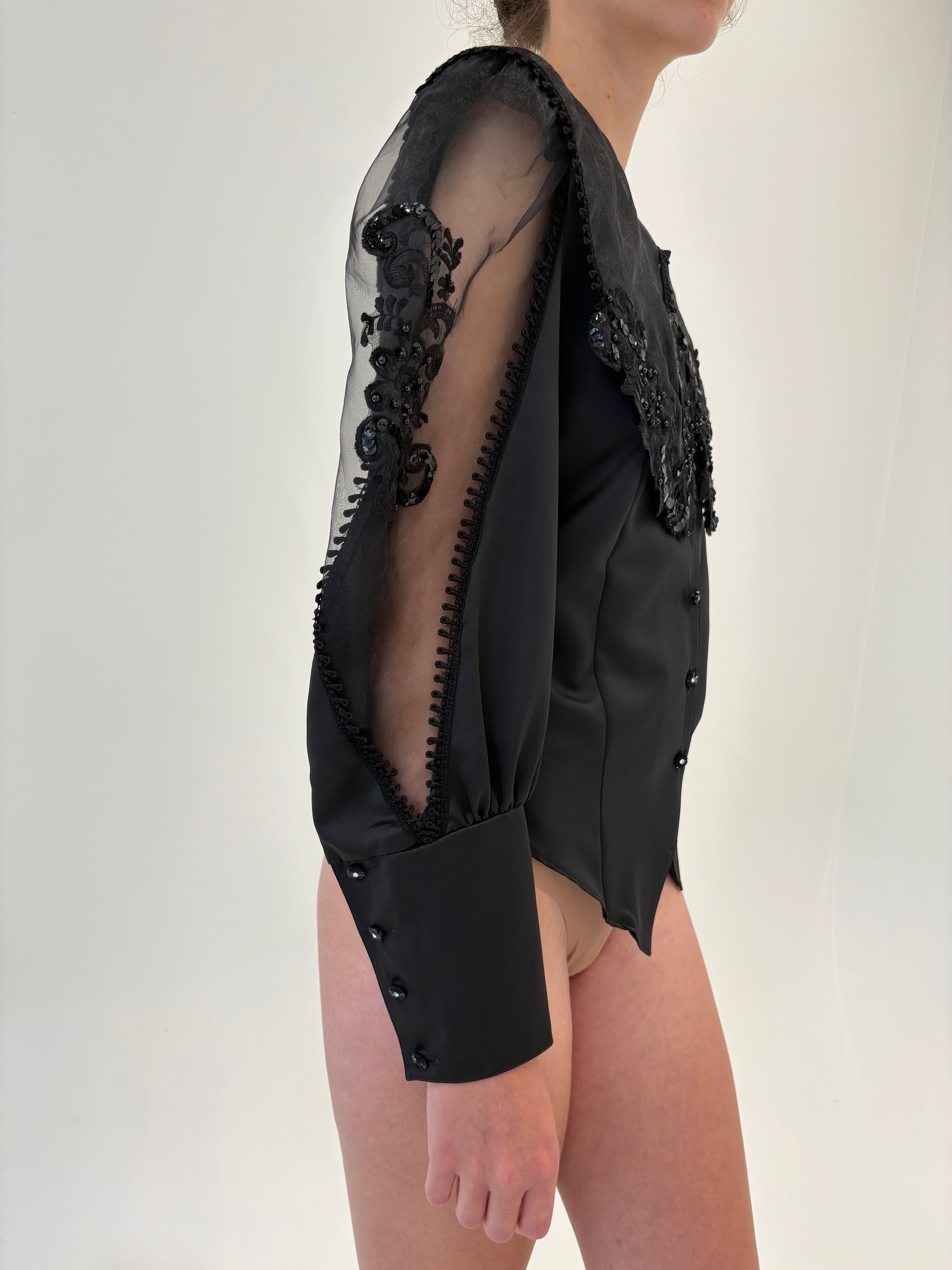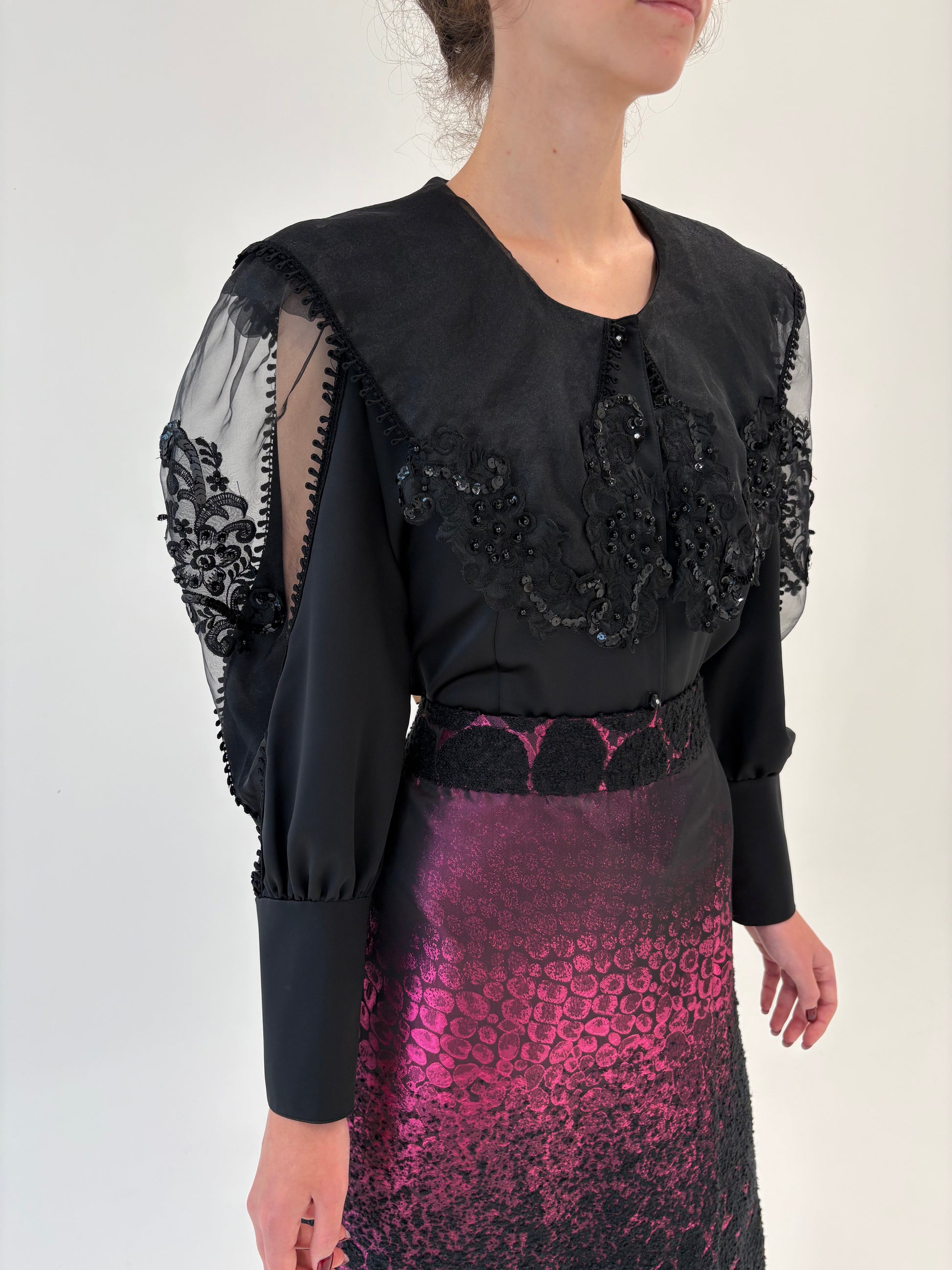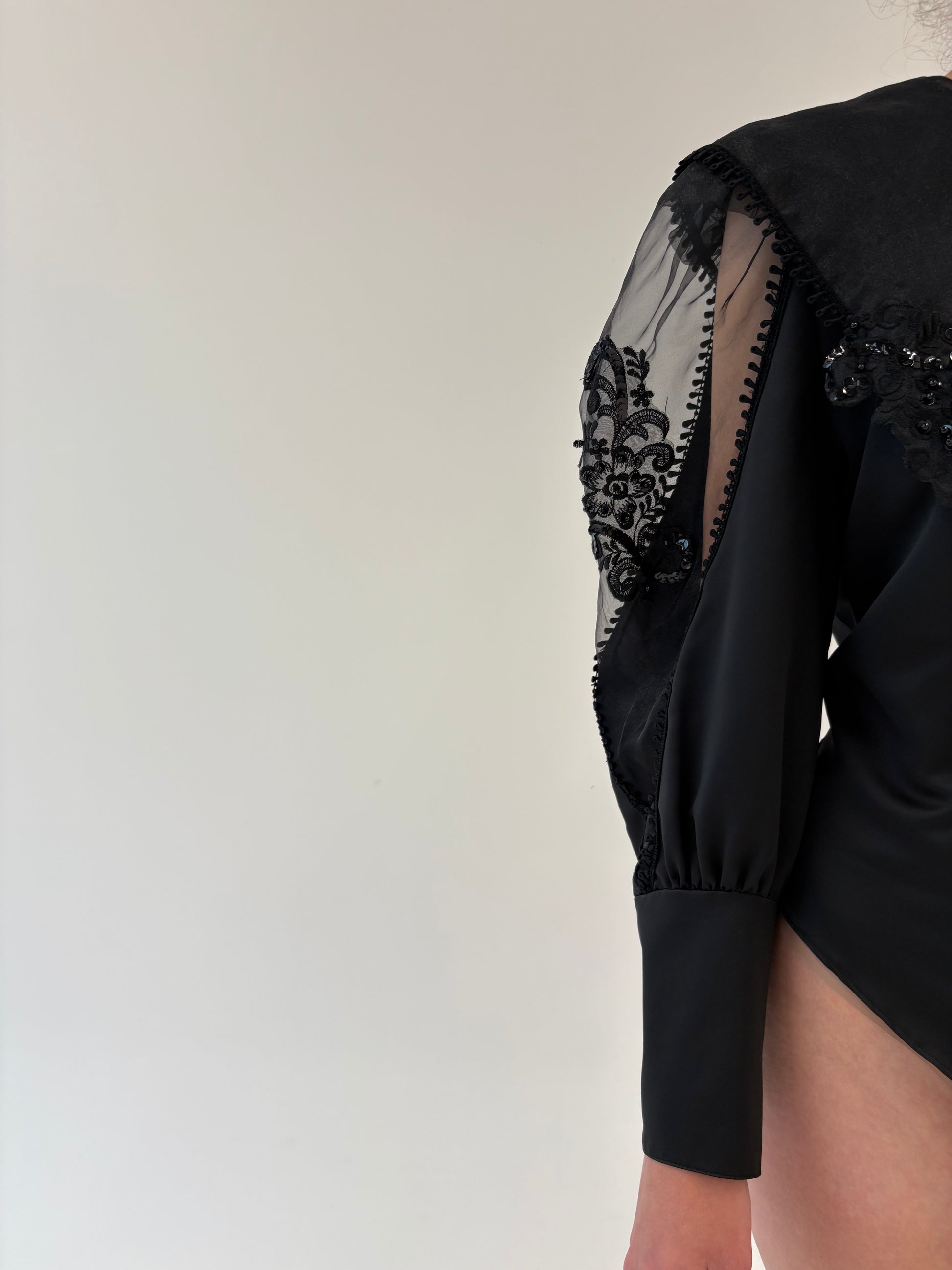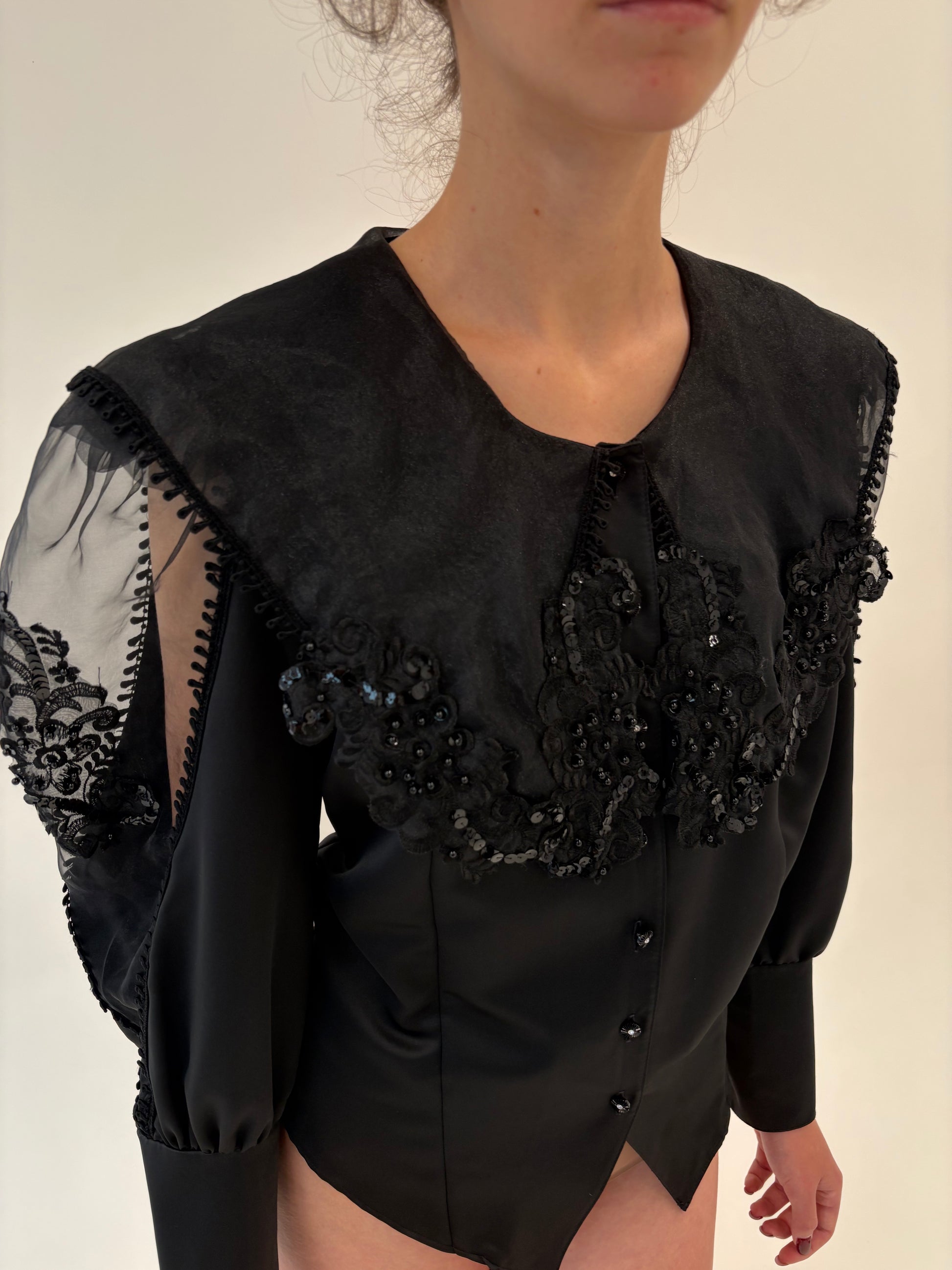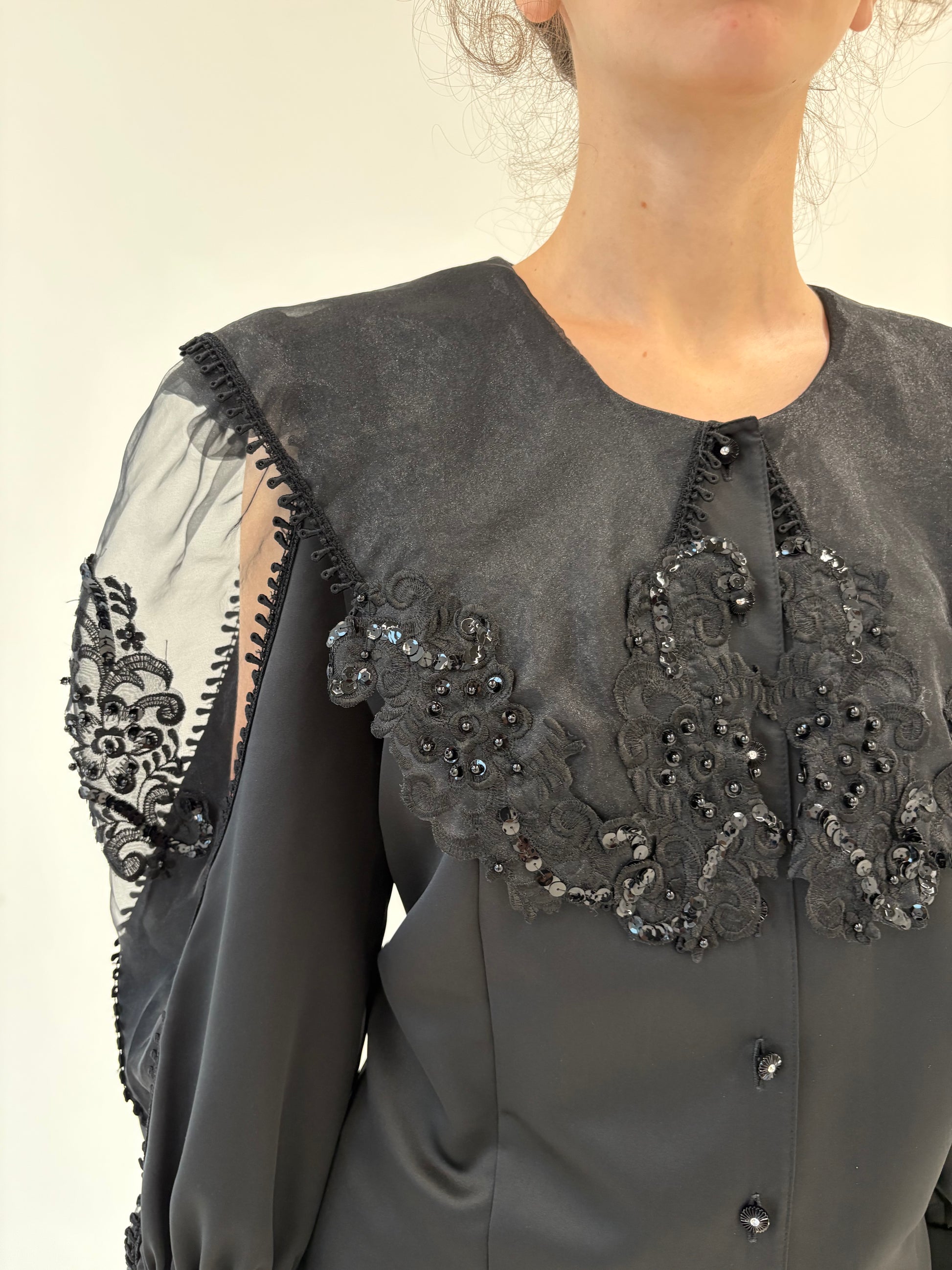Cămașa neagră bijuterie cu aplicații manuale și inserții de organza