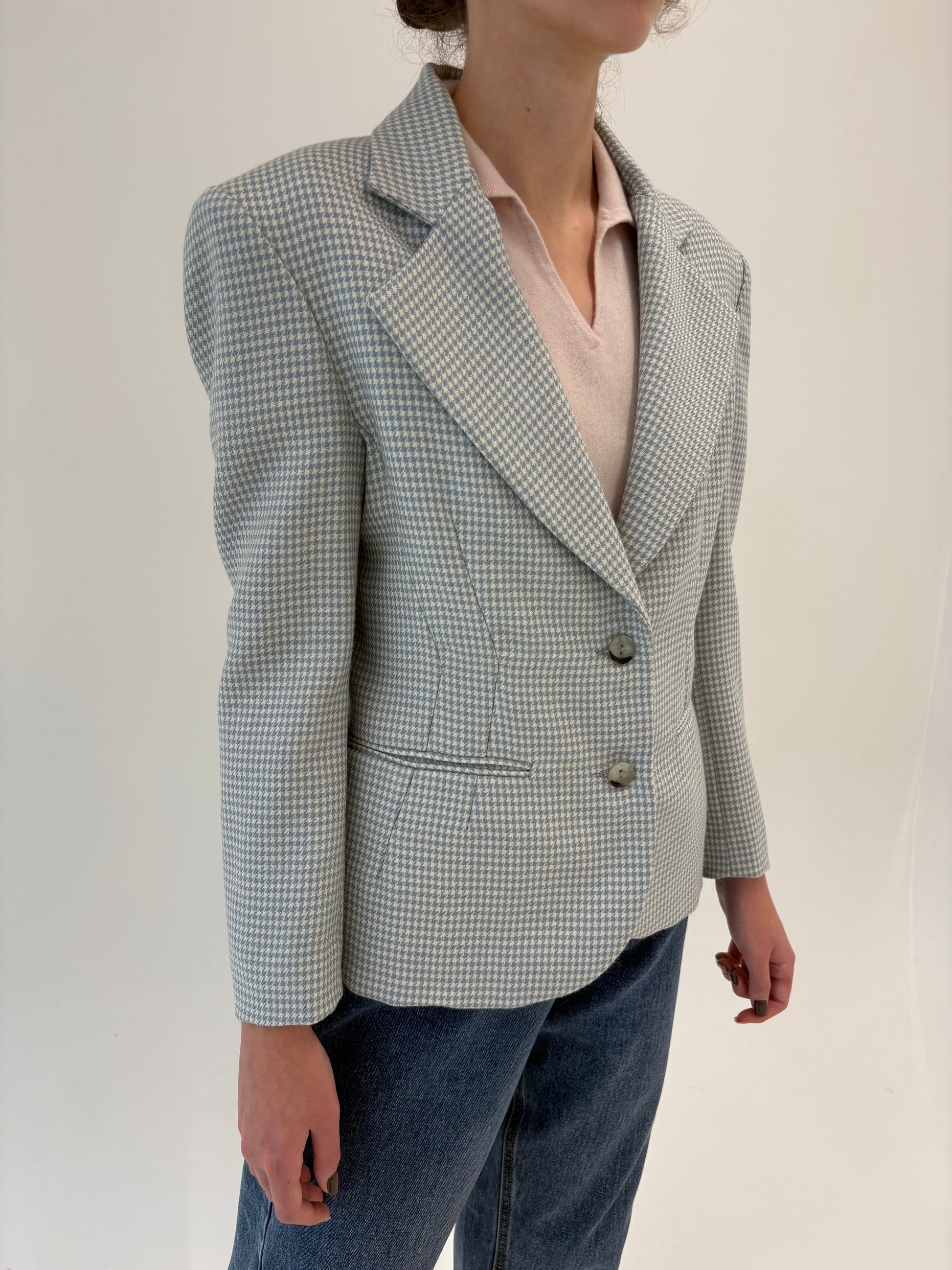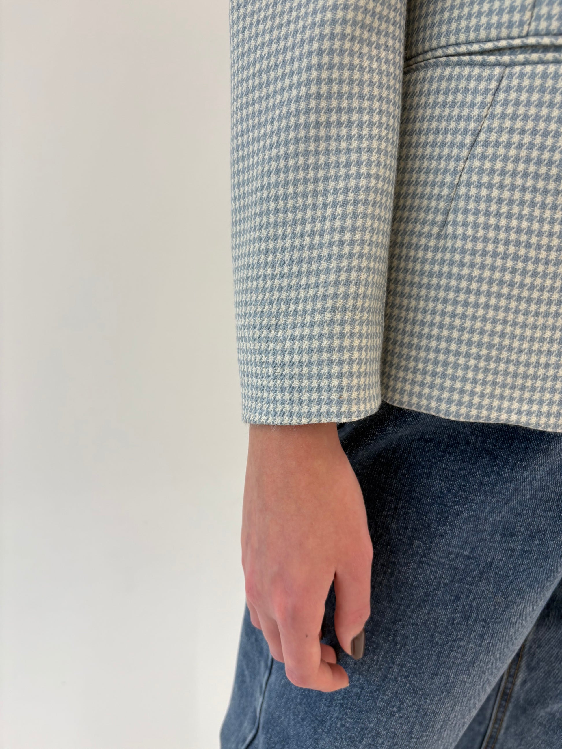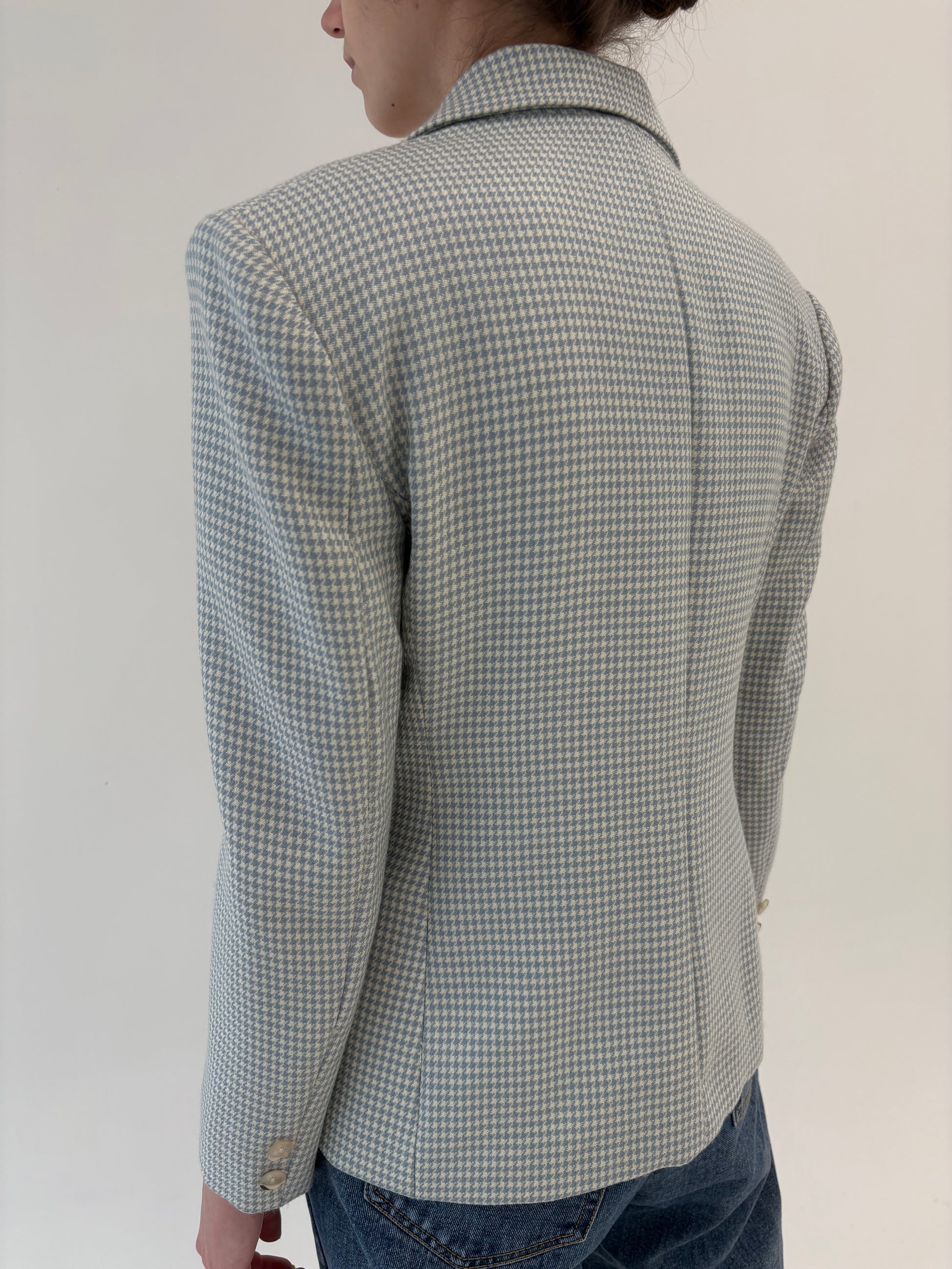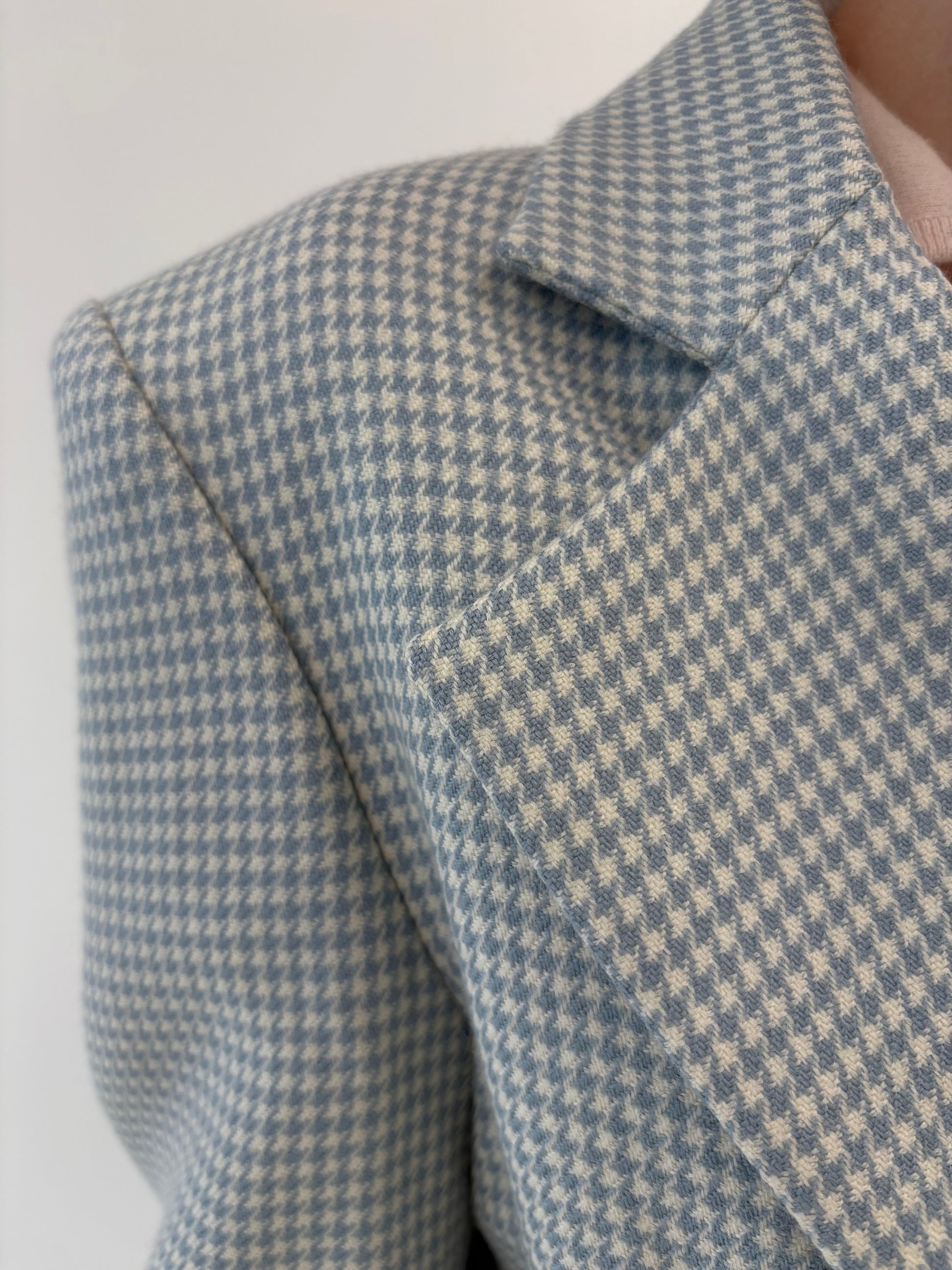 Sacou baby blue in carouri ușor cambrat cu revere late din lana excepțională