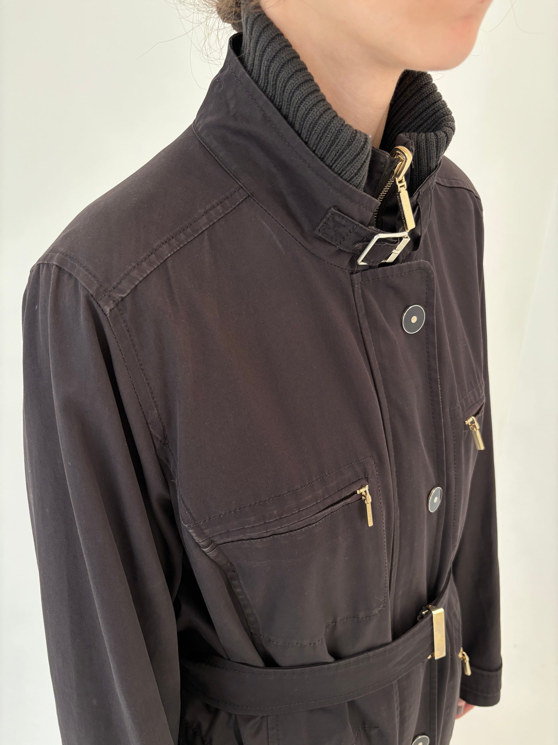 chocolate brown , vestă de puf interioară detașabilă, feronerie aurie, gabardină , impermeabil
