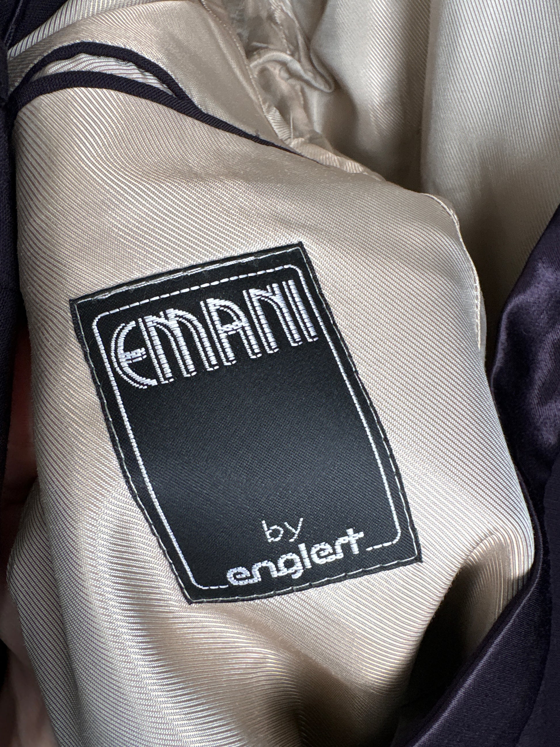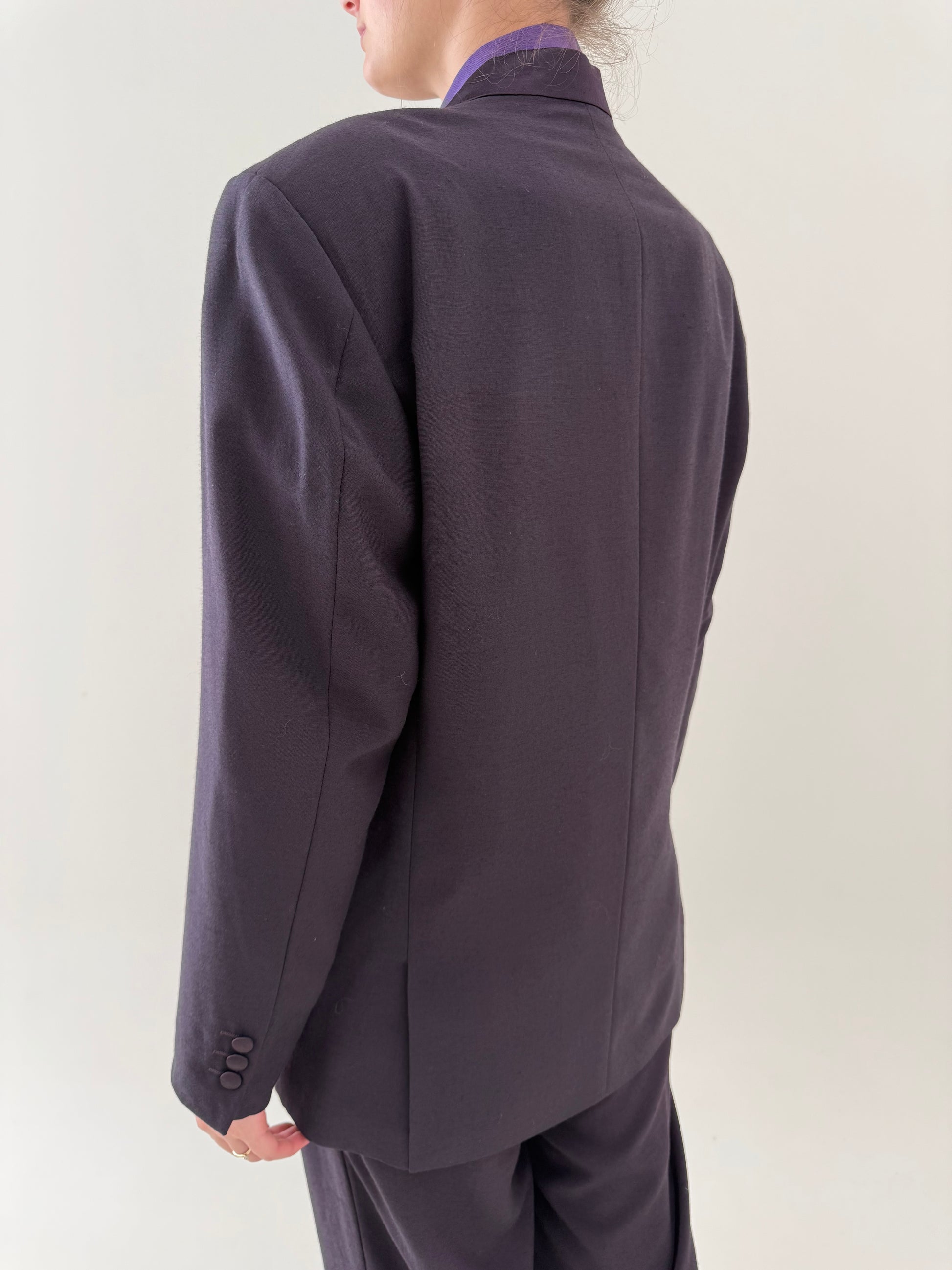 Costum vintage tip smoking aubergine cu revere satinate de la zi la seară