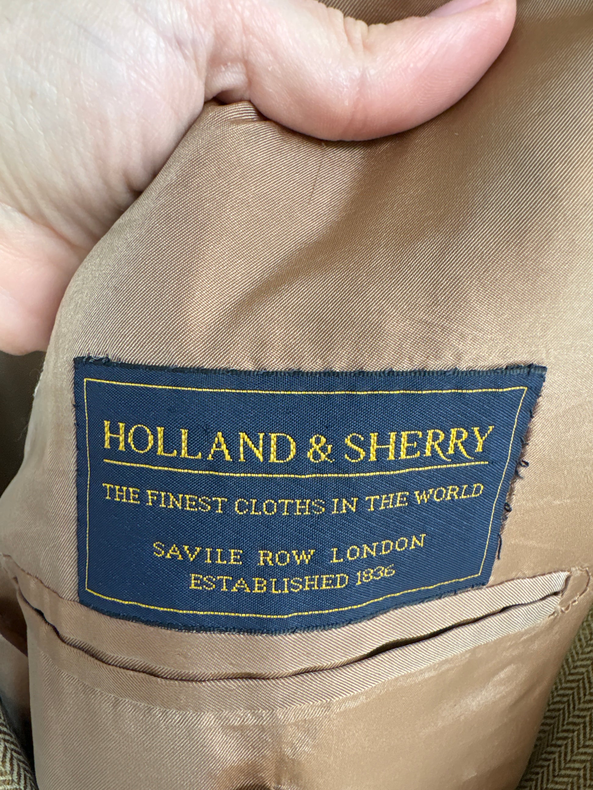 Țesătura are un model clasic herringbone (spic de grâu) într-o nuanță de camel deschis, extrem de fin și dens – un tip de lână care, după aspectul fibrei, este foarte probabil un blend premium de lână cu cașmir (Holland & Sherry produce multe astfel de combinații, de regulă 80% lână, restul casmir)