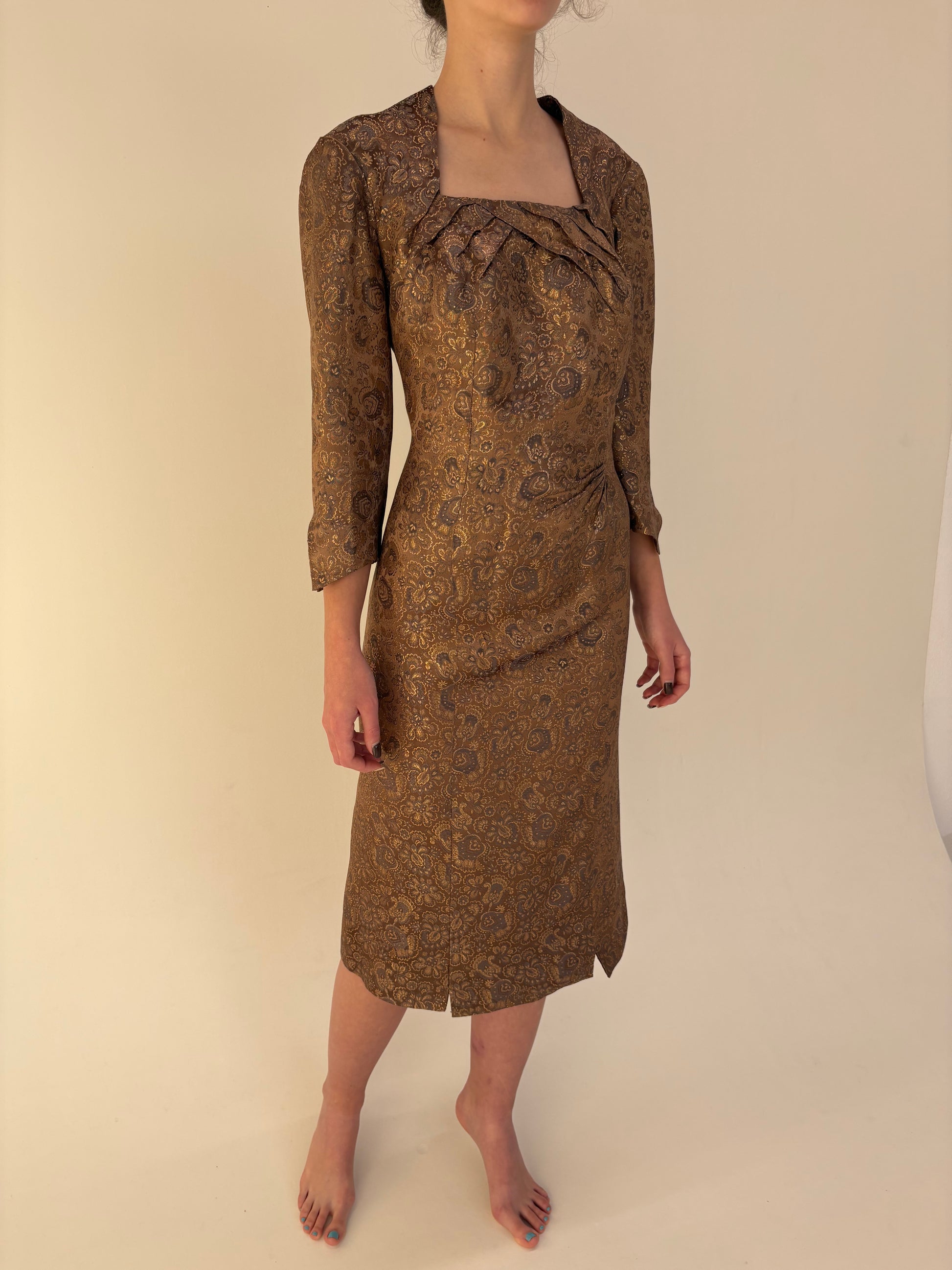Are croiala clasică „cocktail sheath” din perioada de ani 60 târzii , cu talie accentuată și lungime midi, dar și detalii rafinate care o plasează clar înaintea anilor 70: decolteul pătrat cu pliuri arhitecturale, mânecile trei sferturi, fermoarul lung pe mijlocul spatelui și textura brocart metalizat cu model paisley – foarte populară în anii 60 târzii, mai ales pentru rochii de seară sau ocazie