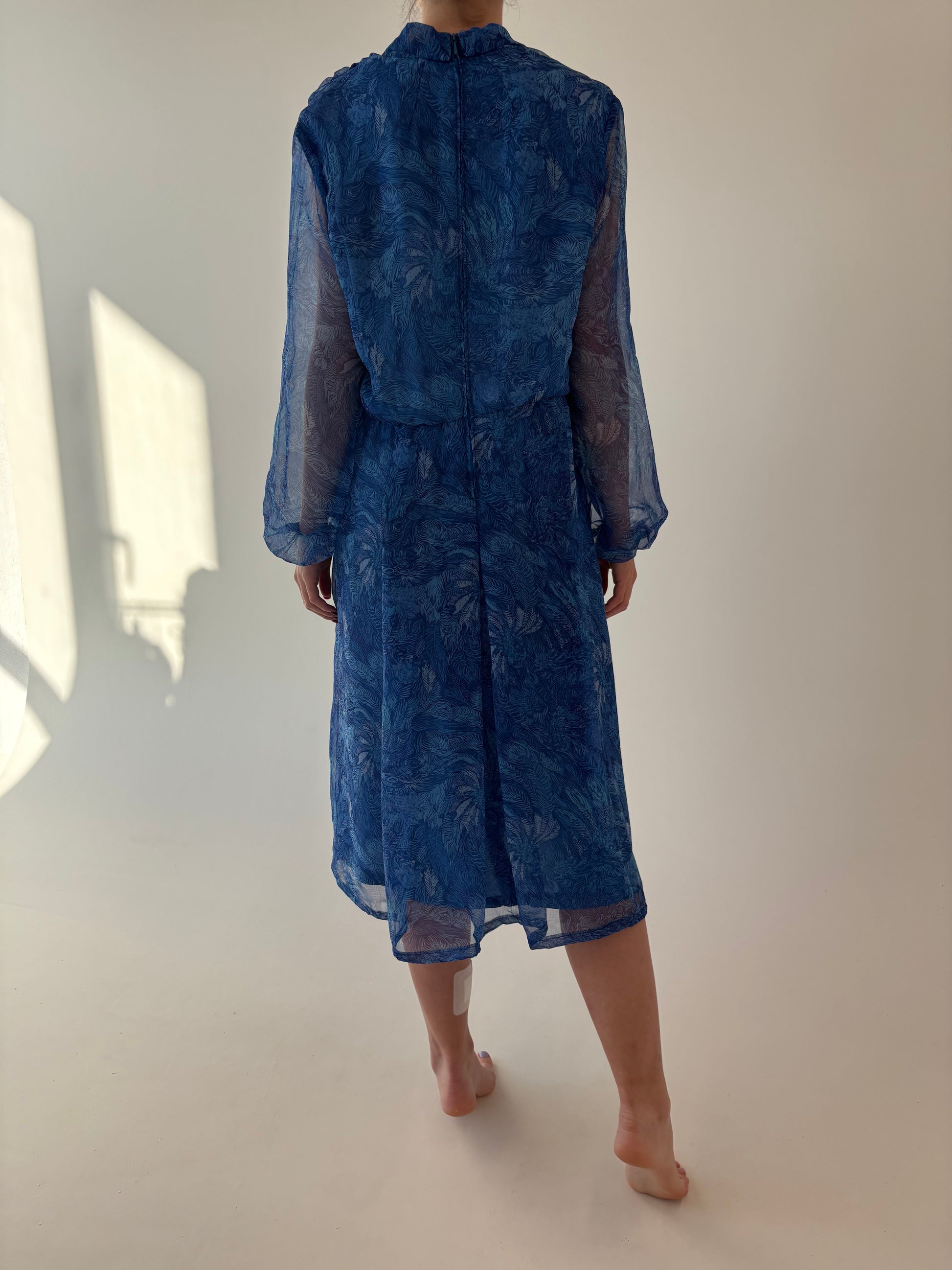 Rochie old vintage anii 70 tie neck în nuanțe superbe de albastru