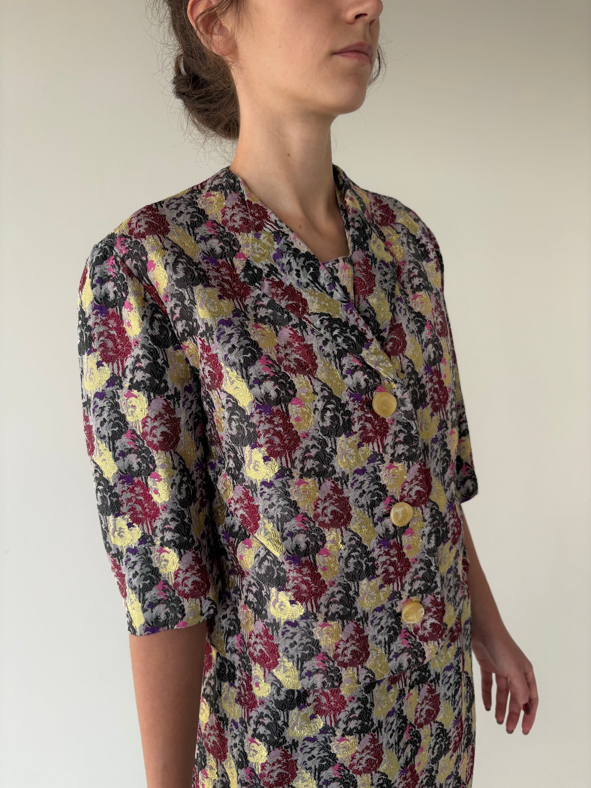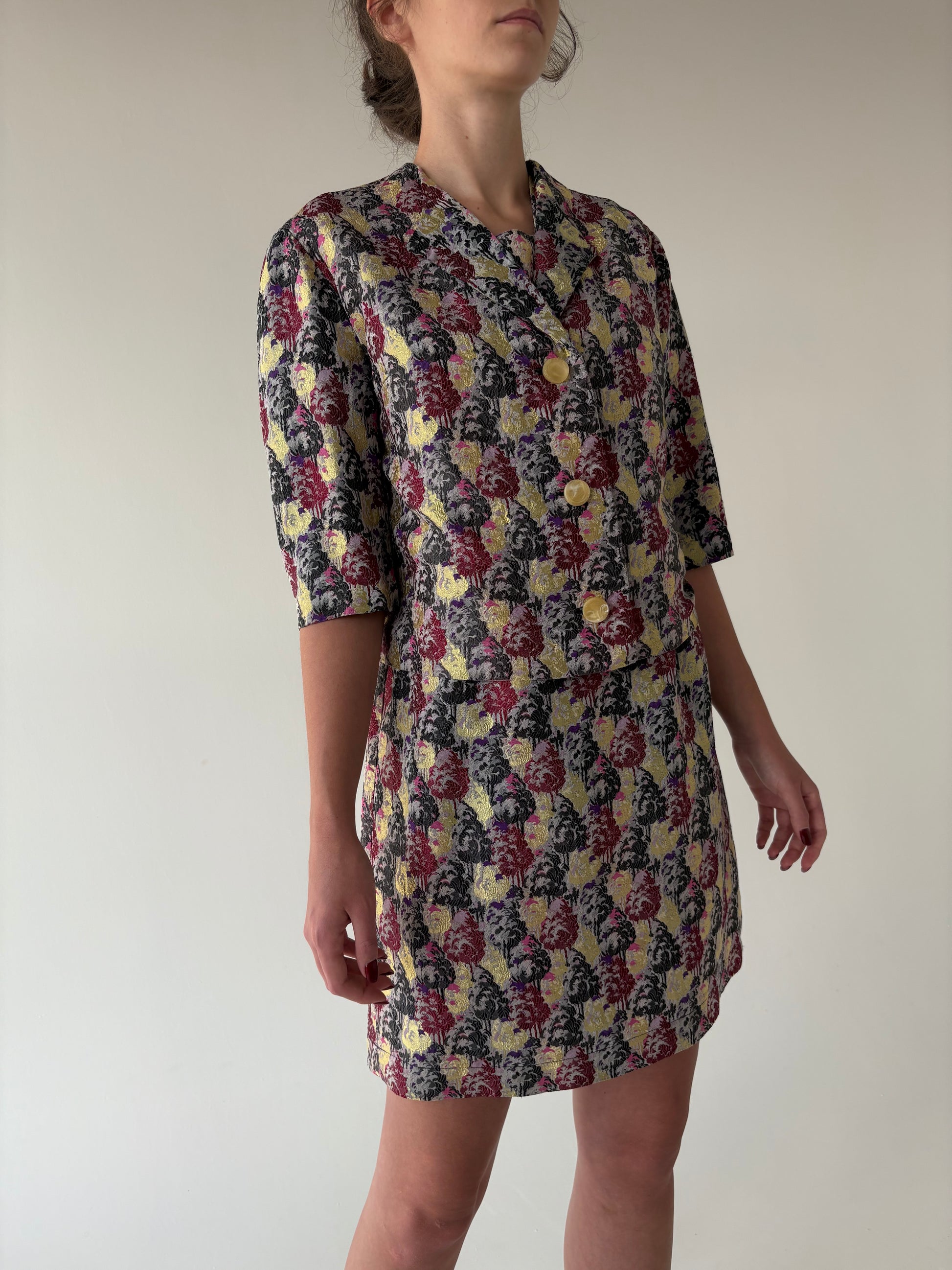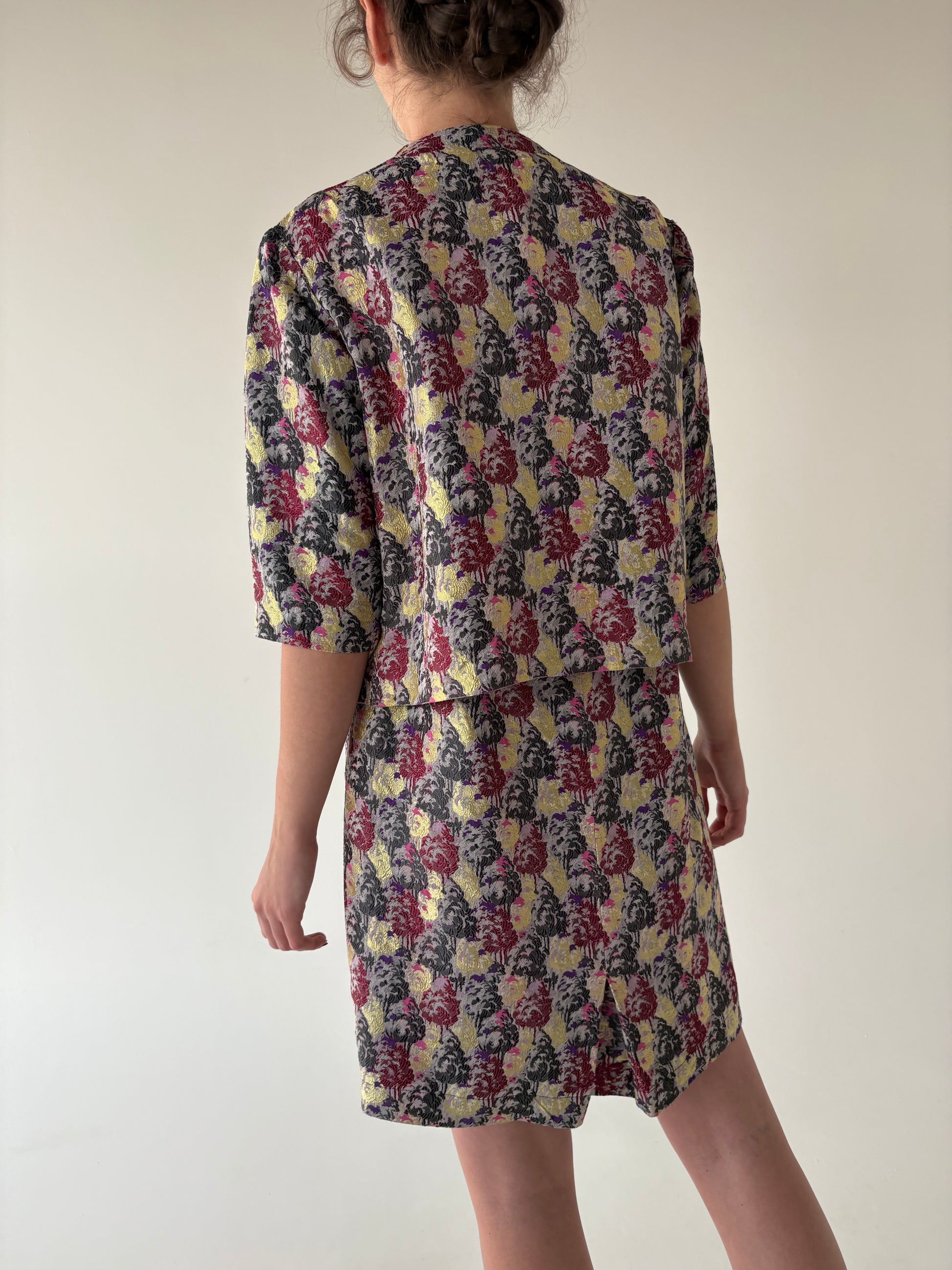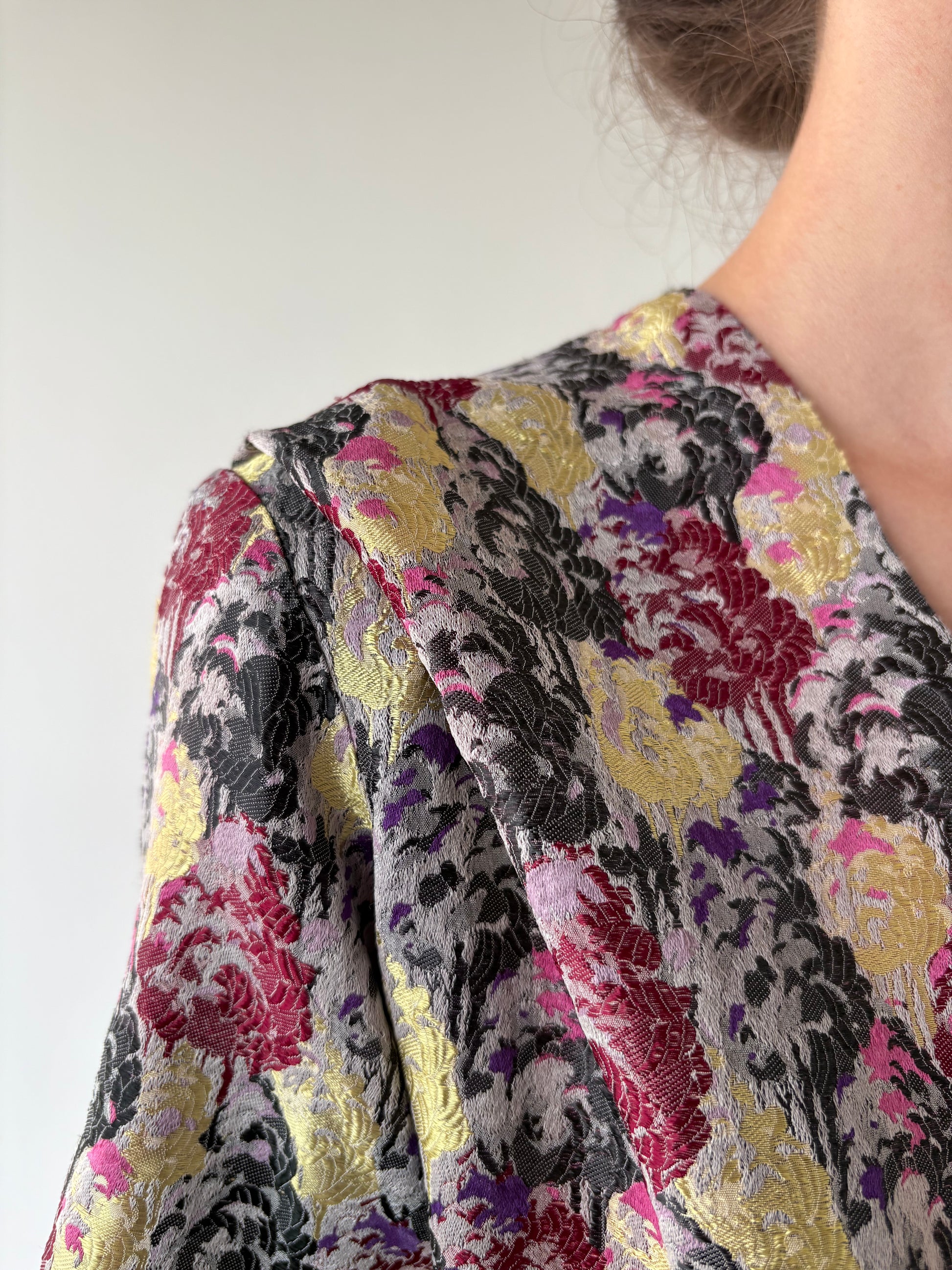 combinația de material luxos (jacquard cu fir auriu) cu croi minimalist este specifică tranziției dintre opulența anilor 80 spre minimalismul anilor 90, datând acest set la sfârșitul anilor 80