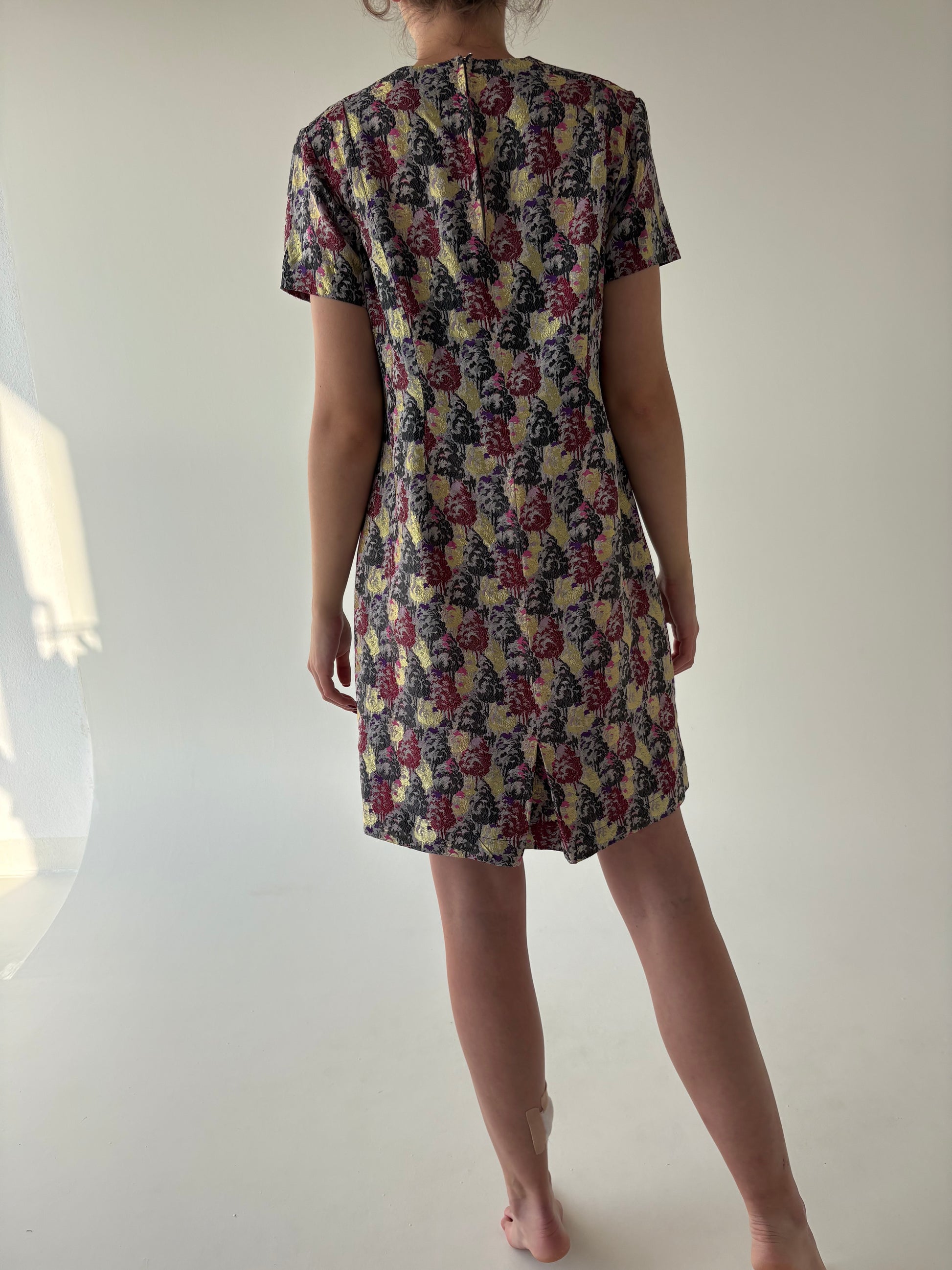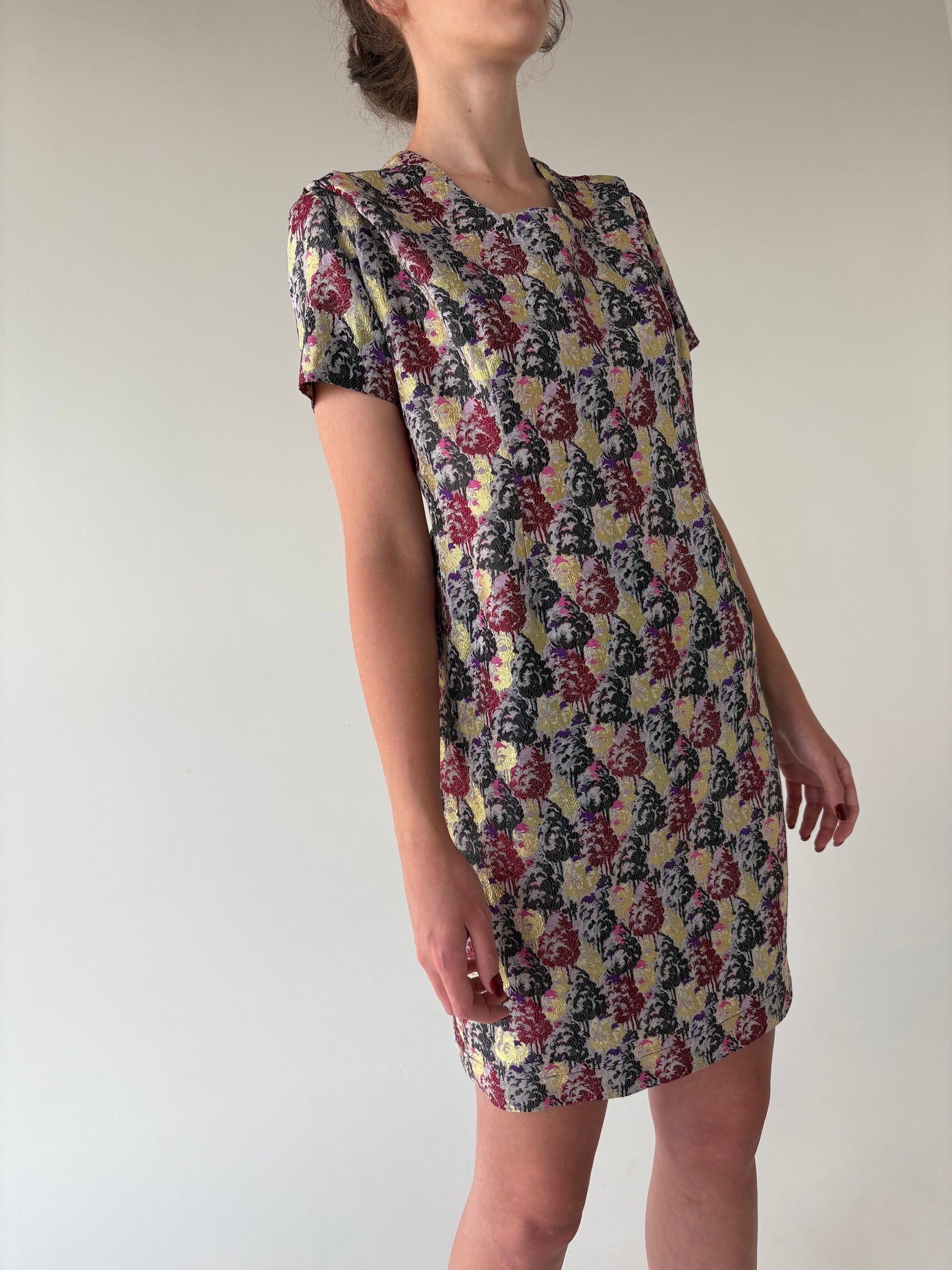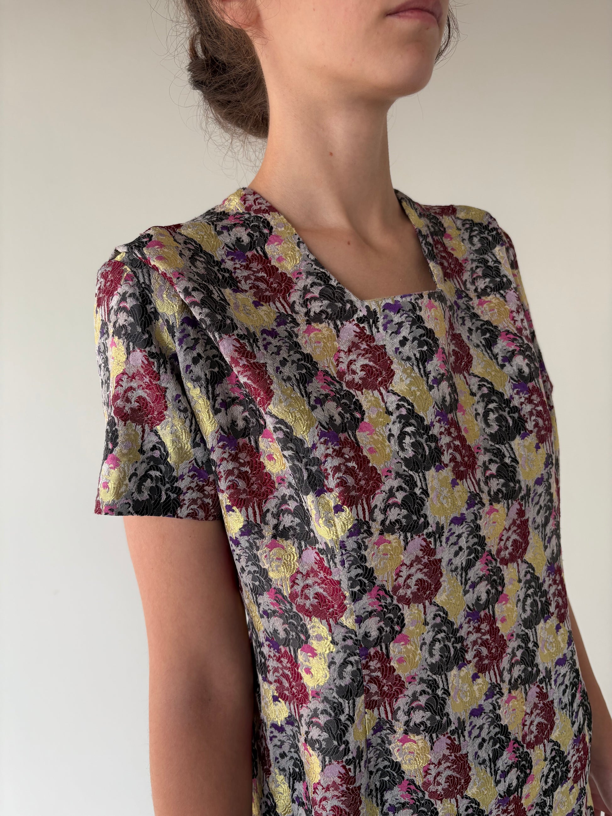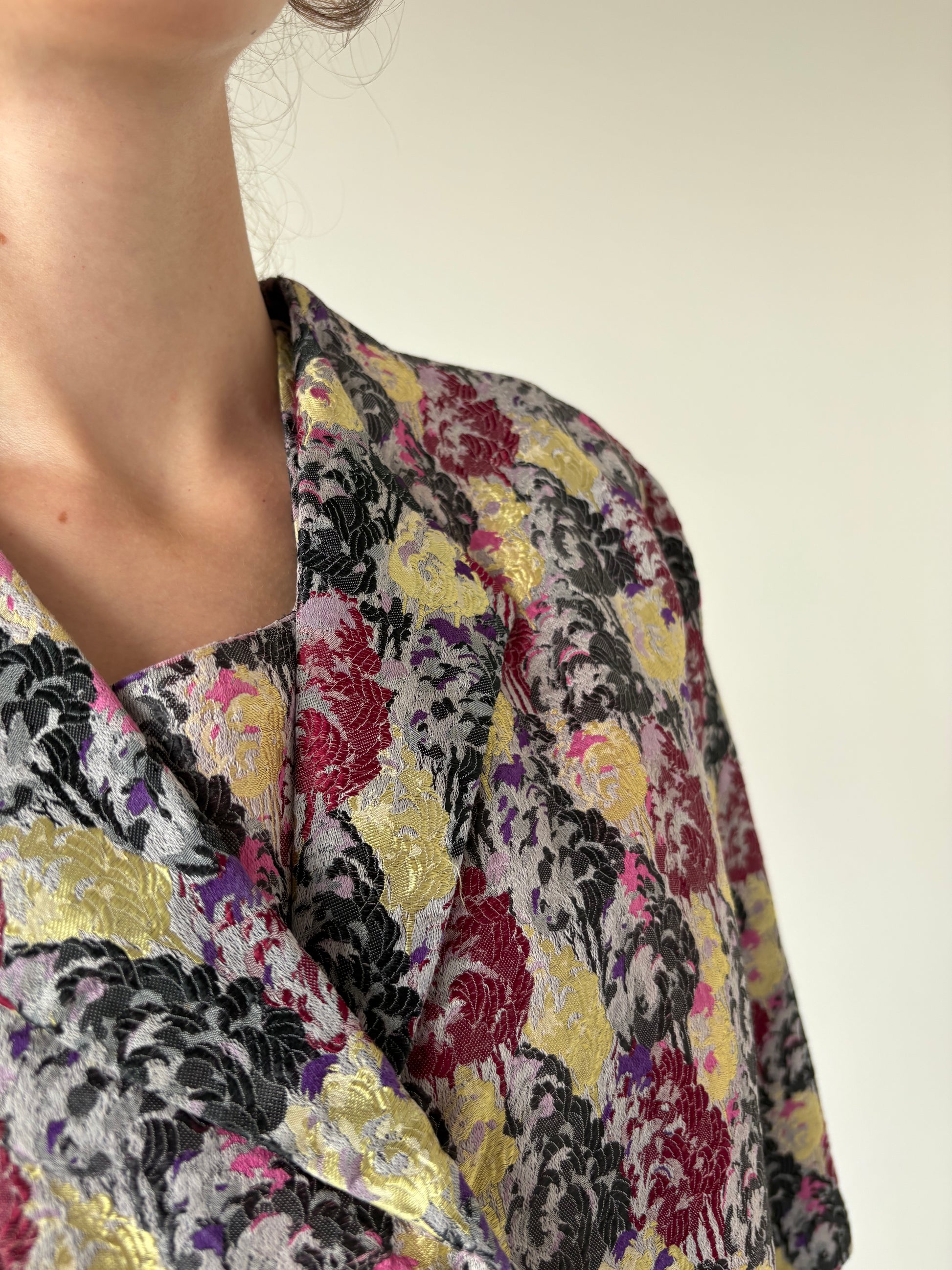 combinația de material luxos (jacquard cu fir auriu) cu croi minimalist este specifică tranziției dintre opulența anilor 80 spre minimalismul anilor 90, datând acest set la sfârșitul anilor 80