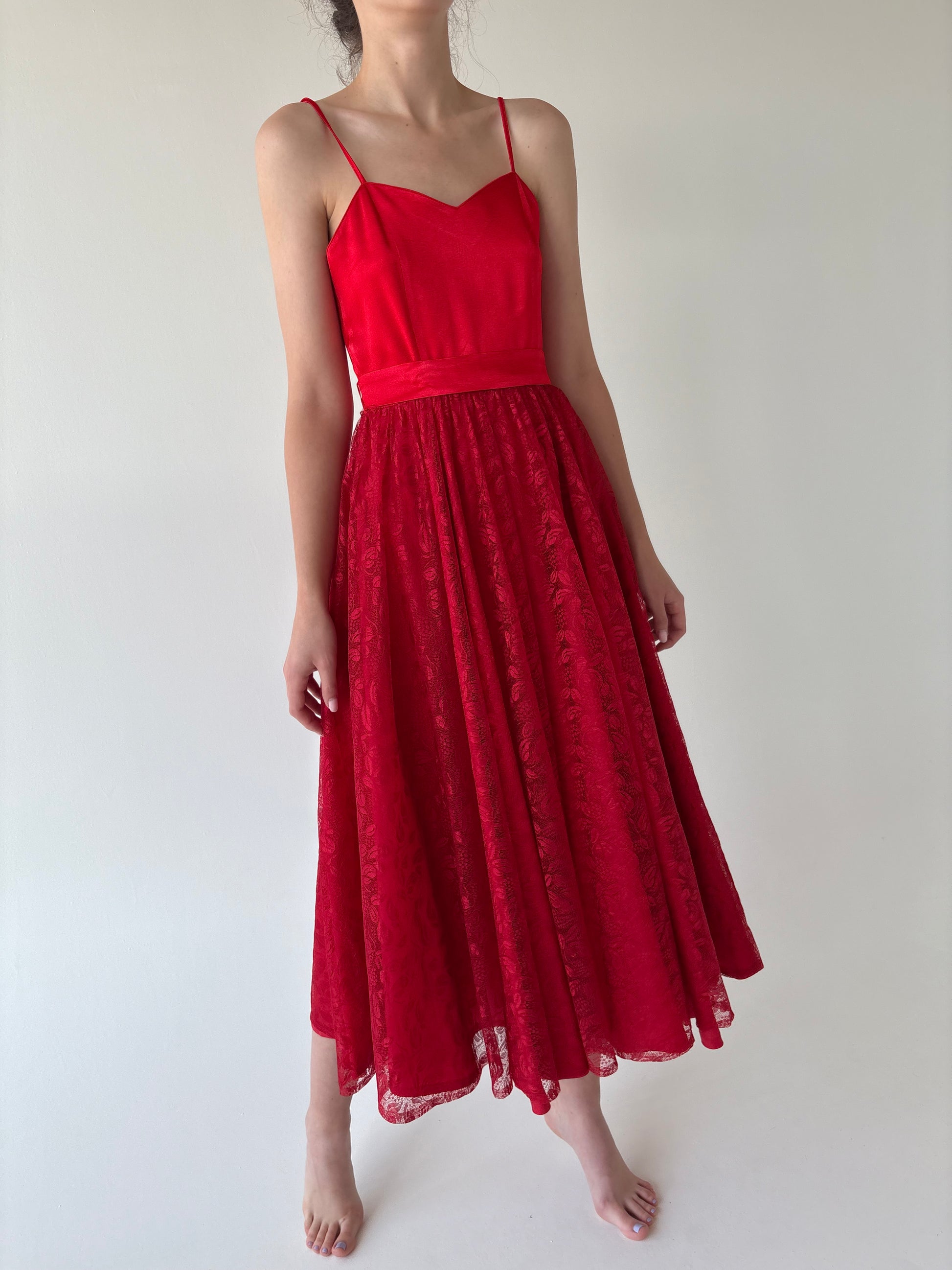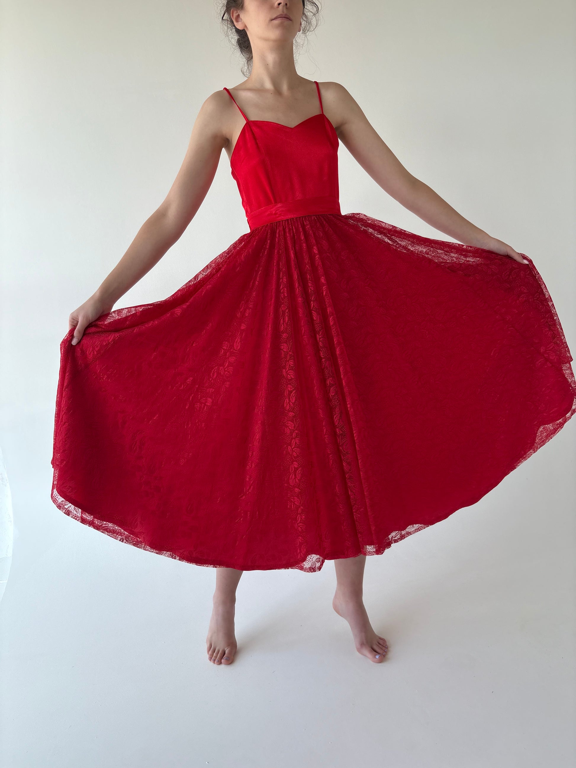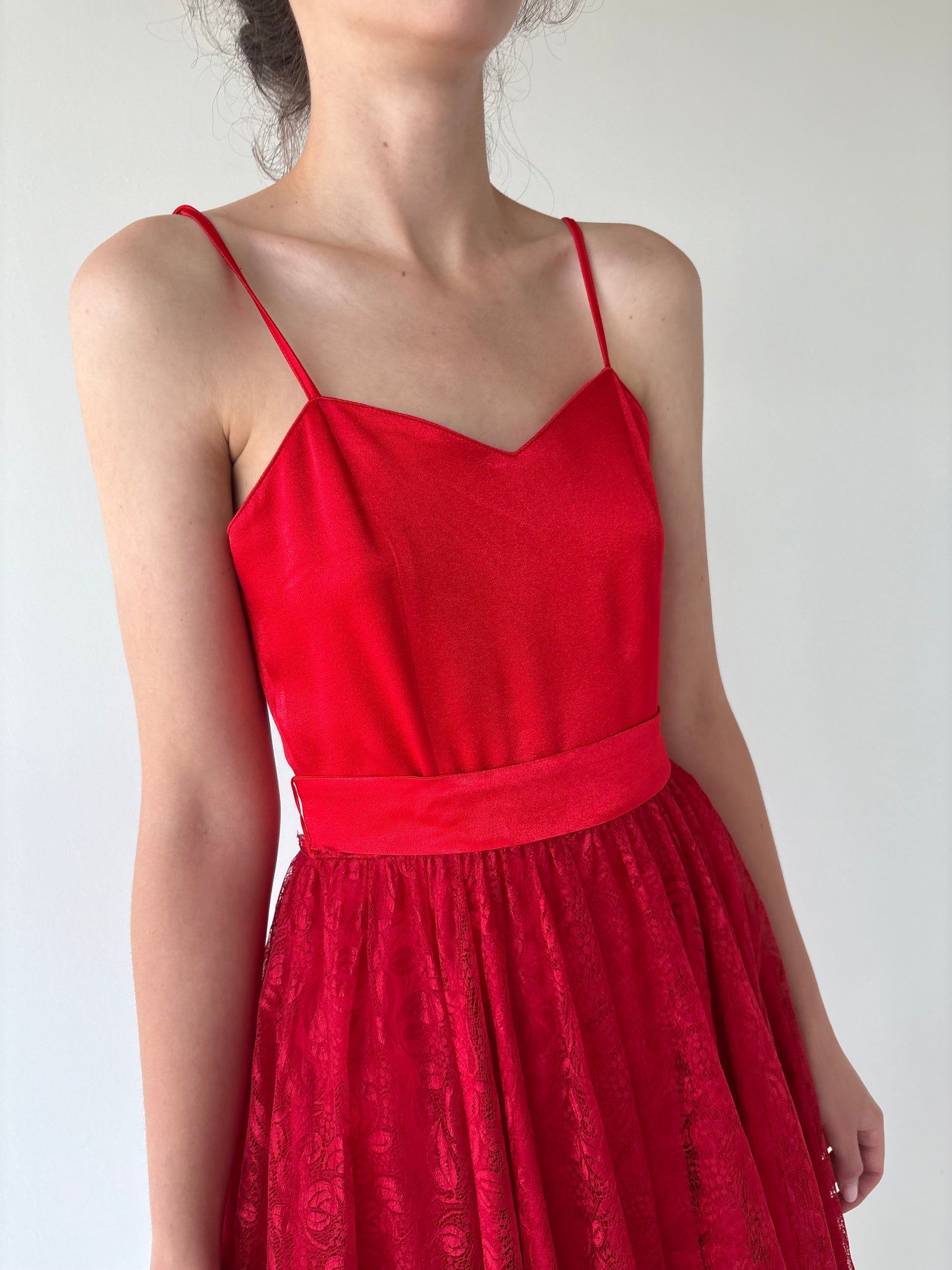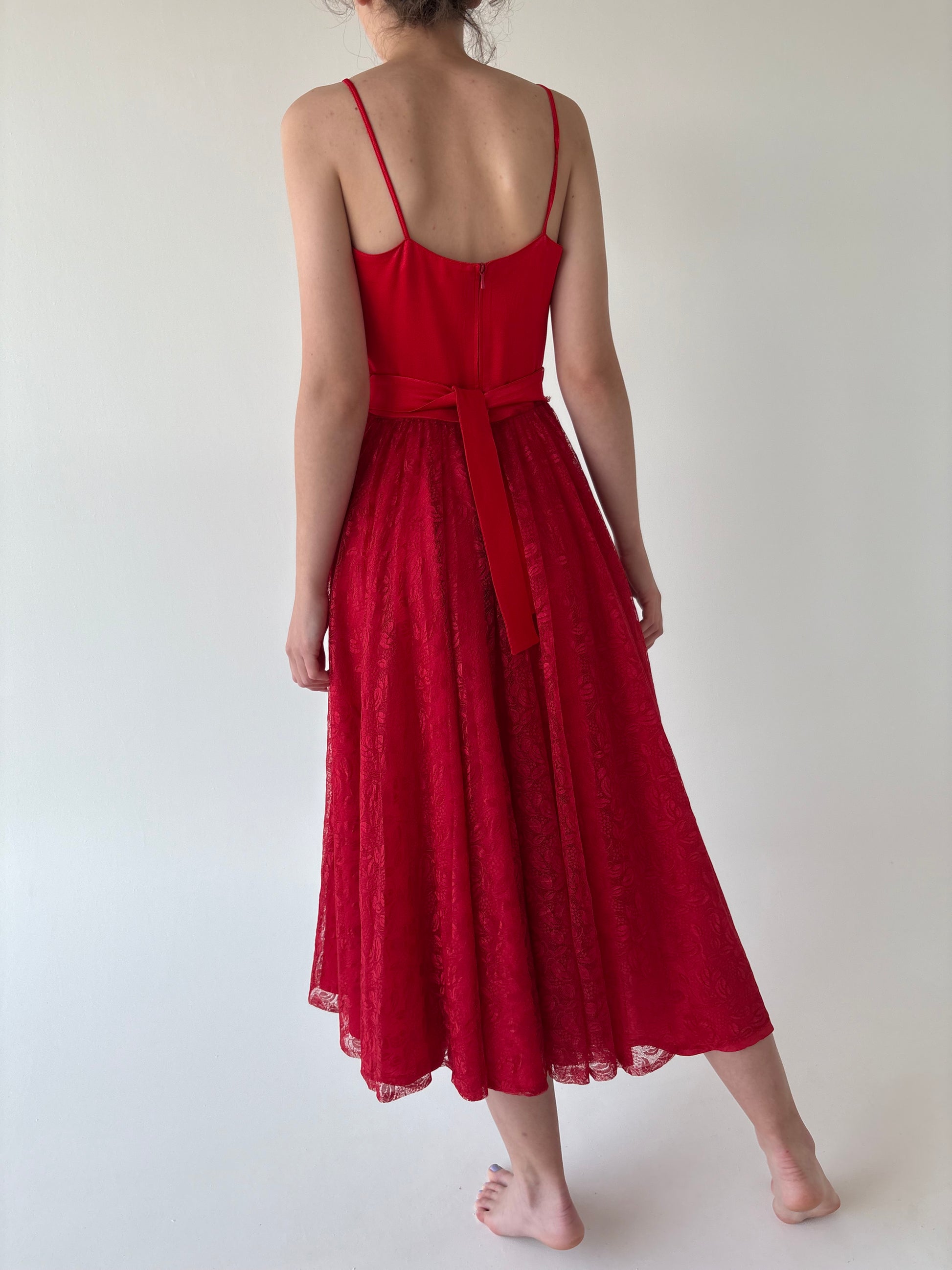 Această rochie relua un croi inspirat din anii ’50, reinterpretat în stilul romantic al anilor ’80 — corsaj simplu cu bretele subțiri, talie ultra înaltă accentuată și fustă extrem de amplă, midi, din dantelă.
