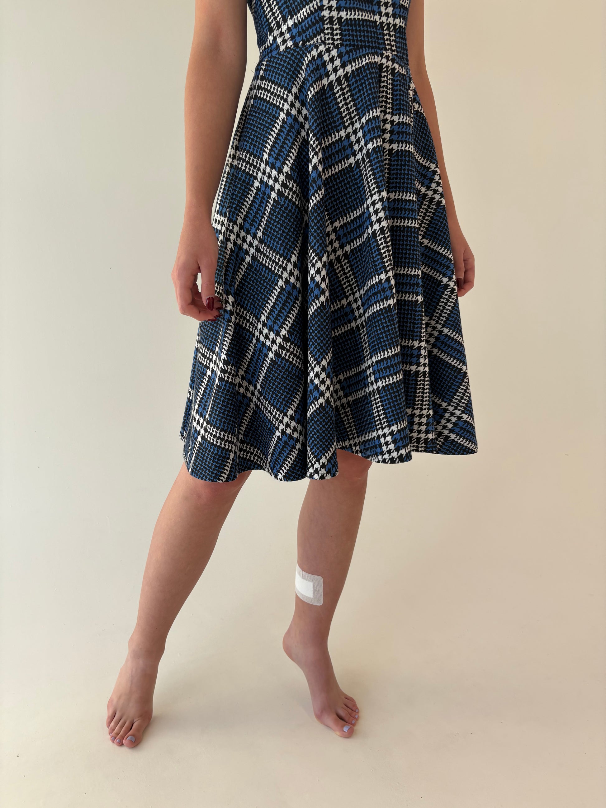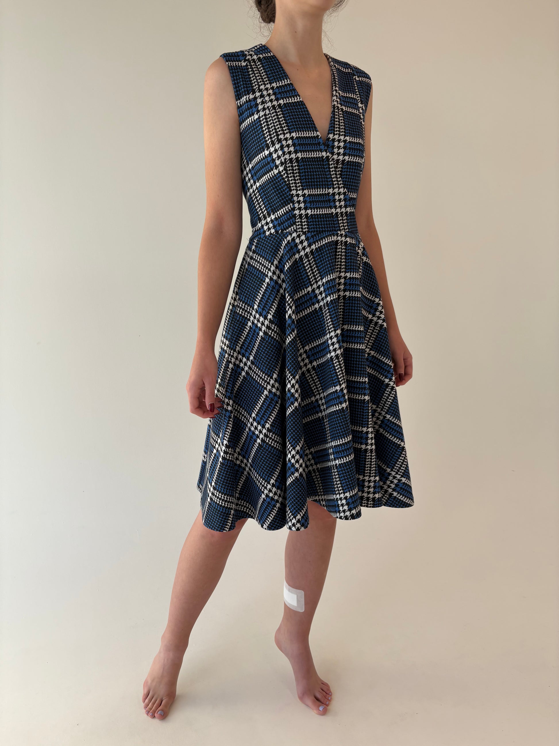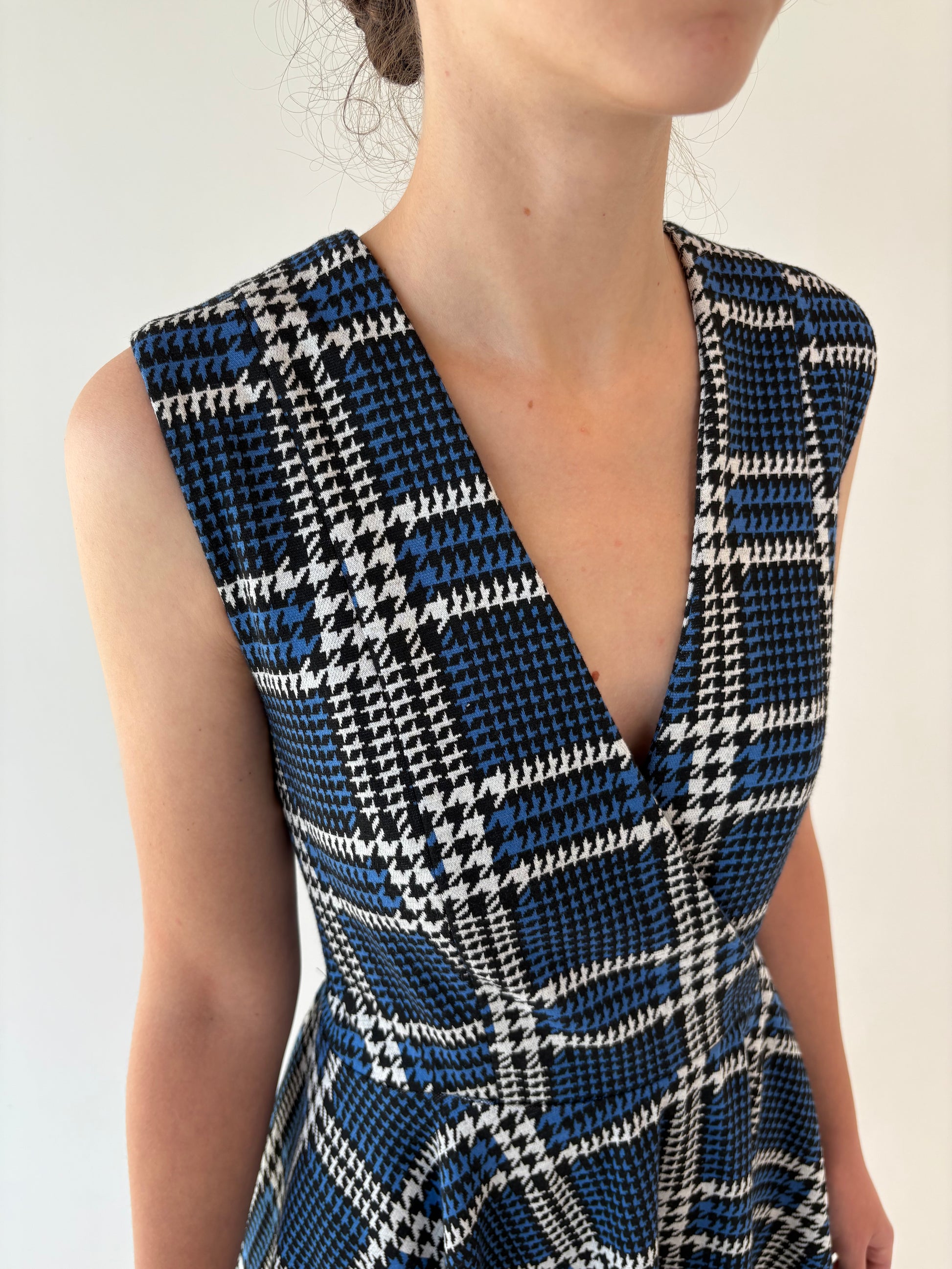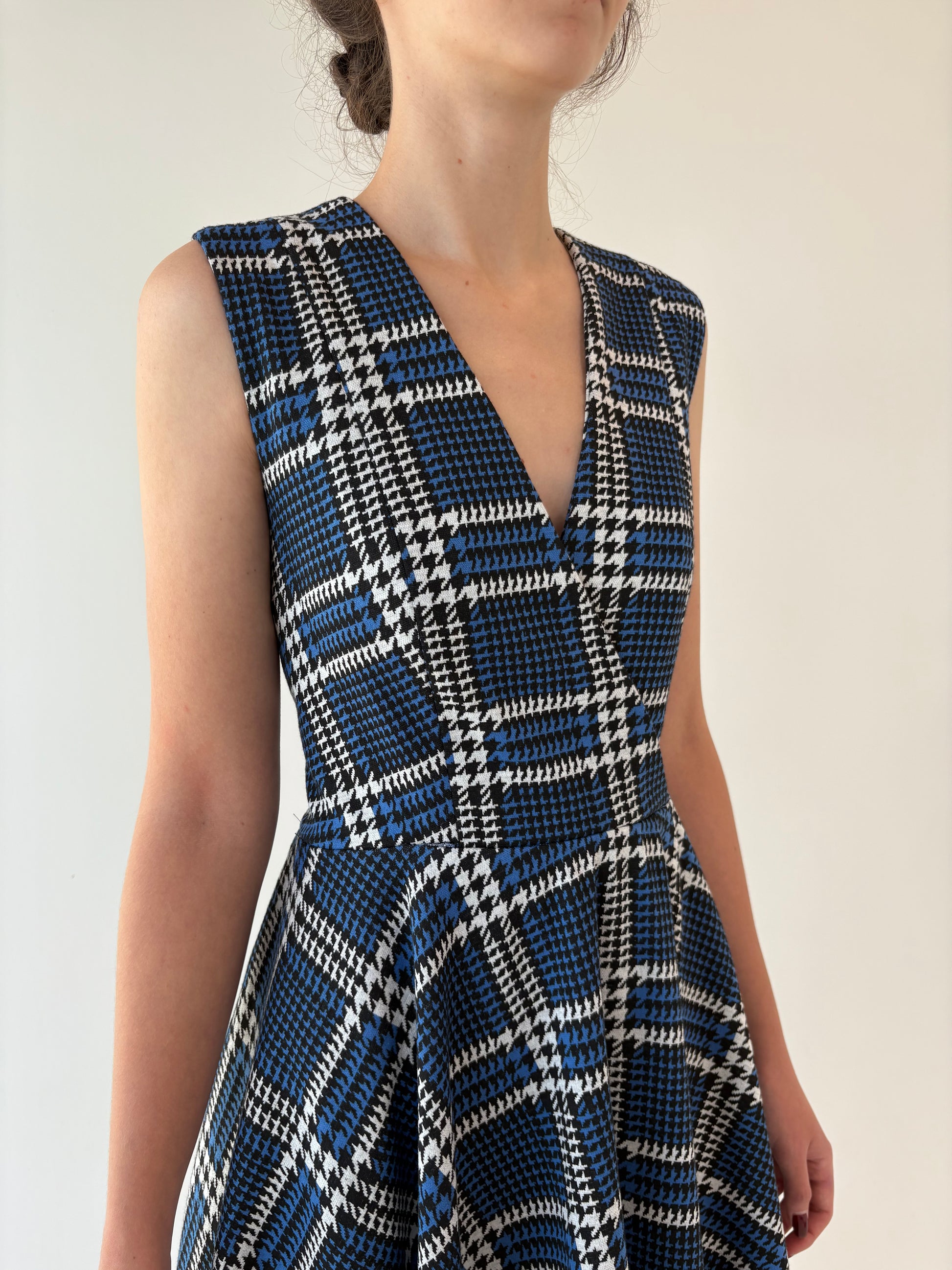 Rochie în carouri pied du coq ultra amplă cu talie marcată din jerse greu