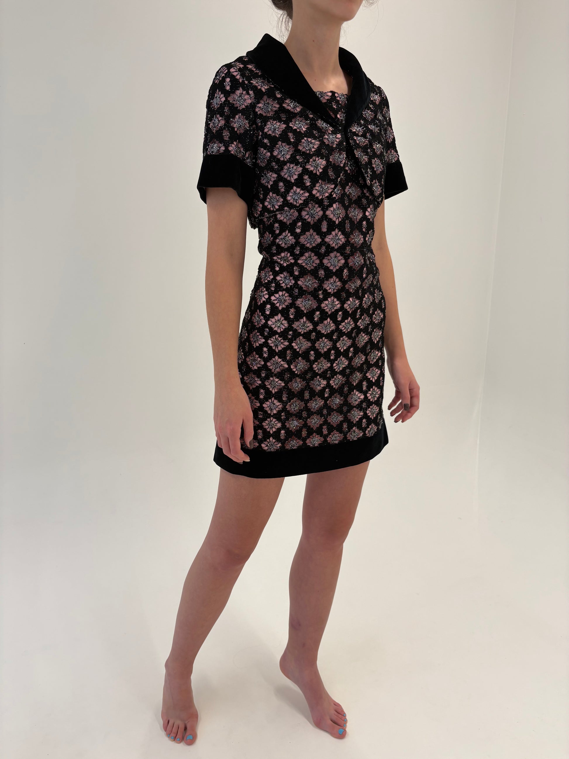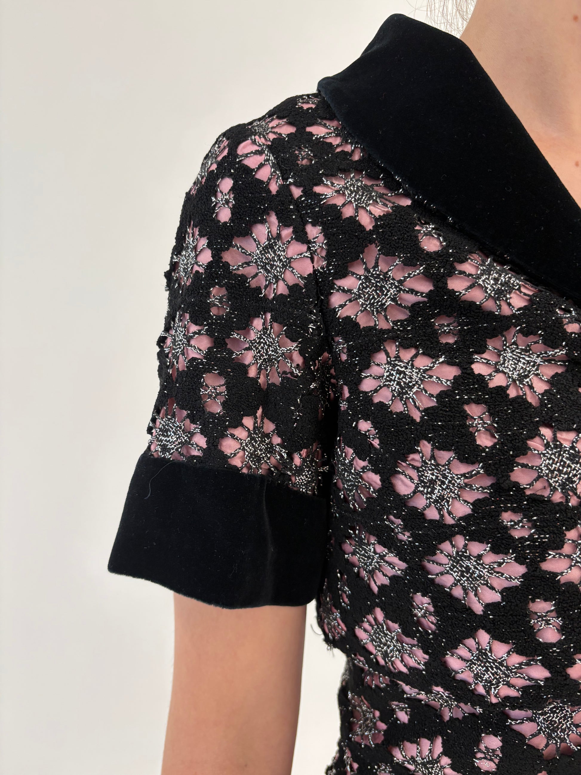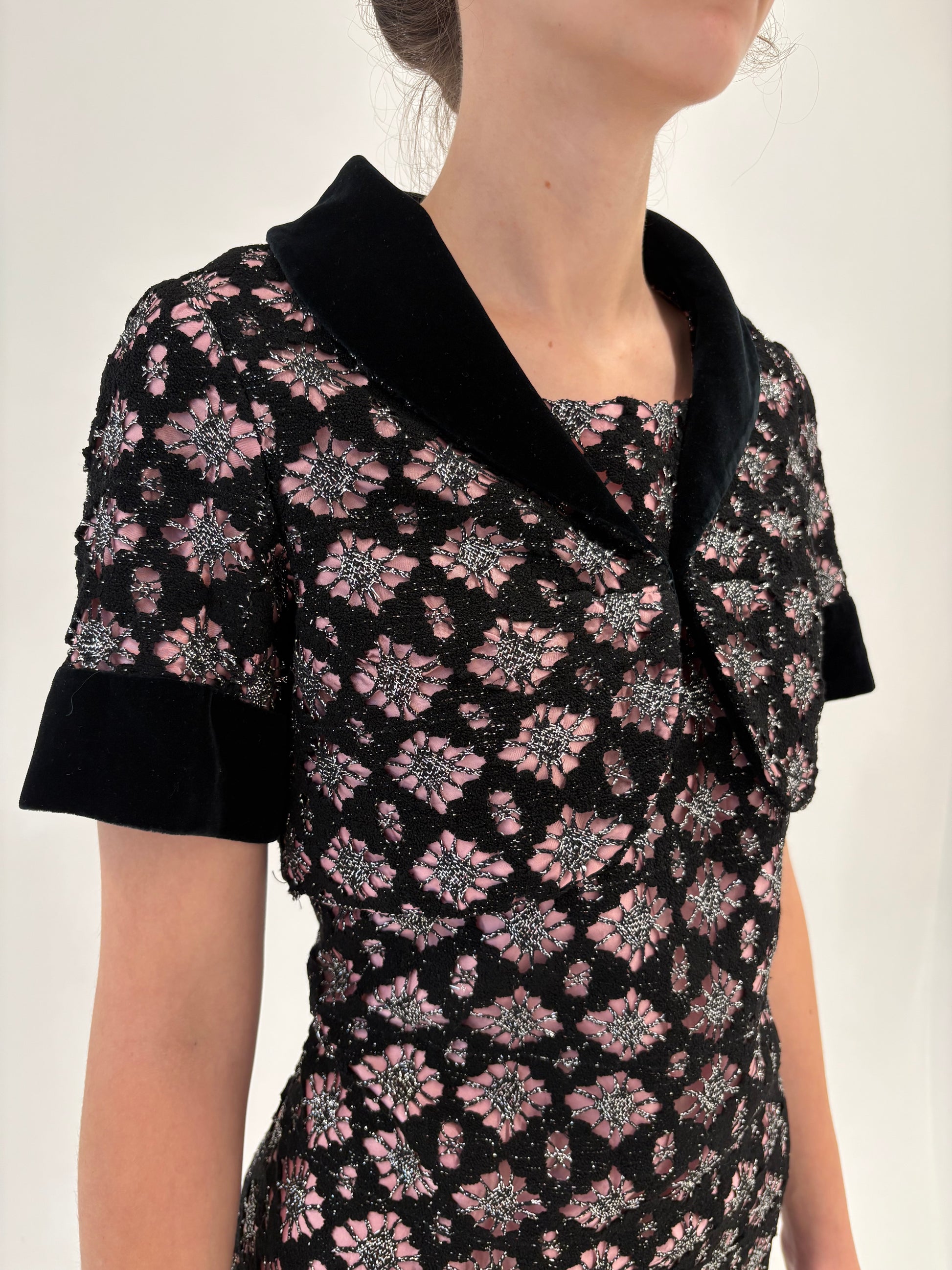 boleroul scurt cu mâneci trei sferturi și guler de catifea are un aer „mod” londonez, inspirat de costumele-set purtate de tinerele din Swinging London