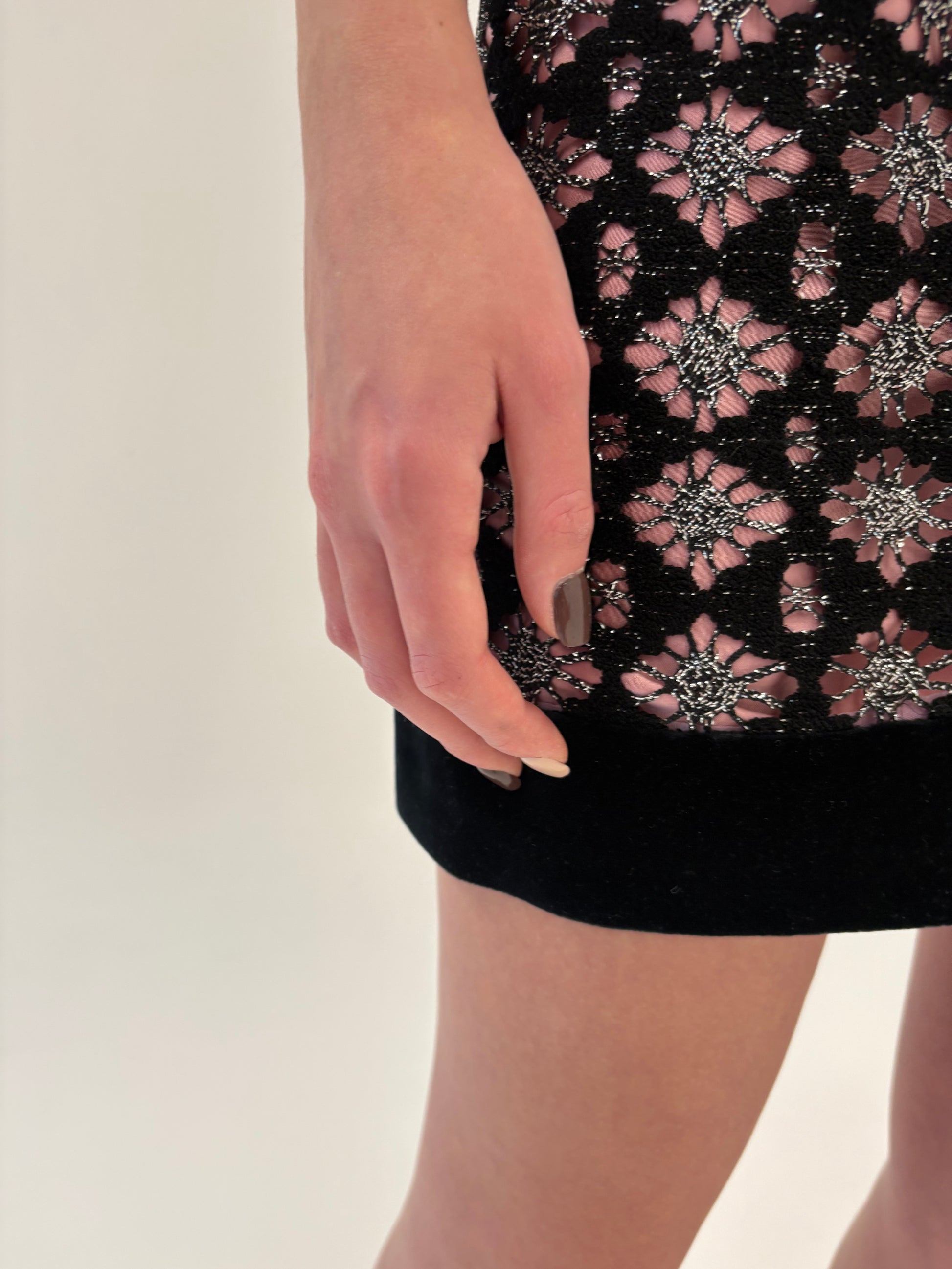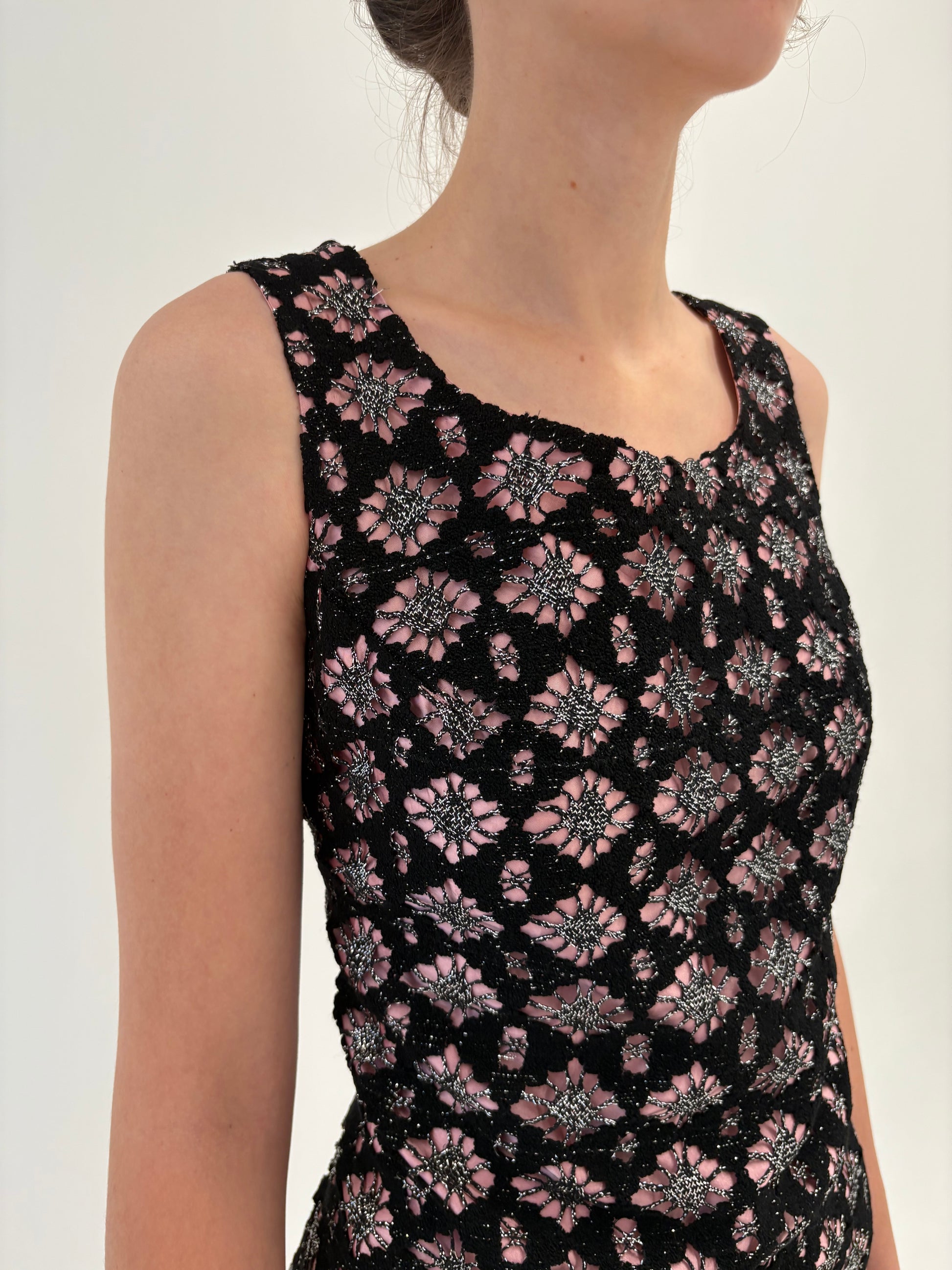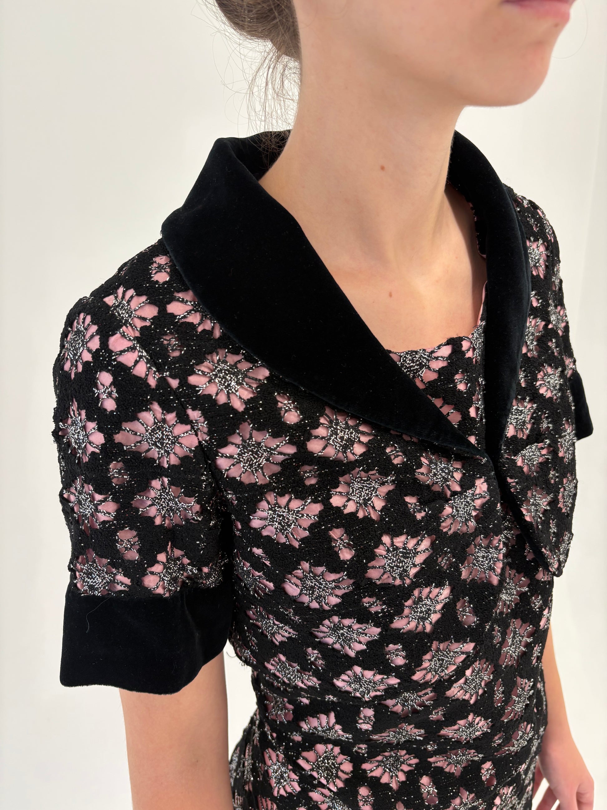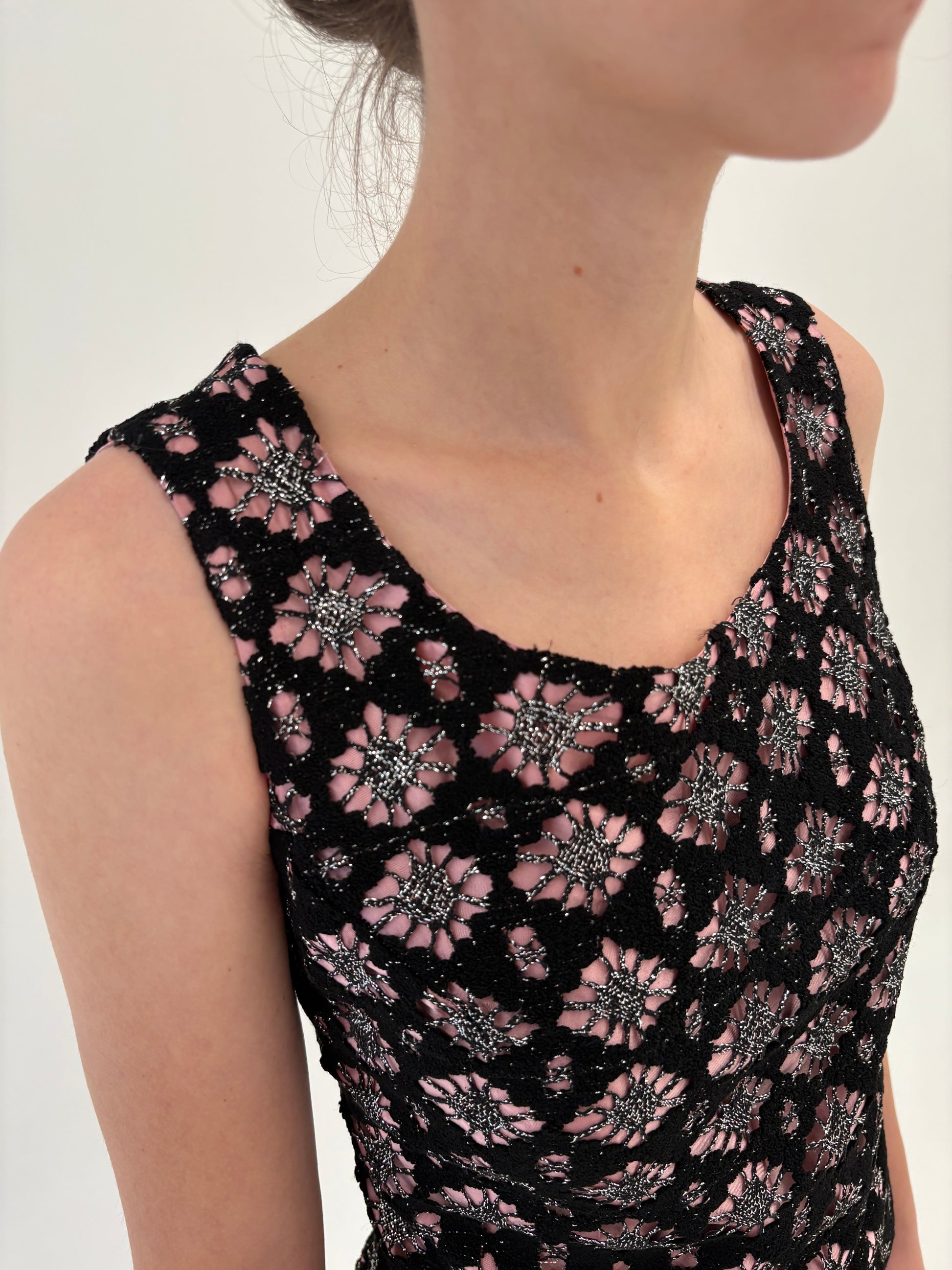 dantela geometrică neagră cu lana si inserții metalice argintii pe fond roz pudrat e un material specific perioadei