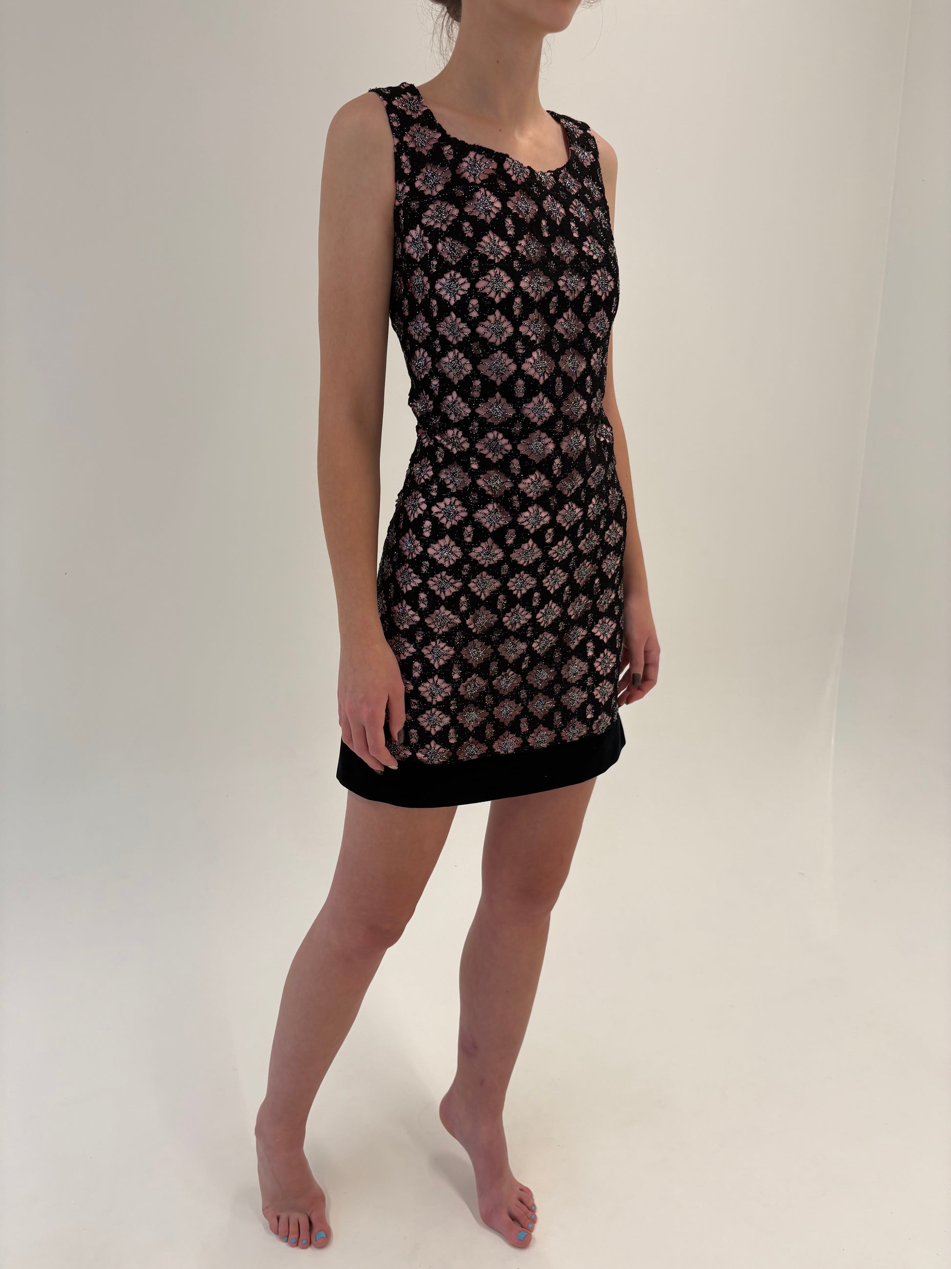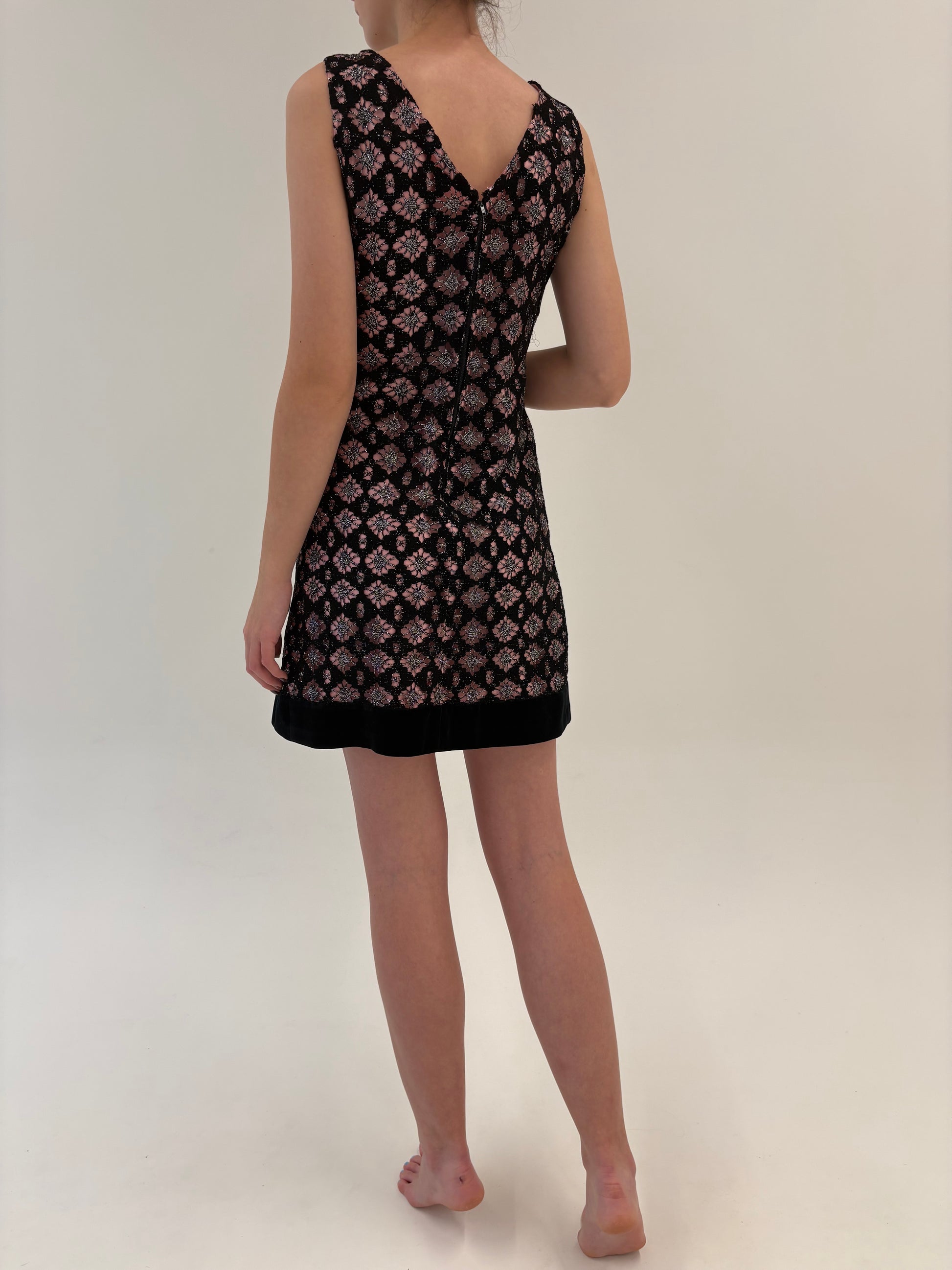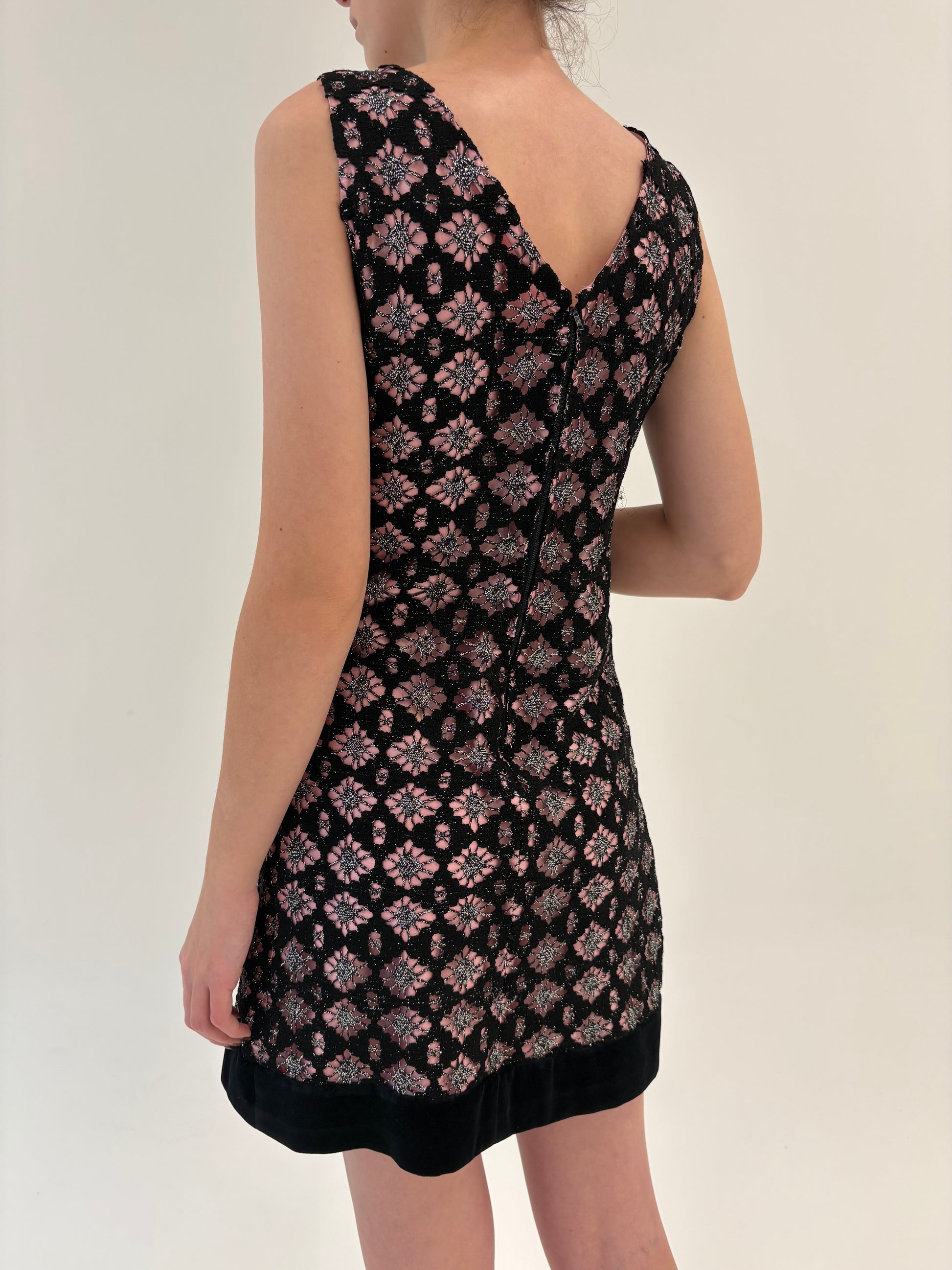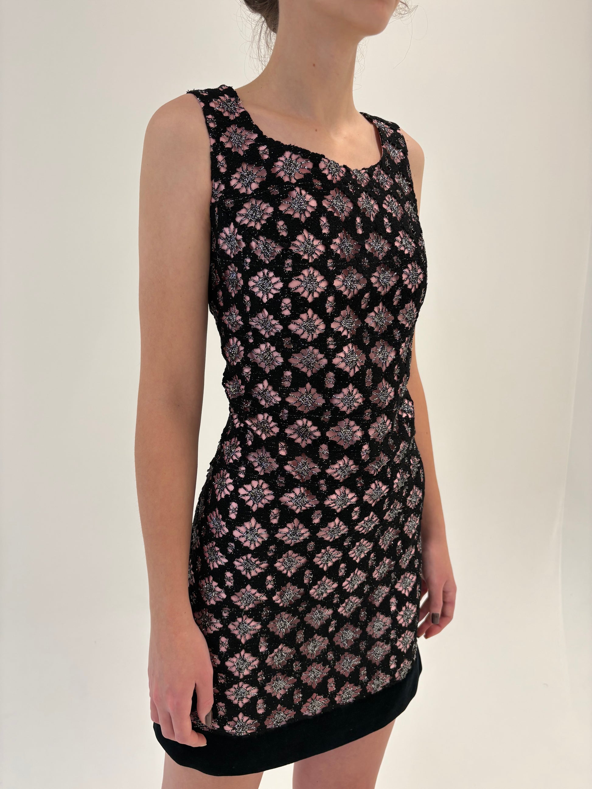dantela geometrică neagră cu lana si inserții metalice argintii pe fond roz pudrat e un material specific perioadei