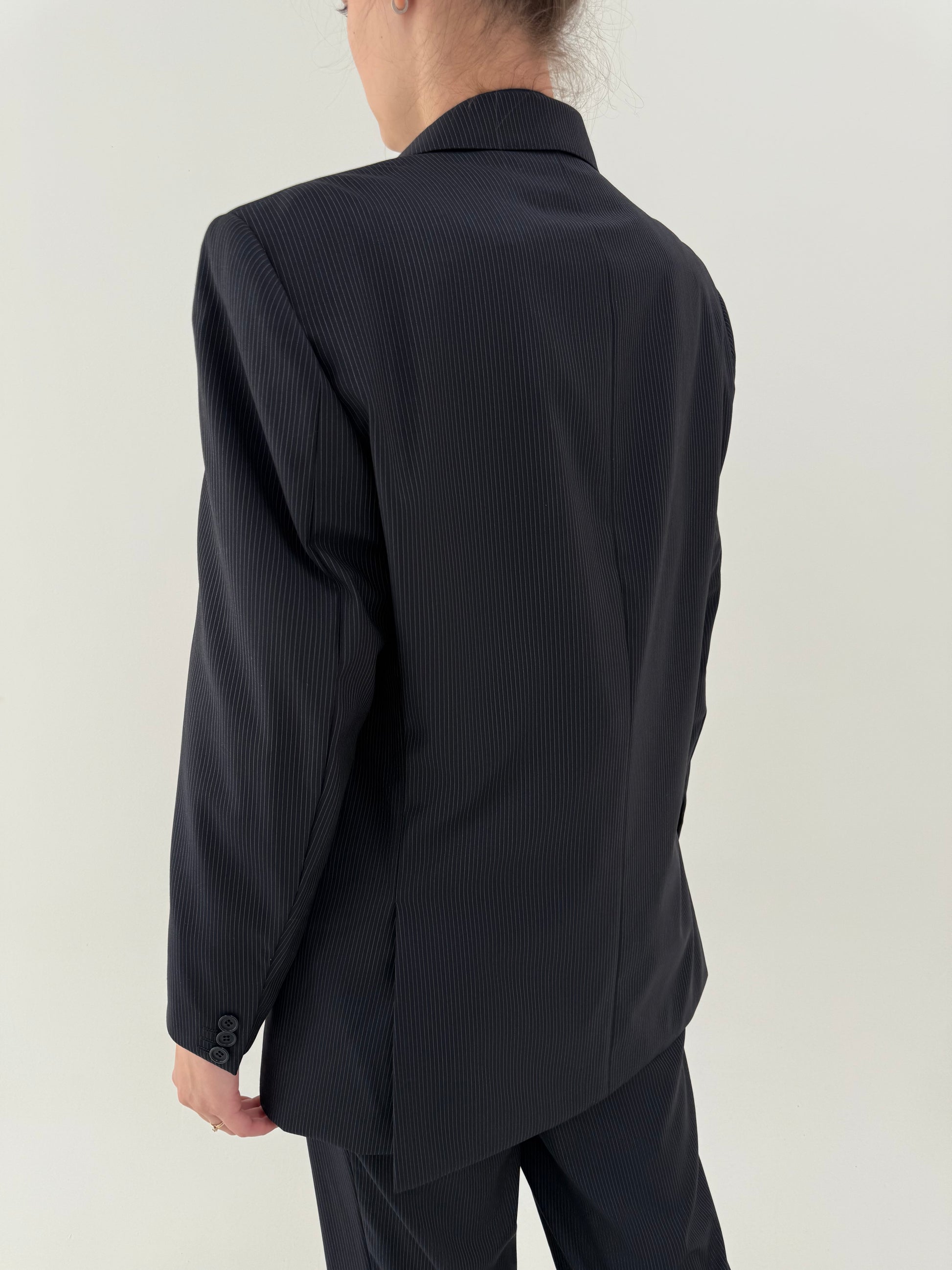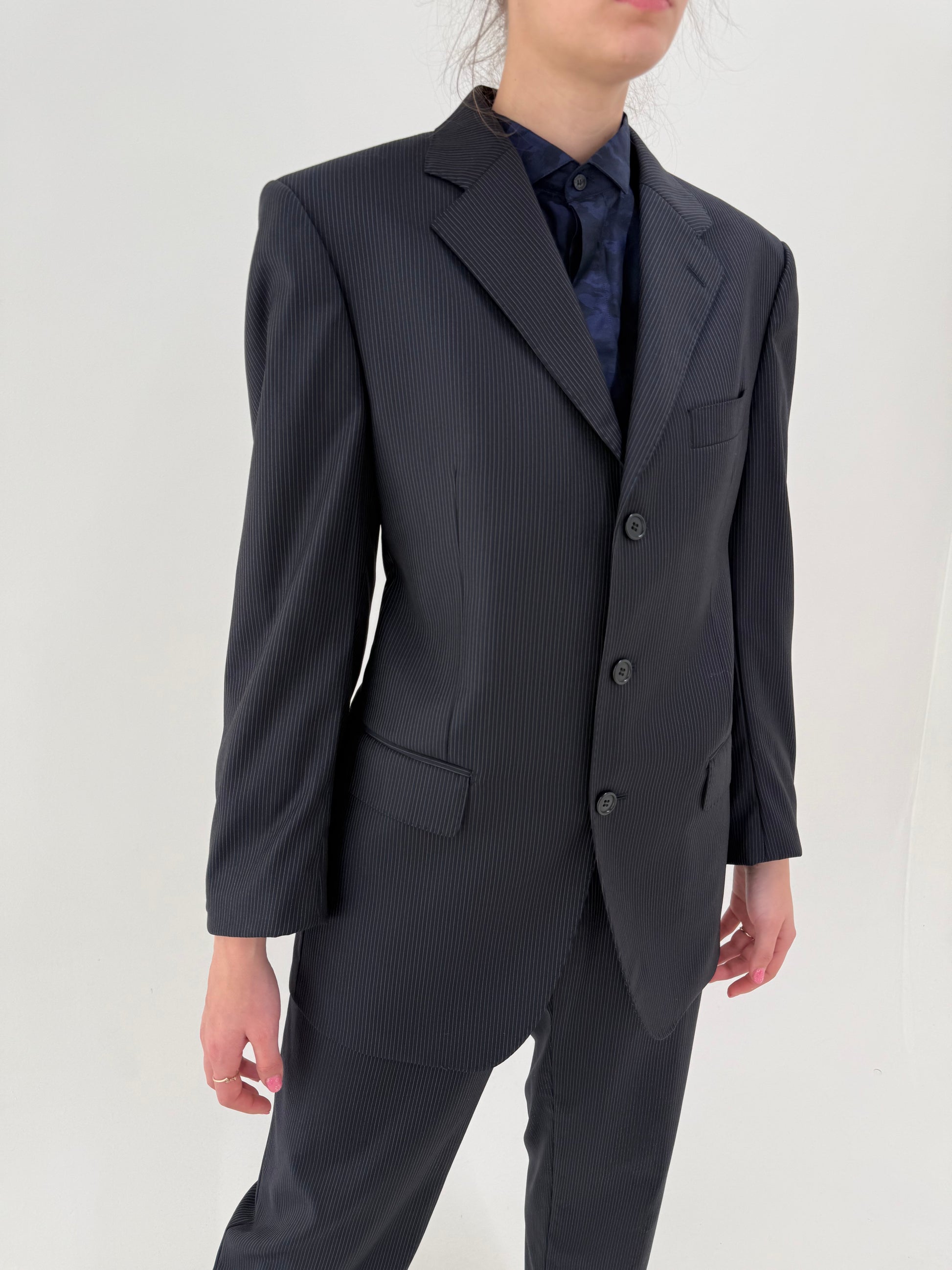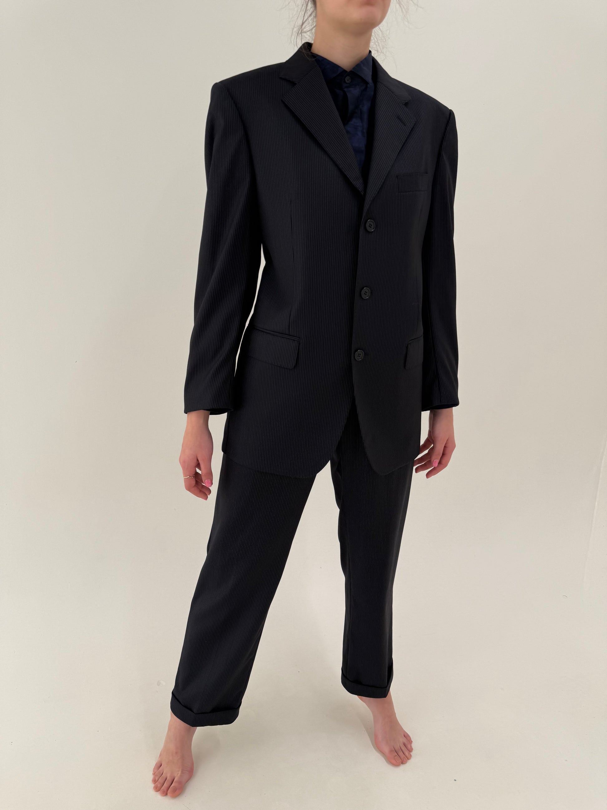 Costum negru din lana extrem de subțire Loro Piana tasmaniana cu dungi fine verticale