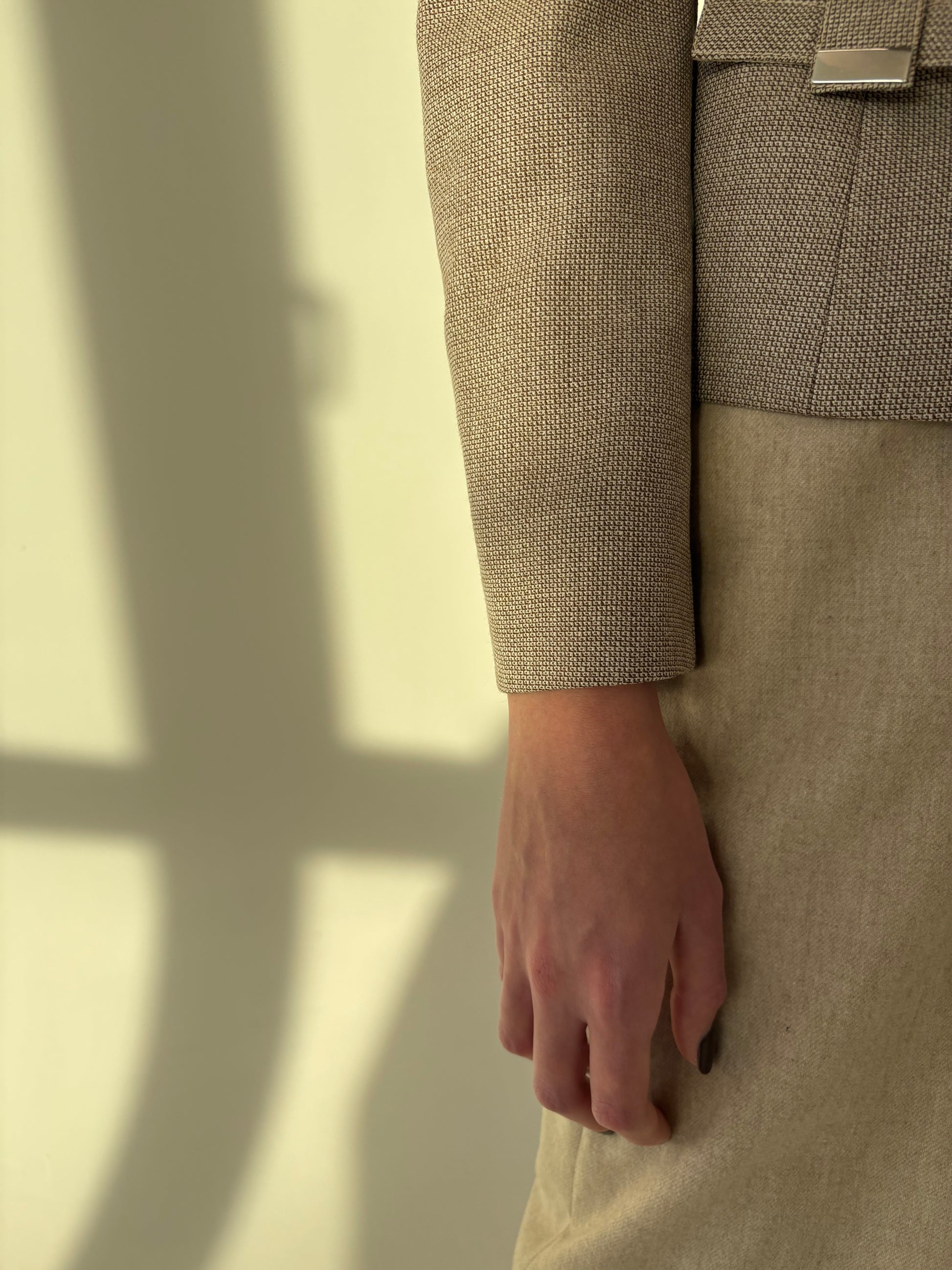 Țesătura din 85% lână virgină și 15% mătase naturală are o textură fină, densă, în nuanță taupe deschis – foarte caracteristică pentru materiale luxury din acea perioadă, folosite la costume de oraș