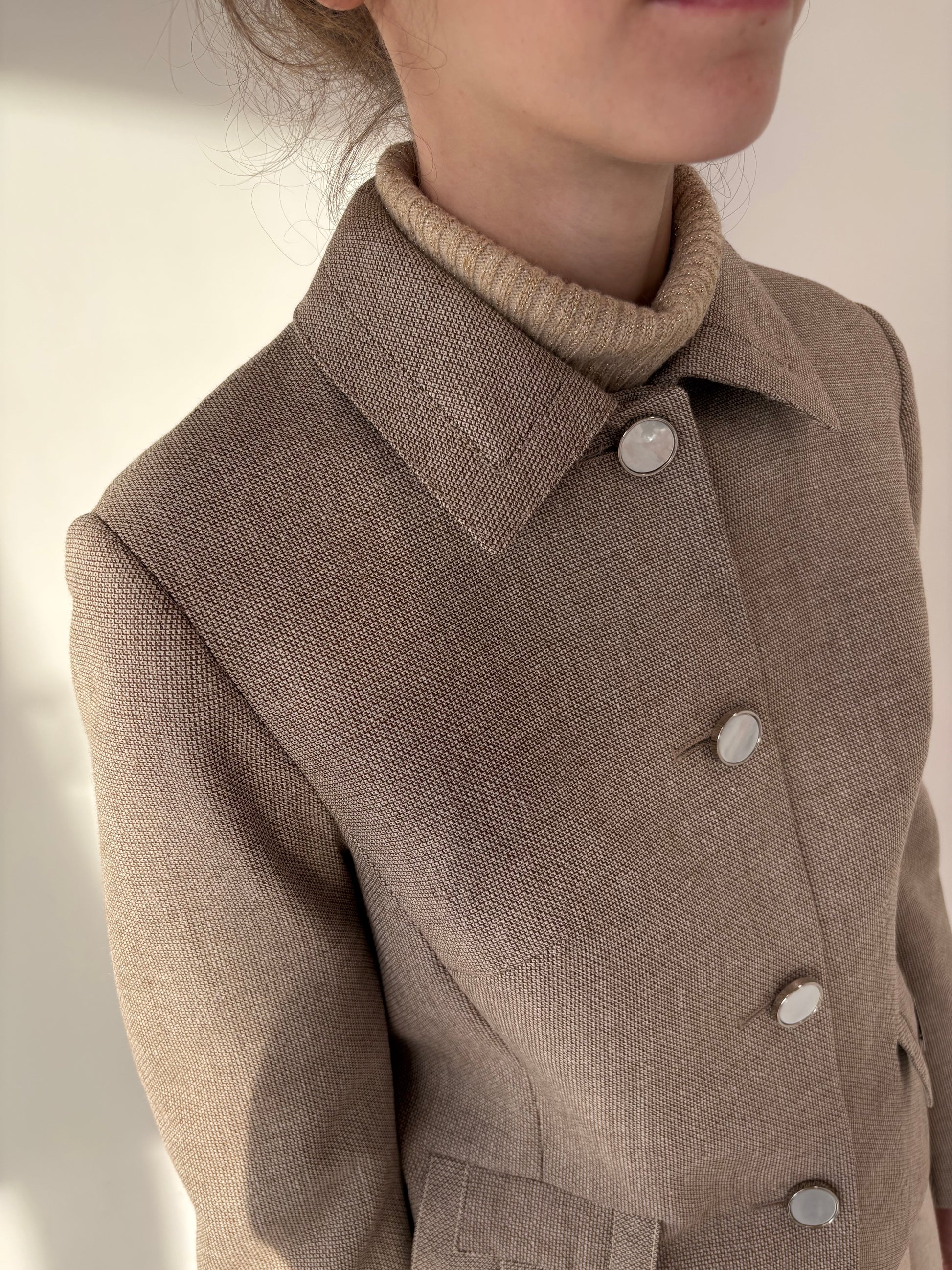 Buzunarele cu clapă lată și detaliu metalic decorativ sunt un indiciu distinct de anii 1970-1973, când astfel de accente metalice subtile se foloseau la sacouri de zi sau costume de damă elegante