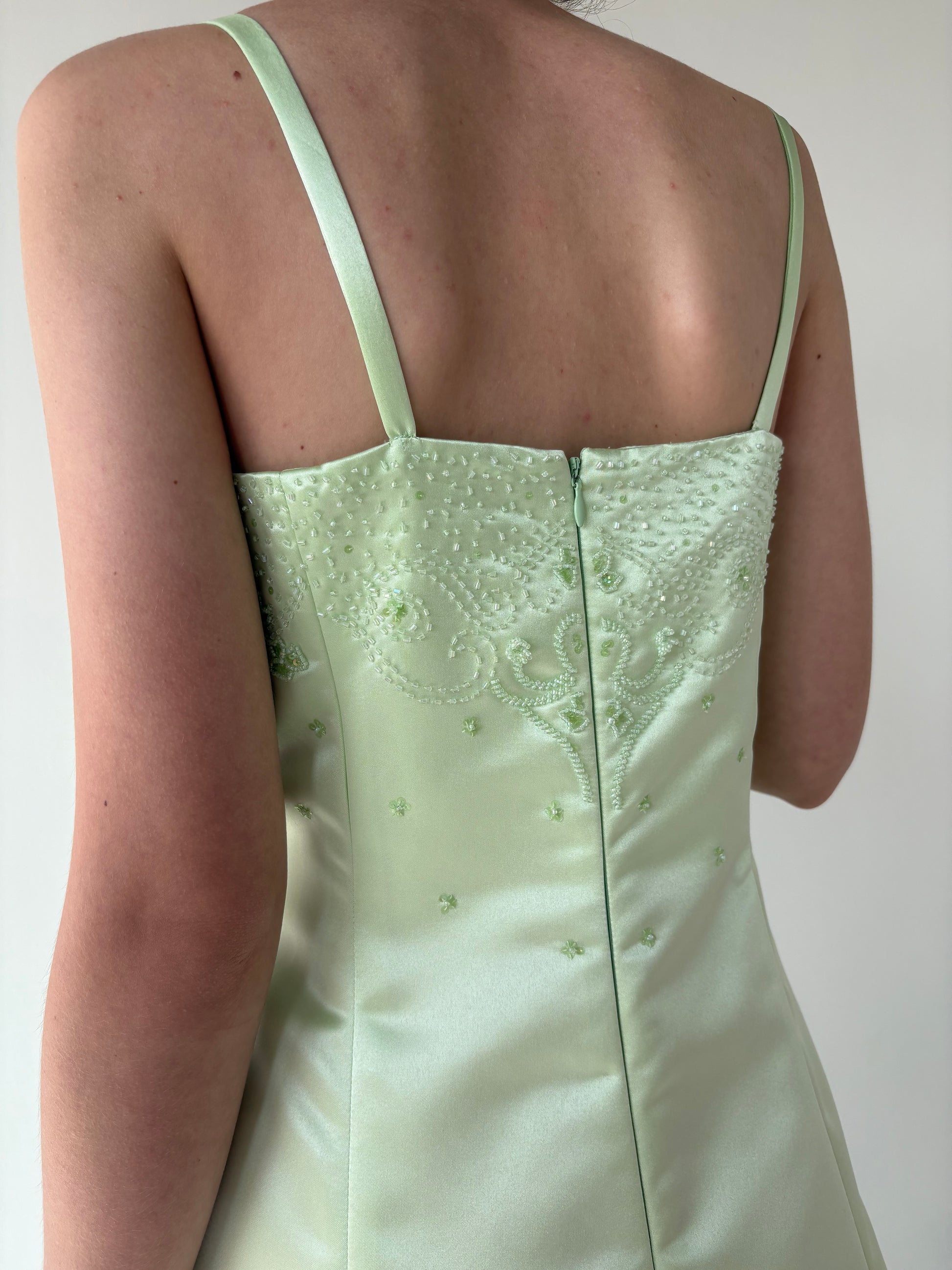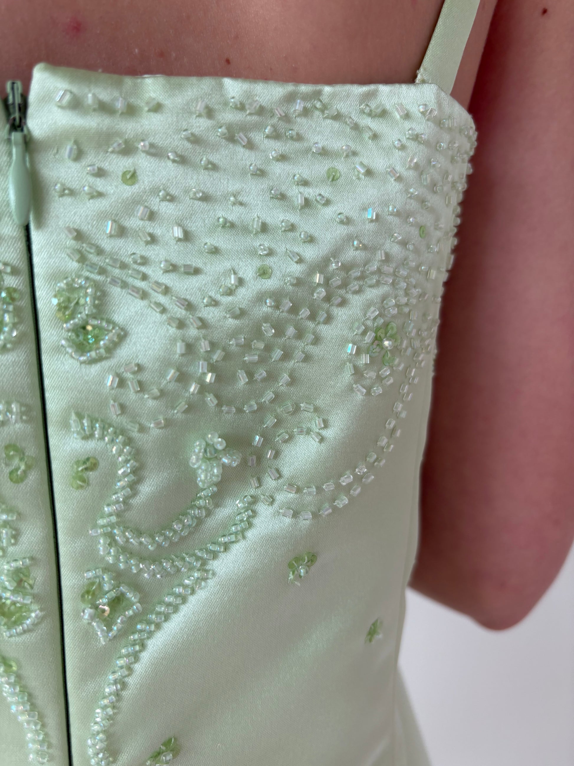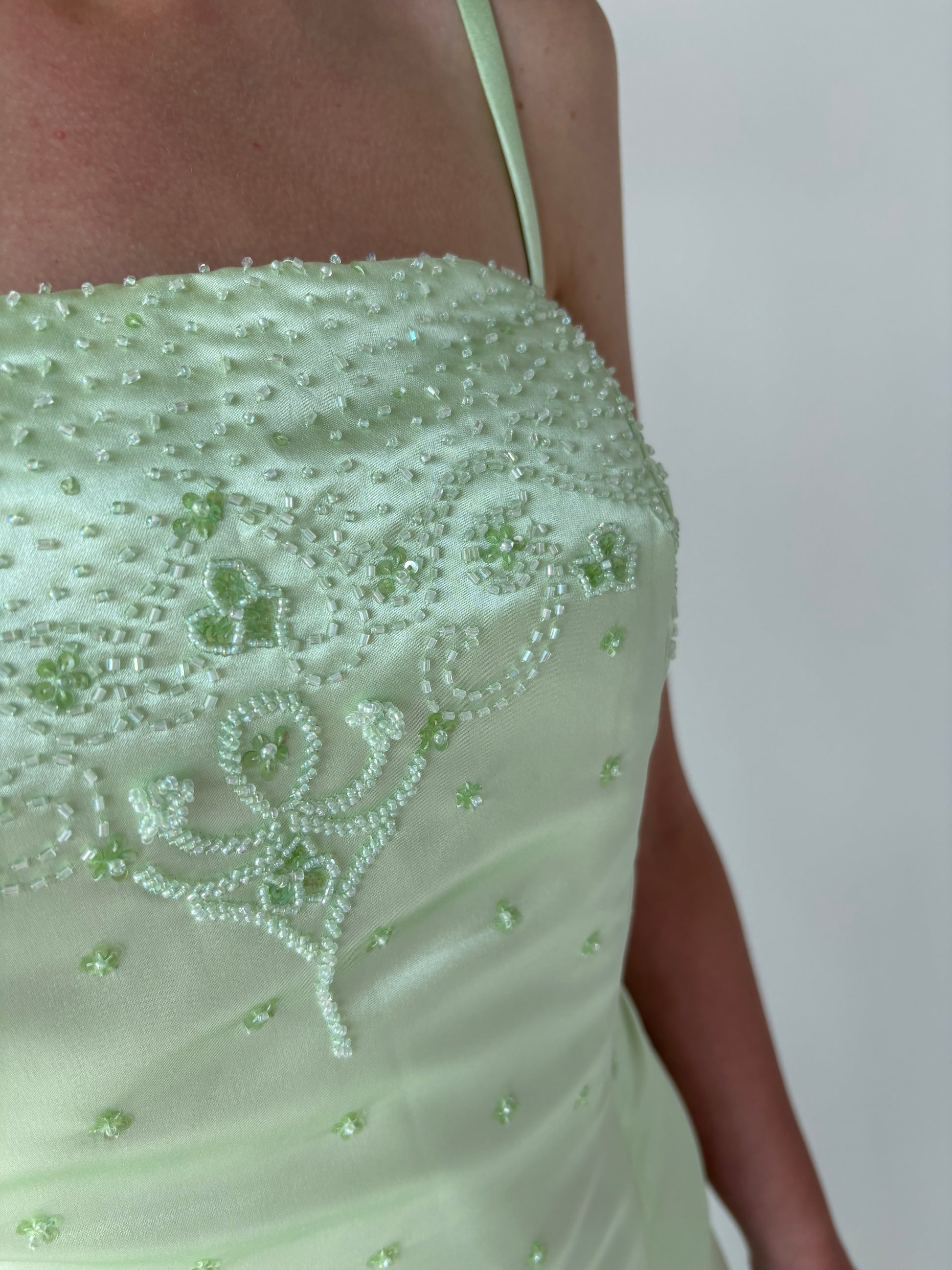 Rochie vintage verde crud cu corset ascuns și aplicații manuale delicate