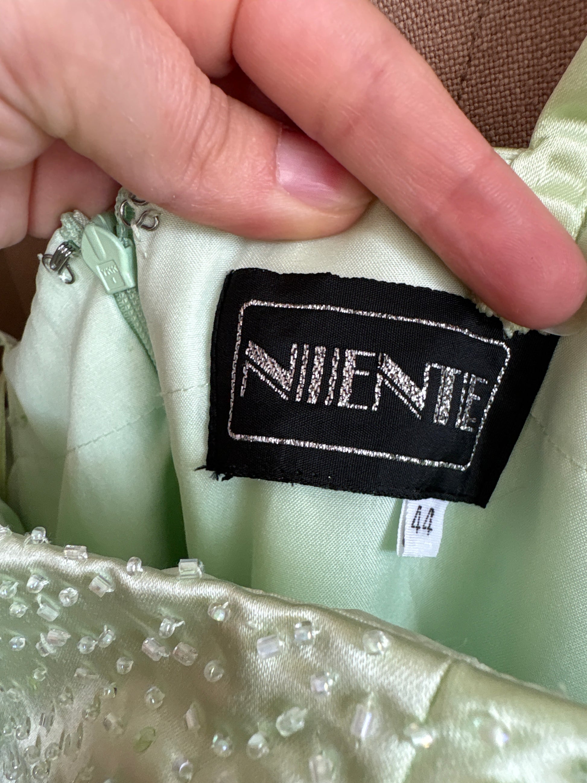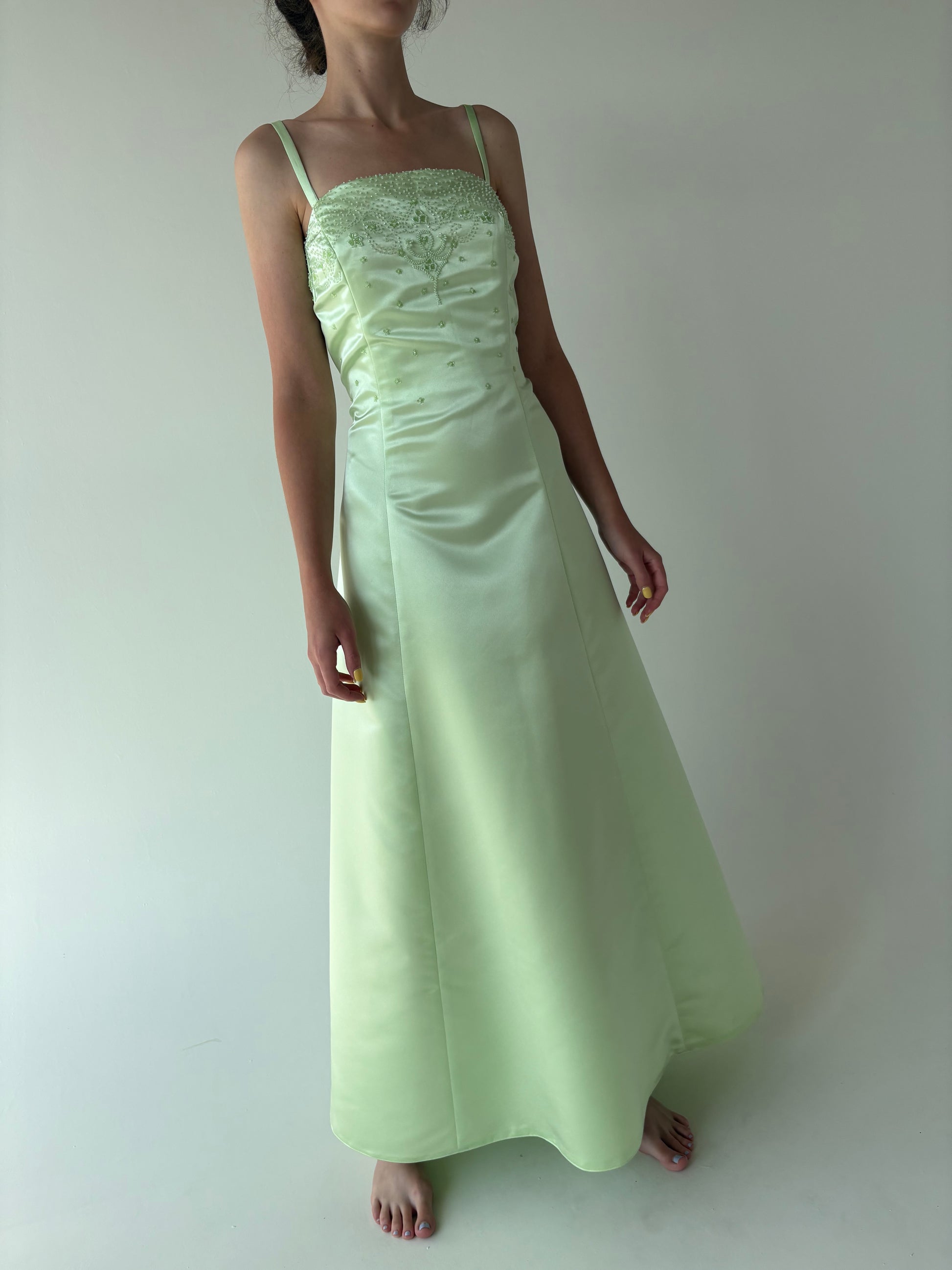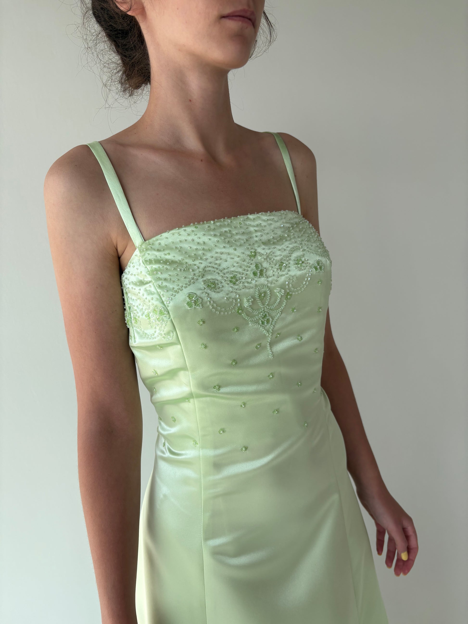 Rochie vintage verde crud cu corset ascuns și aplicații manuale delicate