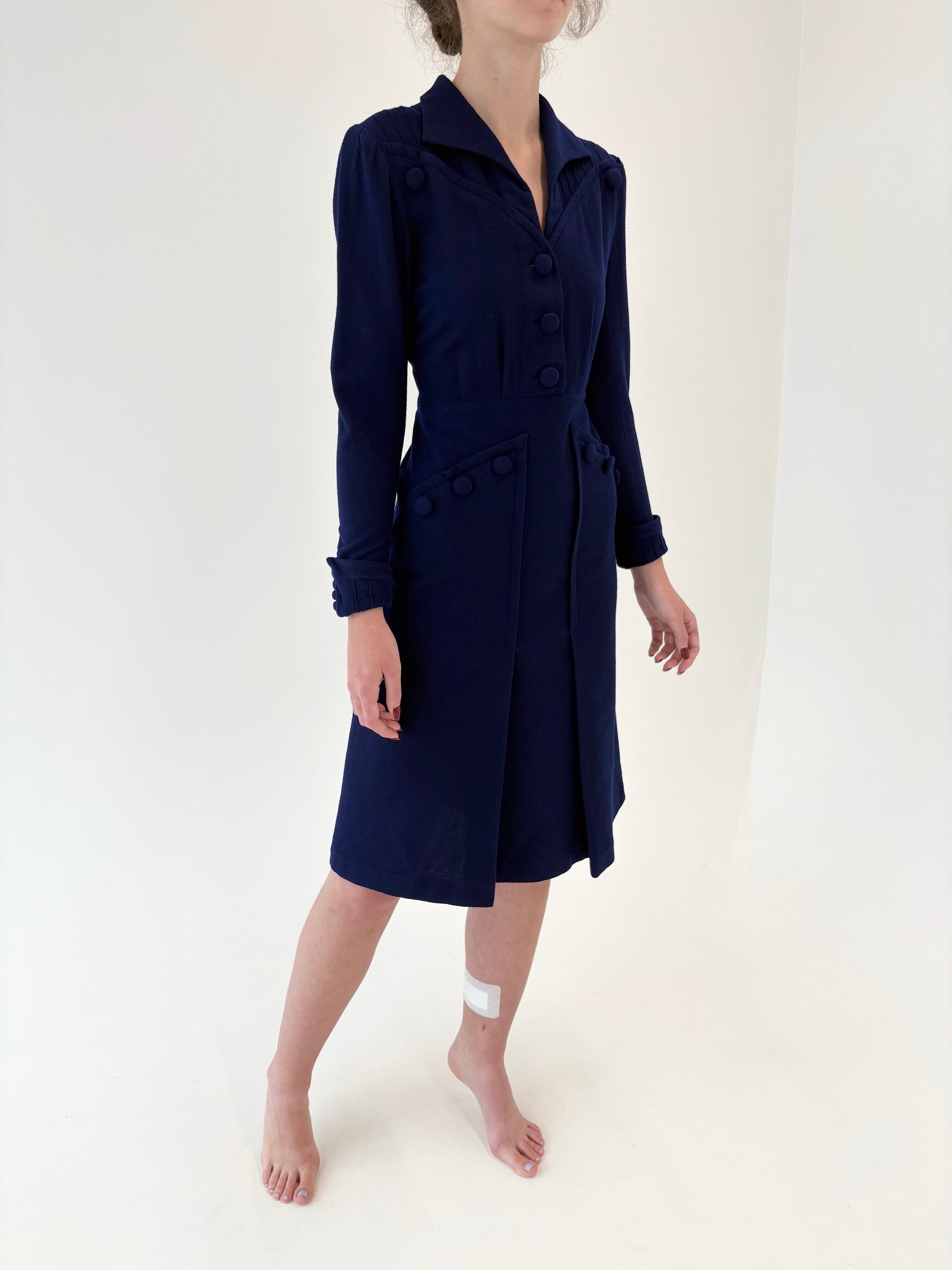 materialul din lână, într-o nuanță intensă de bleumarin, era frecvent folosit pentru rochii de iarnă elegante în acea epocă