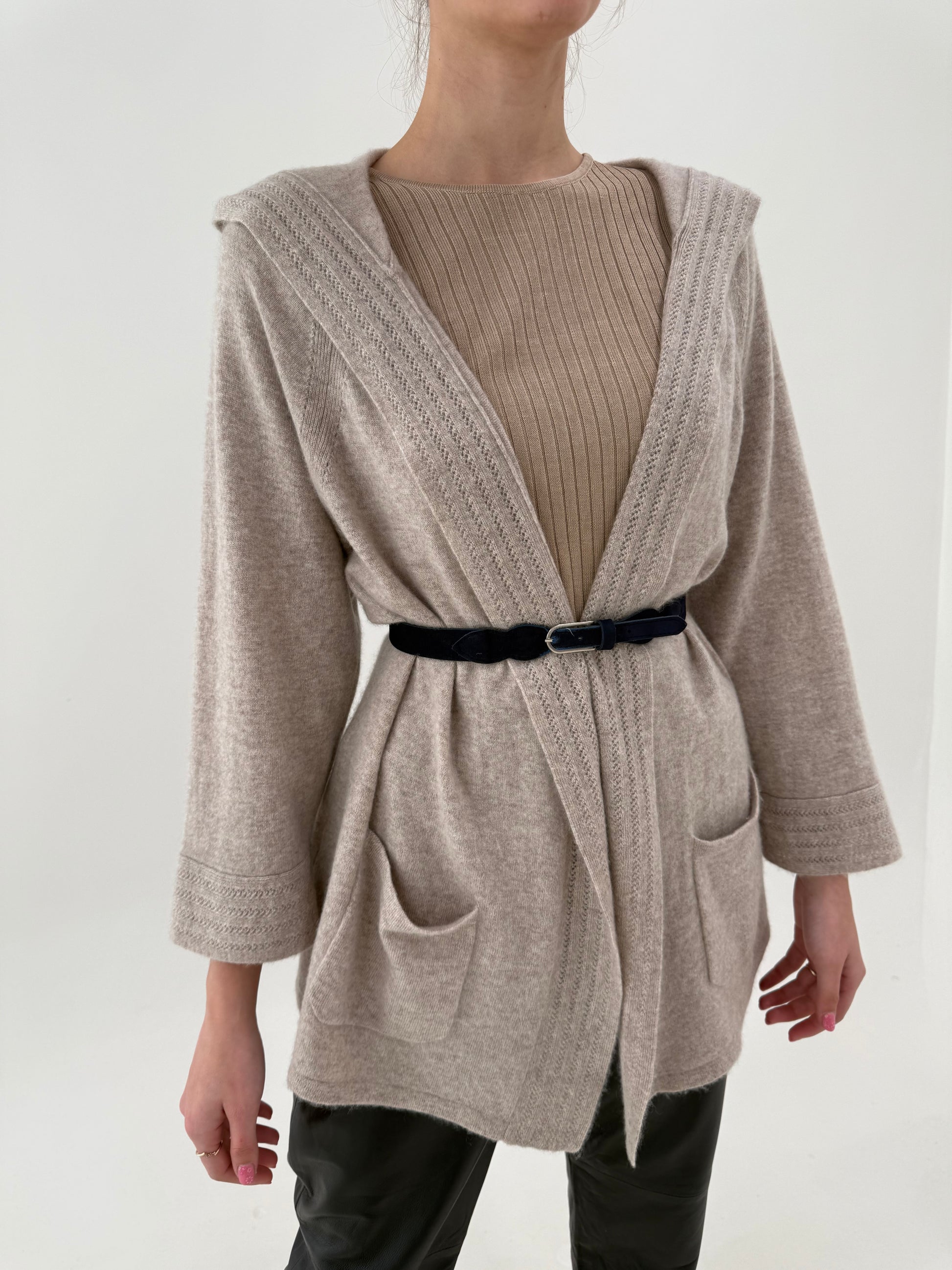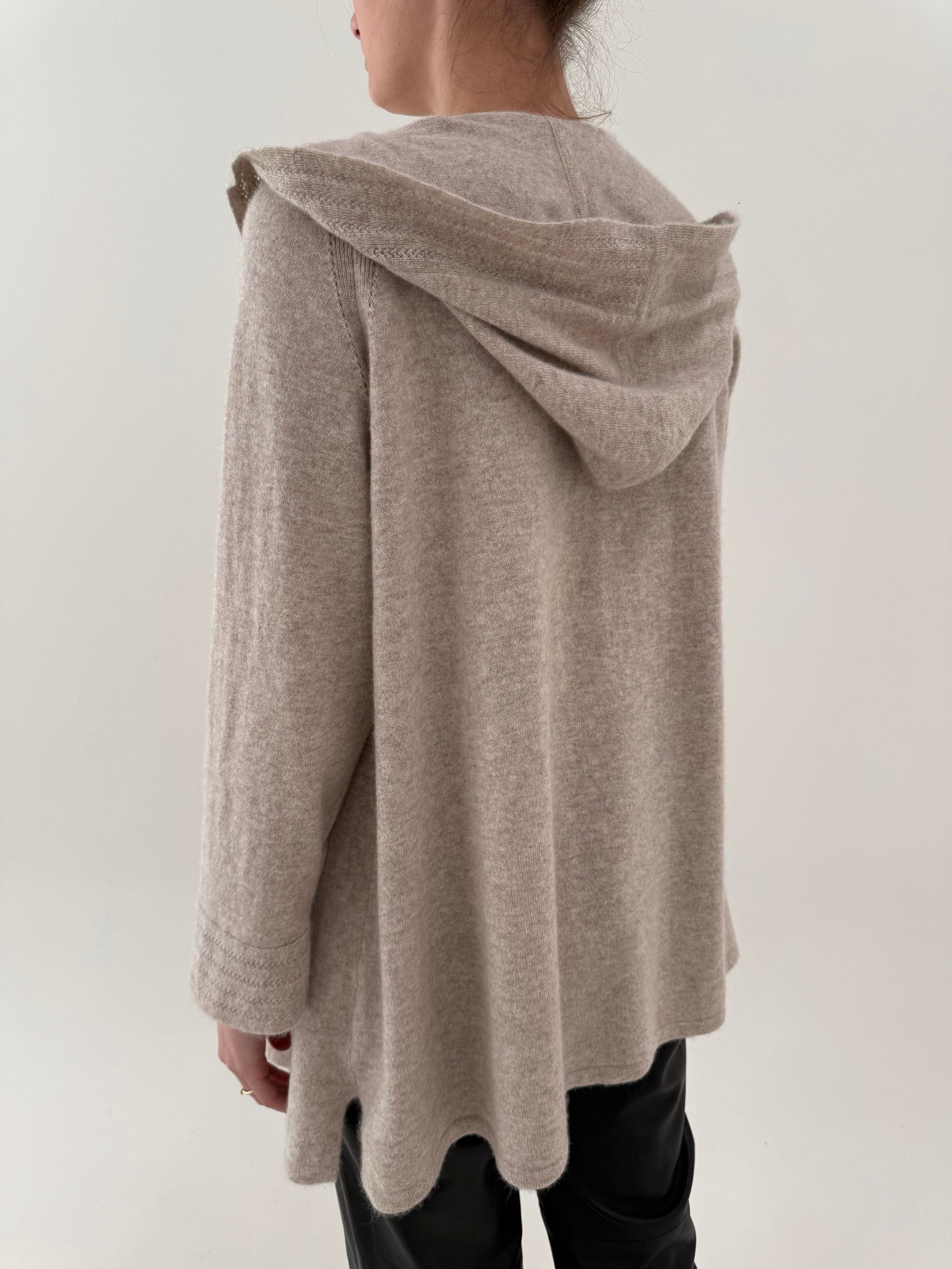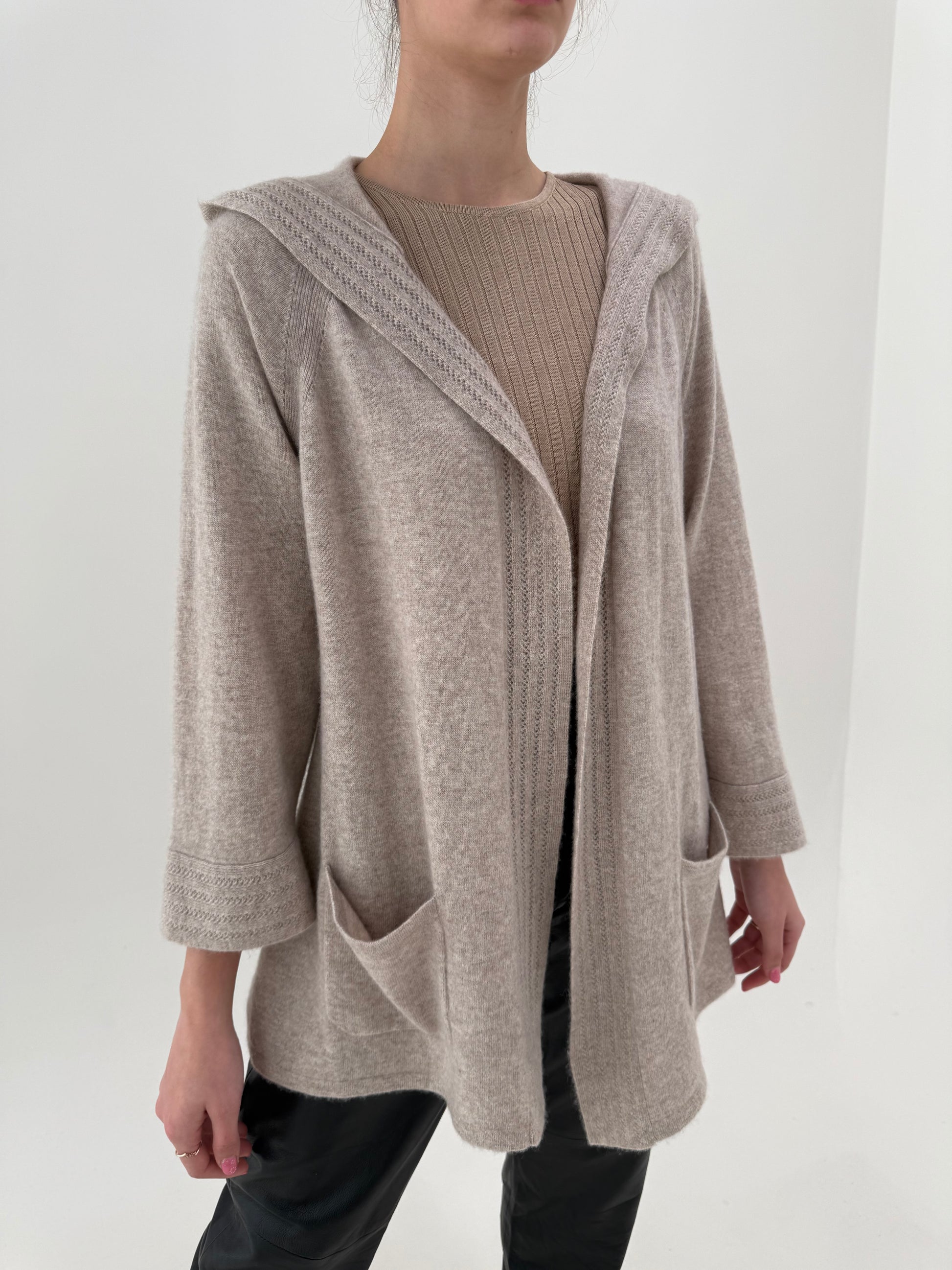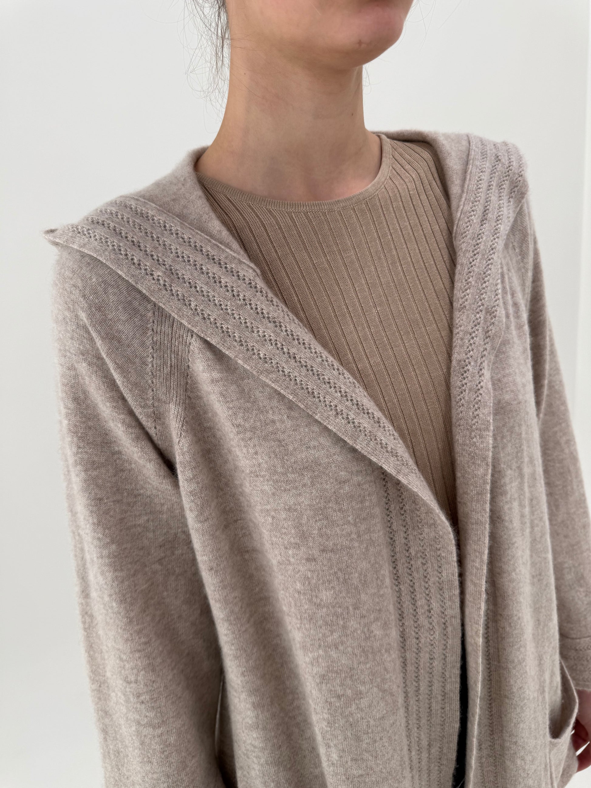 Cardigan nude cu glugă din cașmir în croi lung cu mânecă reglabilă din manșetă