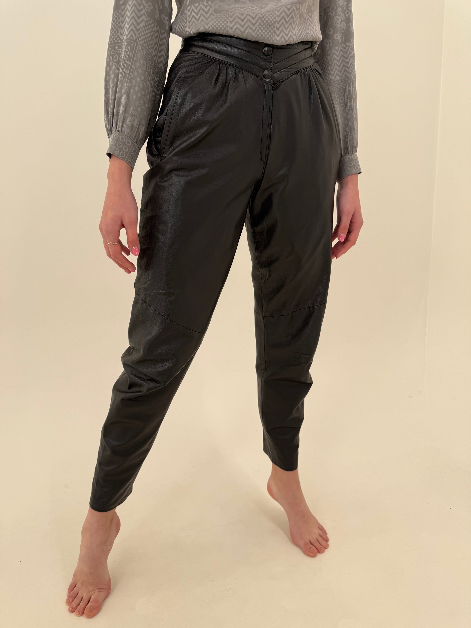 Pantaloni din piele naturală mănușă cu talie ultra marcată în croi elaborat