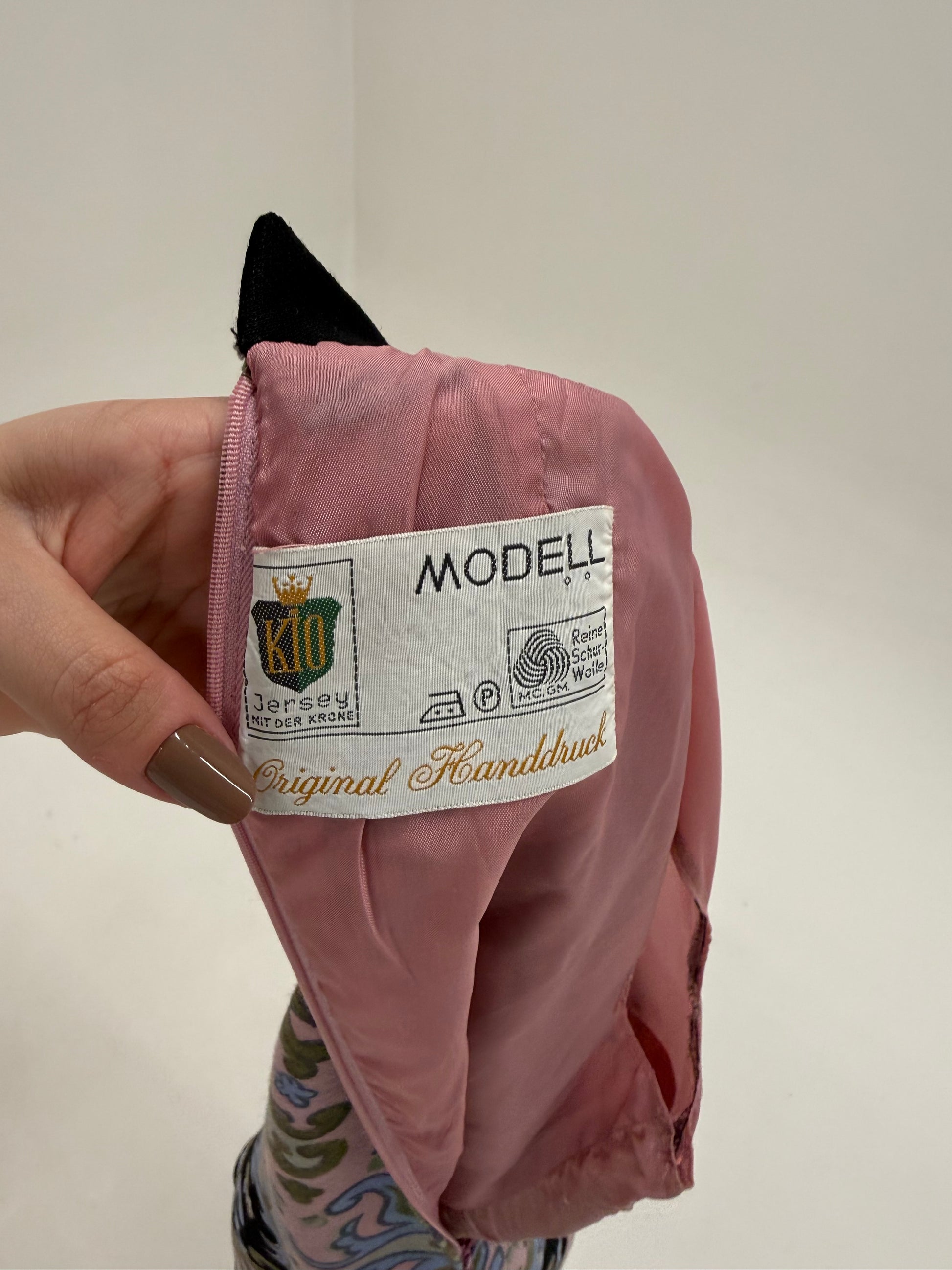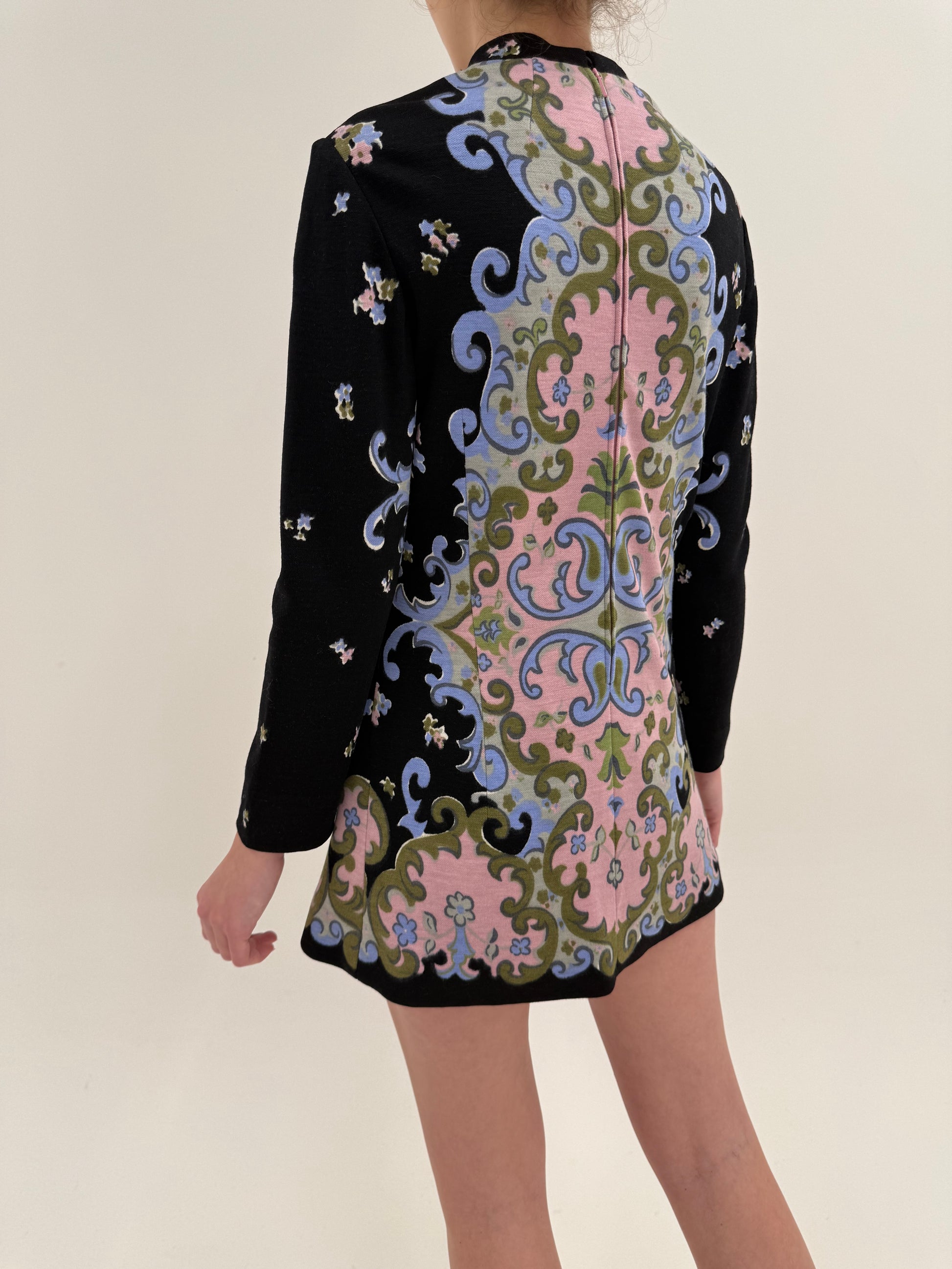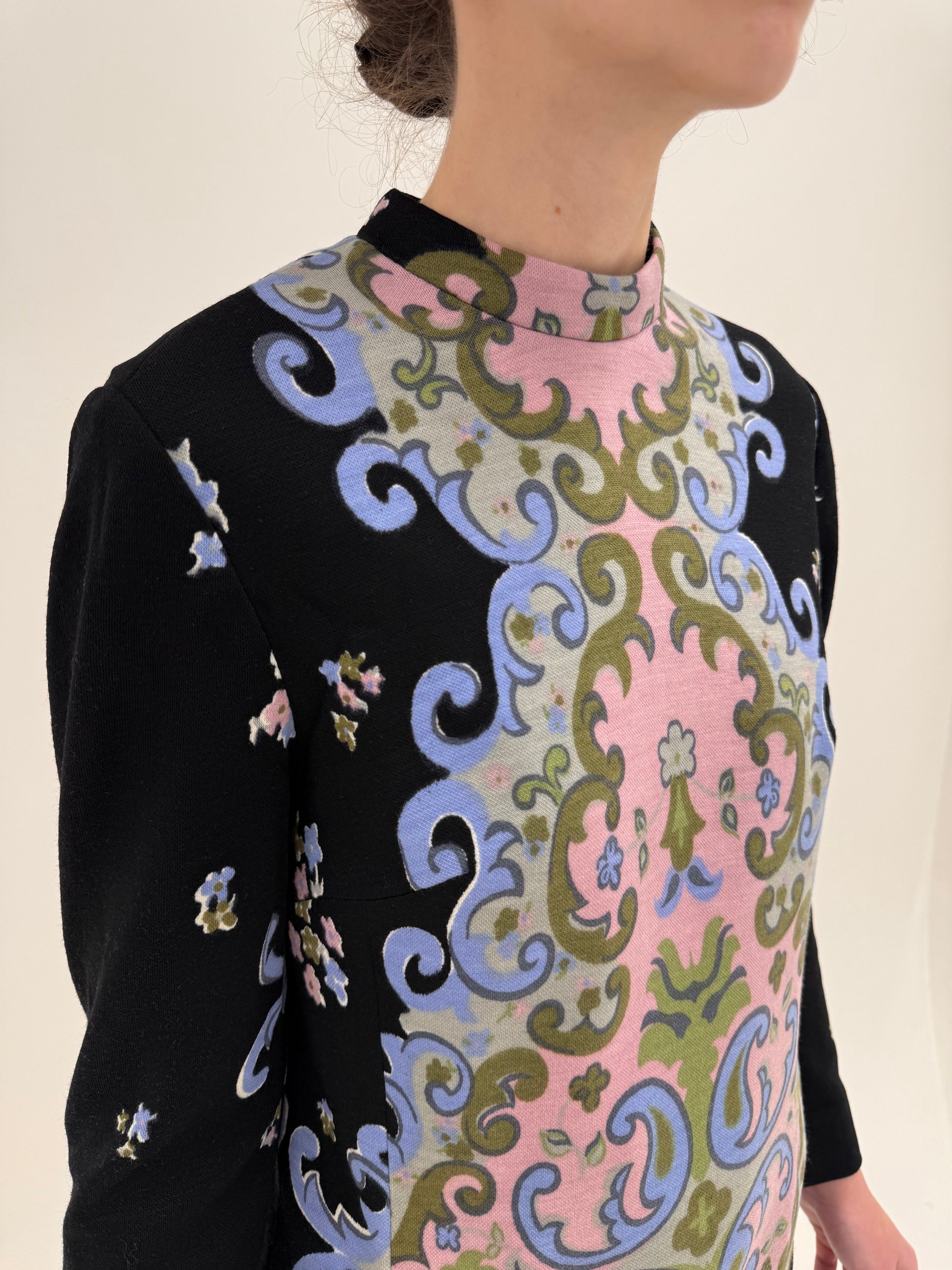 imprimeul psihedelic barocizat, în roz pudrat, bleu și verde salvie pe fond negru – paletă foarte specifică sfârșitului de ani ’60