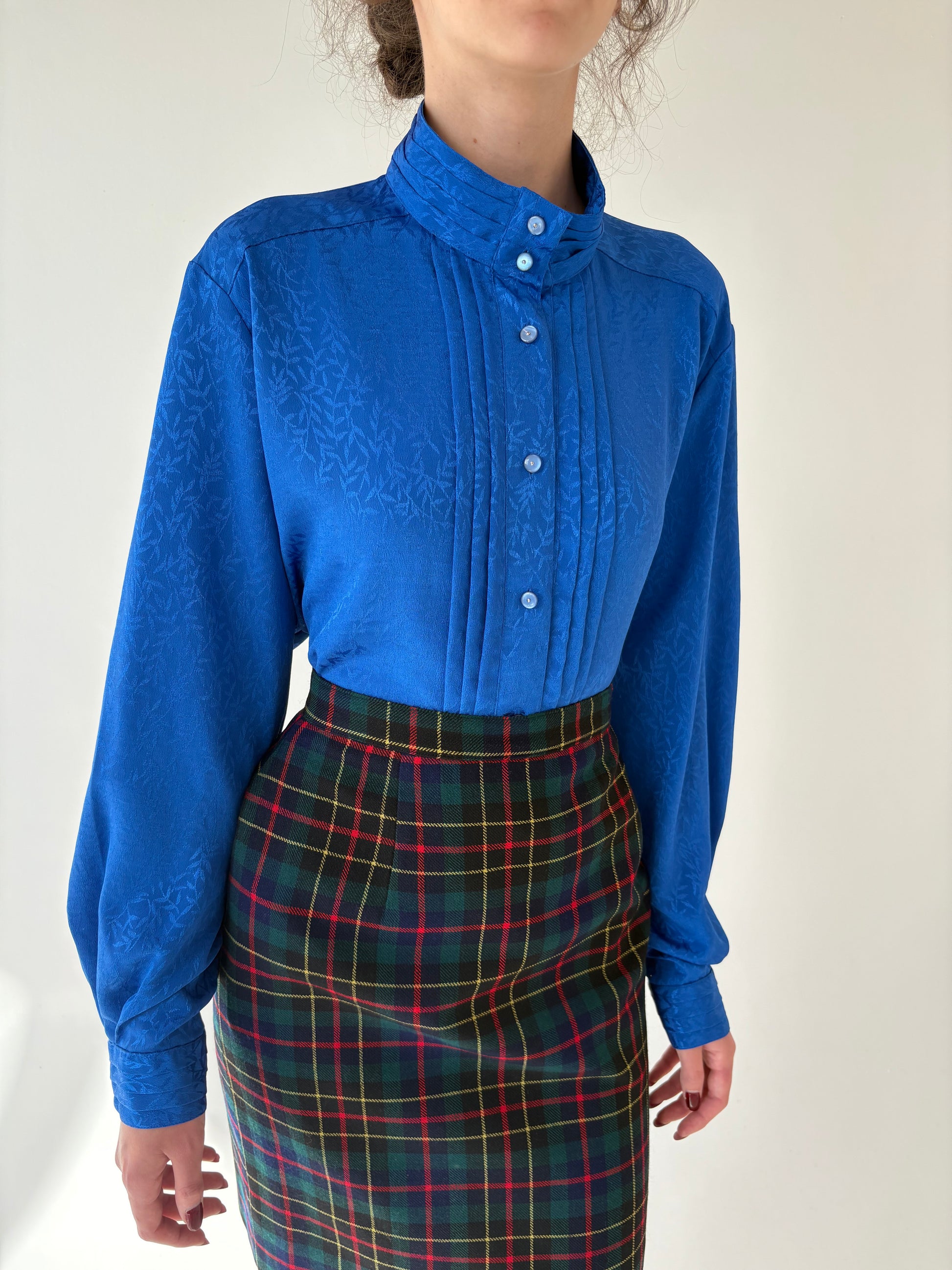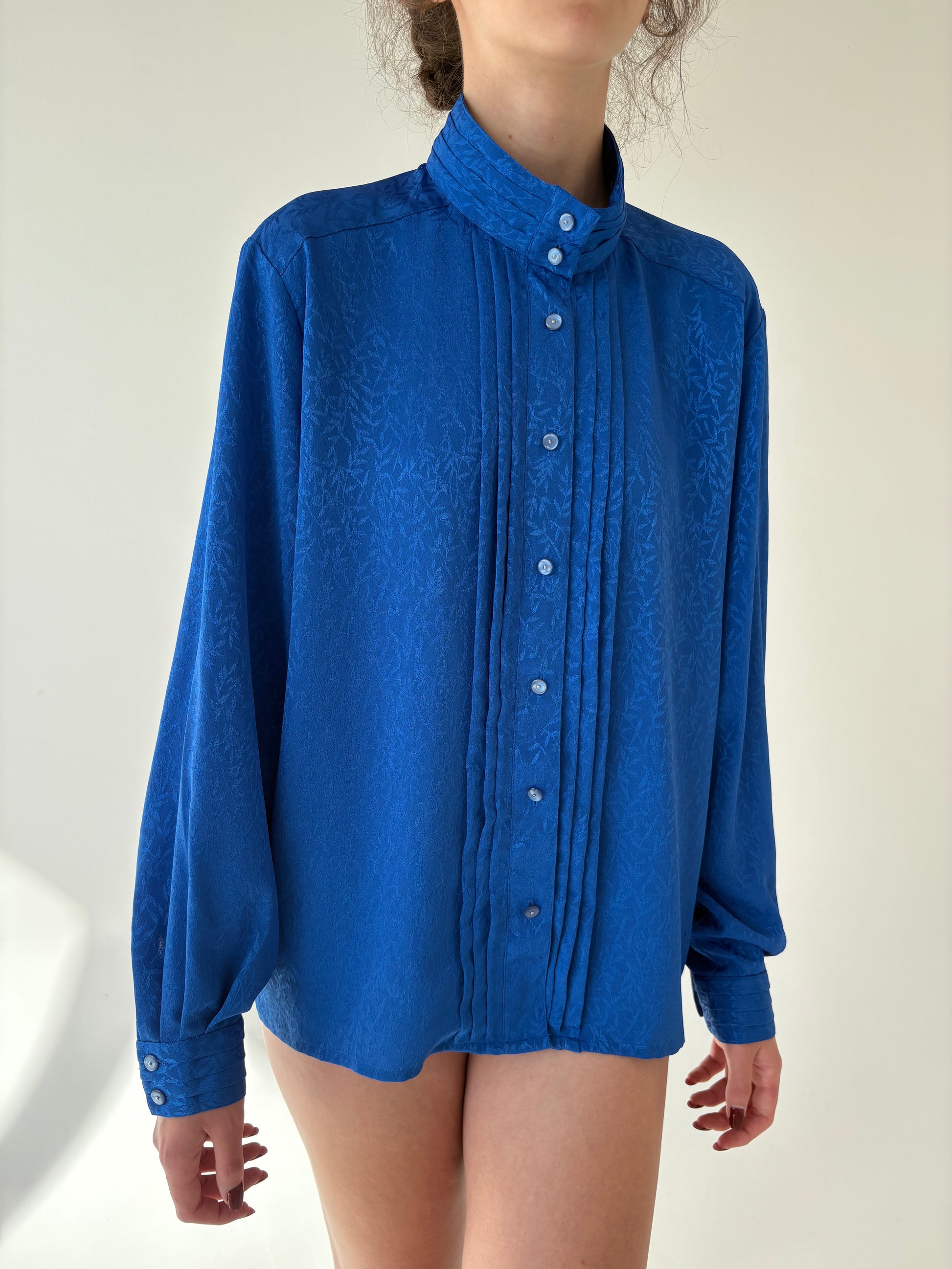 Cămașa vintage din jacquard moale albastru regal cu pliseuri decorative