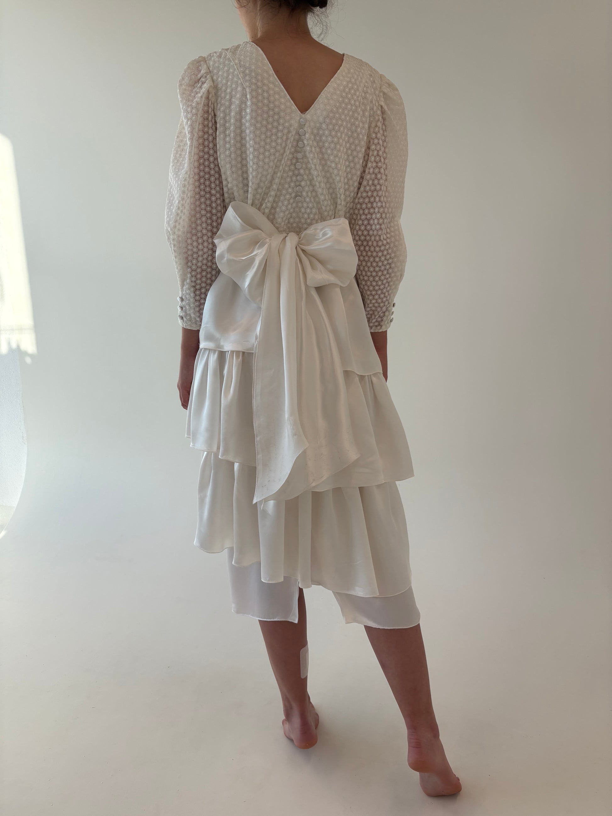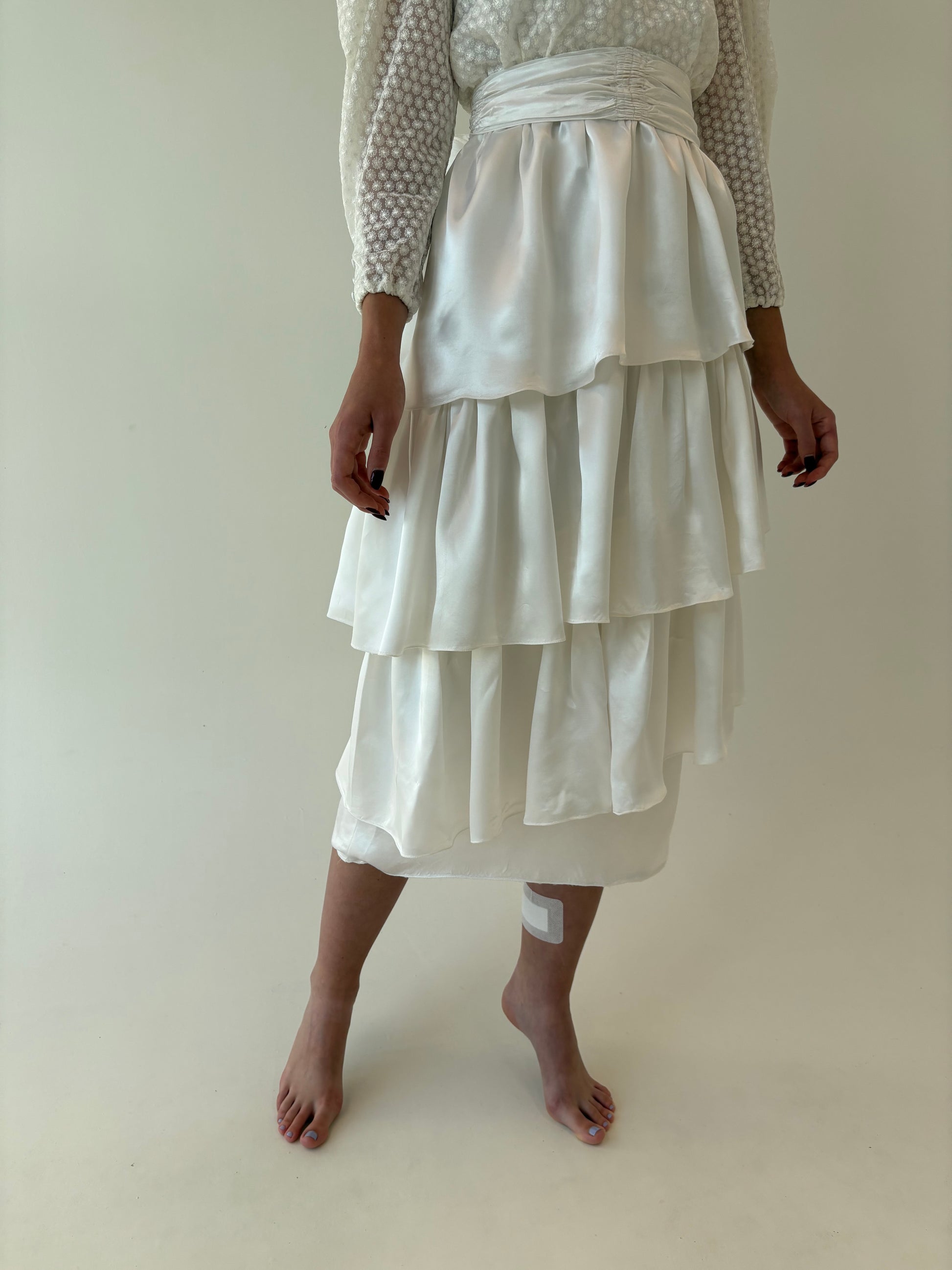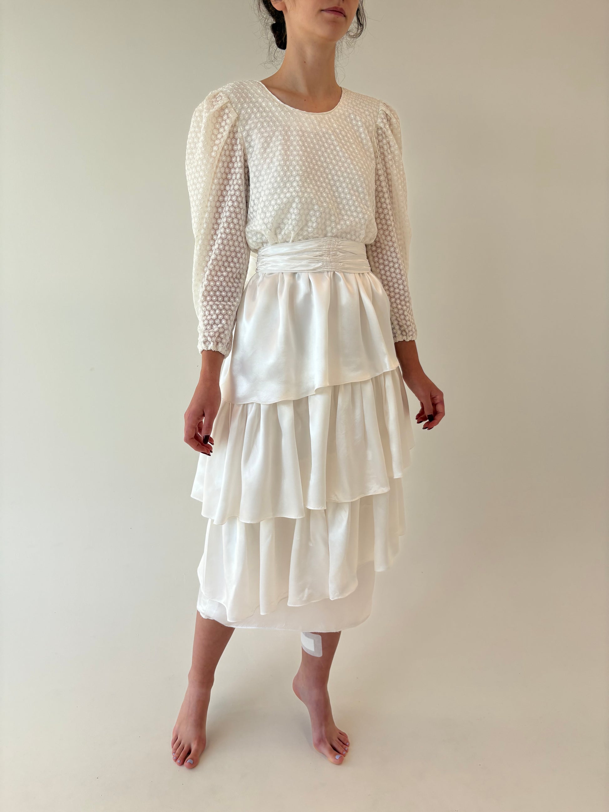 – croiala midi cu volane stratificate din satin lucios se încadrează perfect în stilul rochiilor de petrecere de la începutul și mijlocul anilor 80