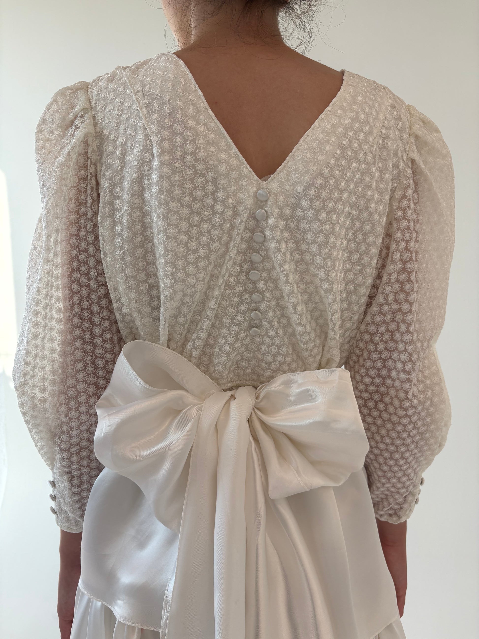 – talia marcată cu un brâu lat și fundă mare la spate este un detaliu emblematic al anilor 80, prezent mai ales la rochiile de seară sau de ocazie