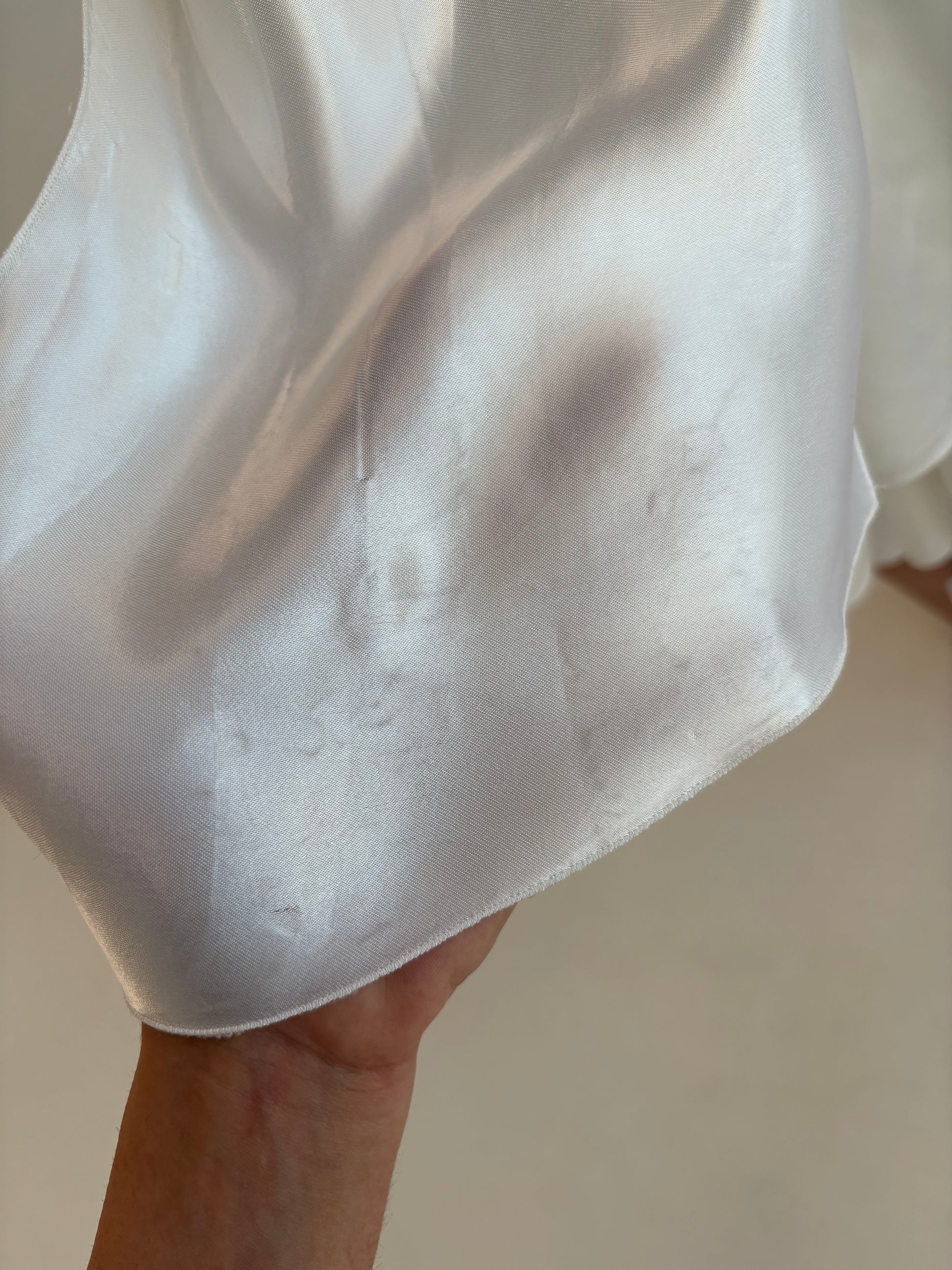 – materialul de bust cu textură tip plumeti (buline reliefate) combinat cu partea de jos din satin lucios, în straturi, era foarte popular în acea perioadă
