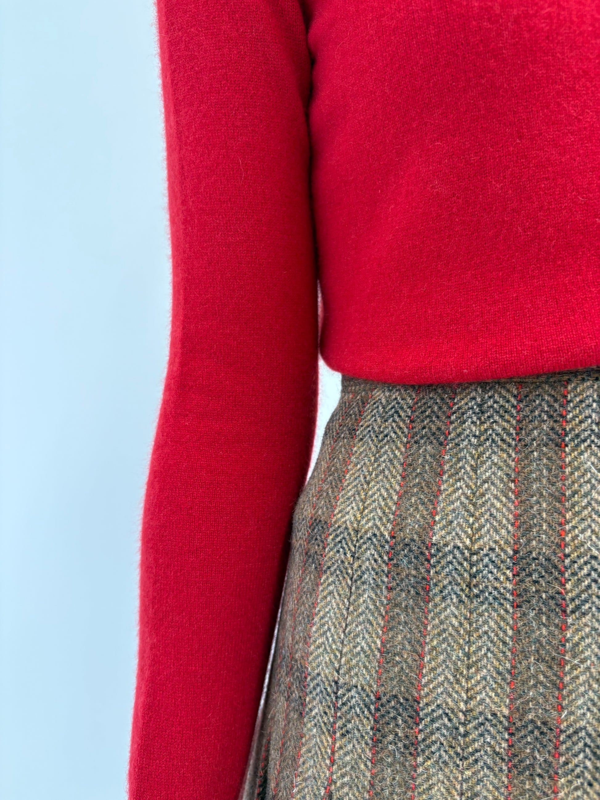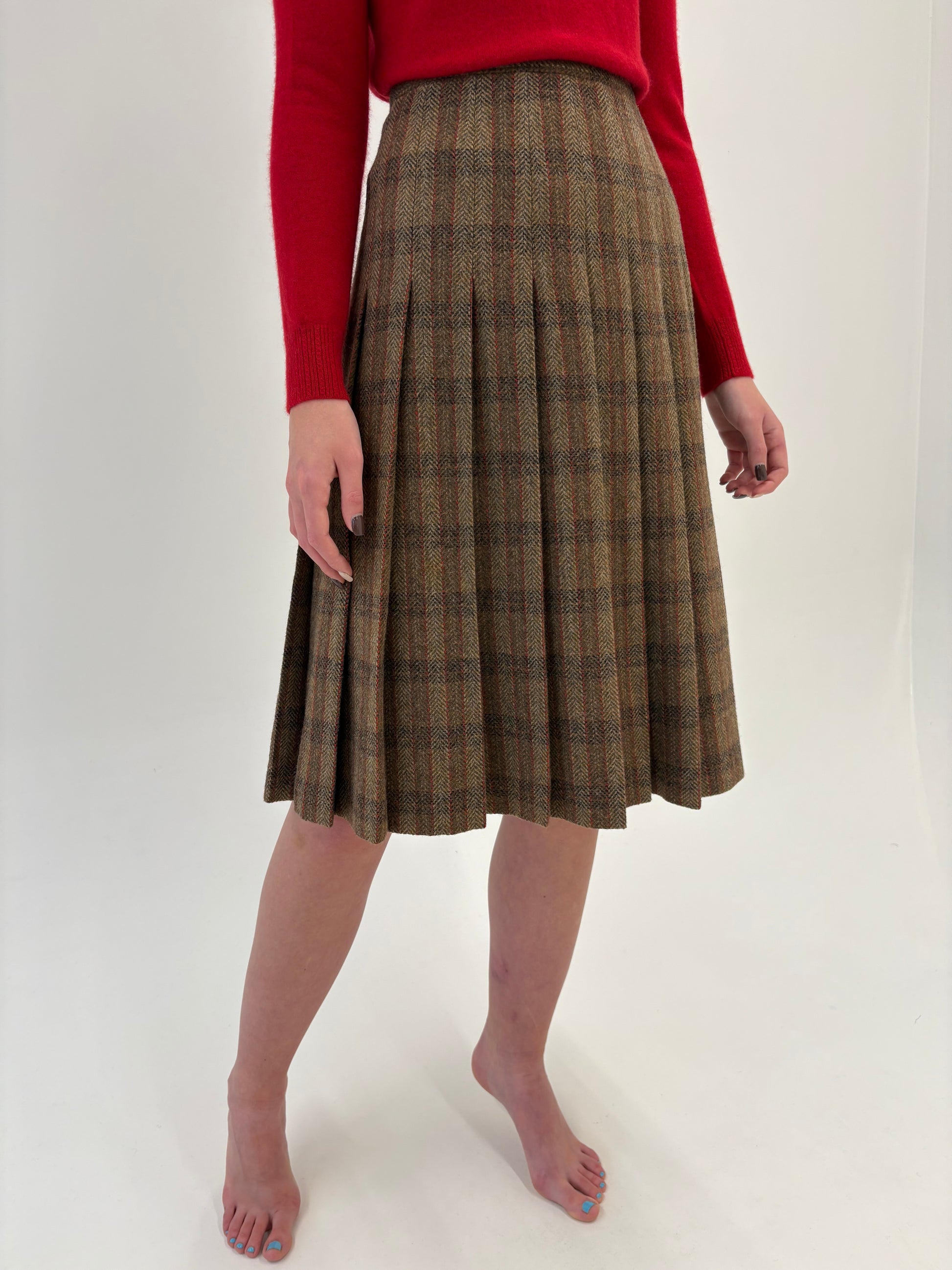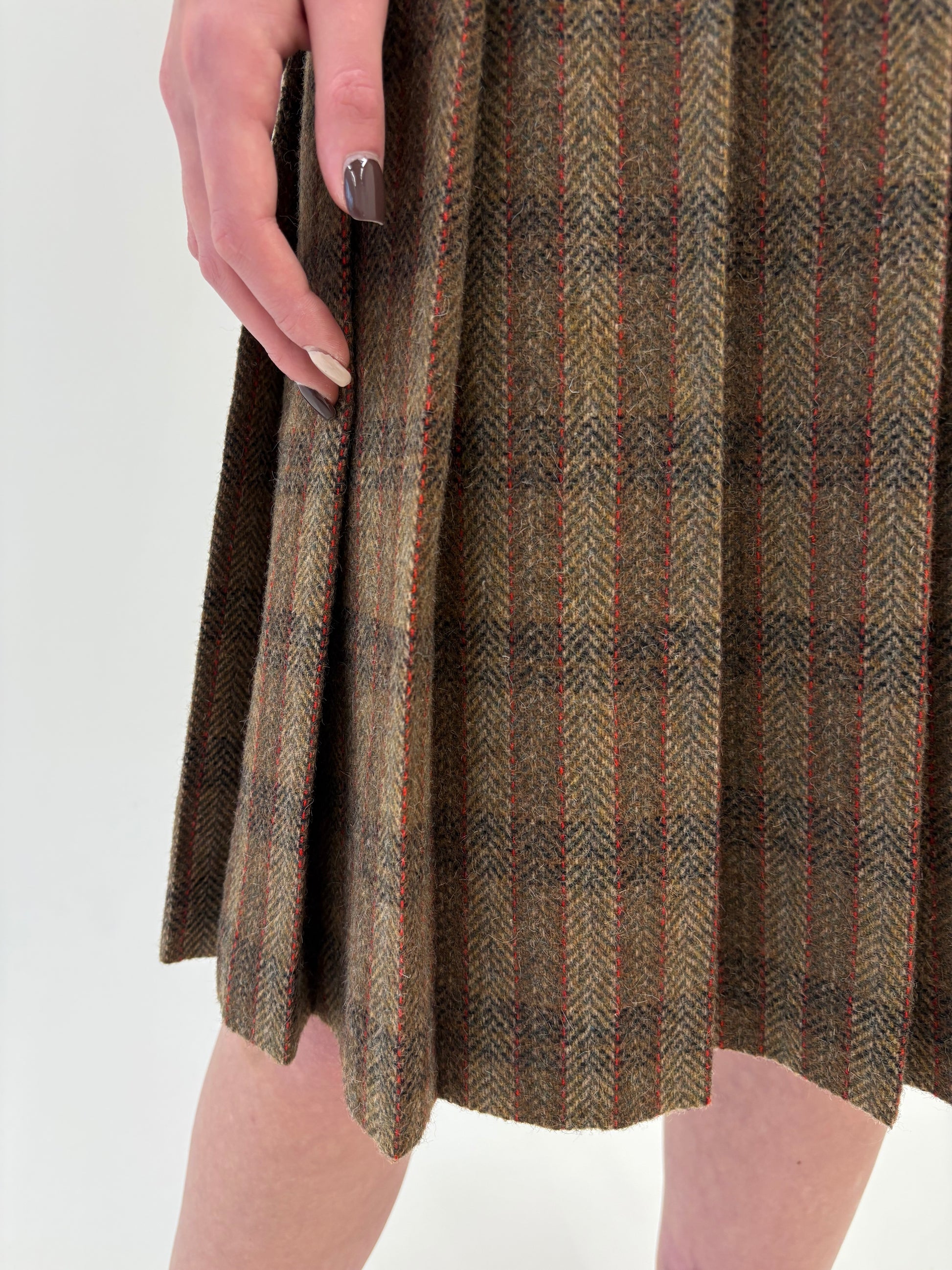Fustă vintage plisată dark camel în carouri burgundy din lana groasă