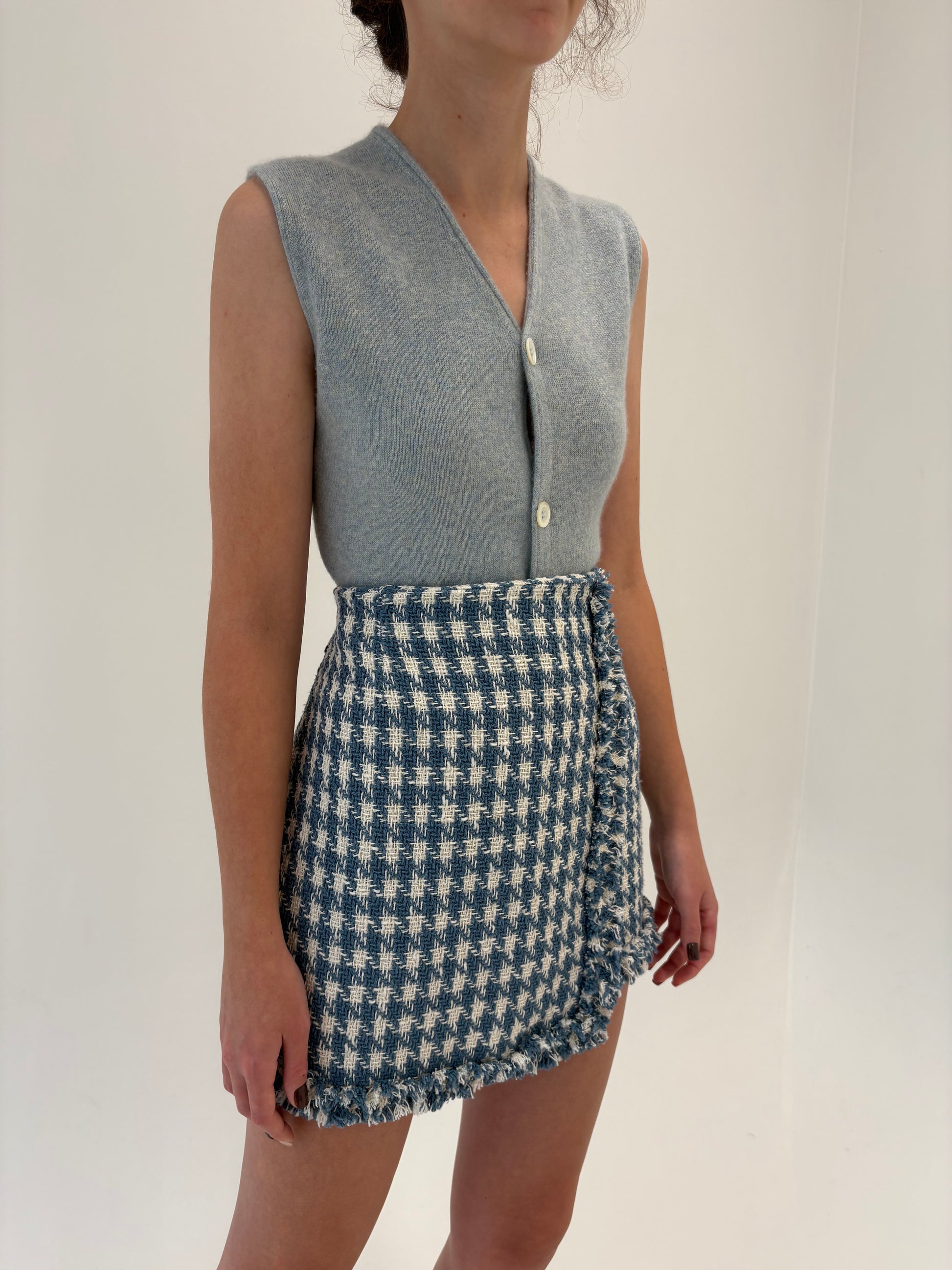 Fustă din tweed în stil Chanel butter white cu jeans blue
