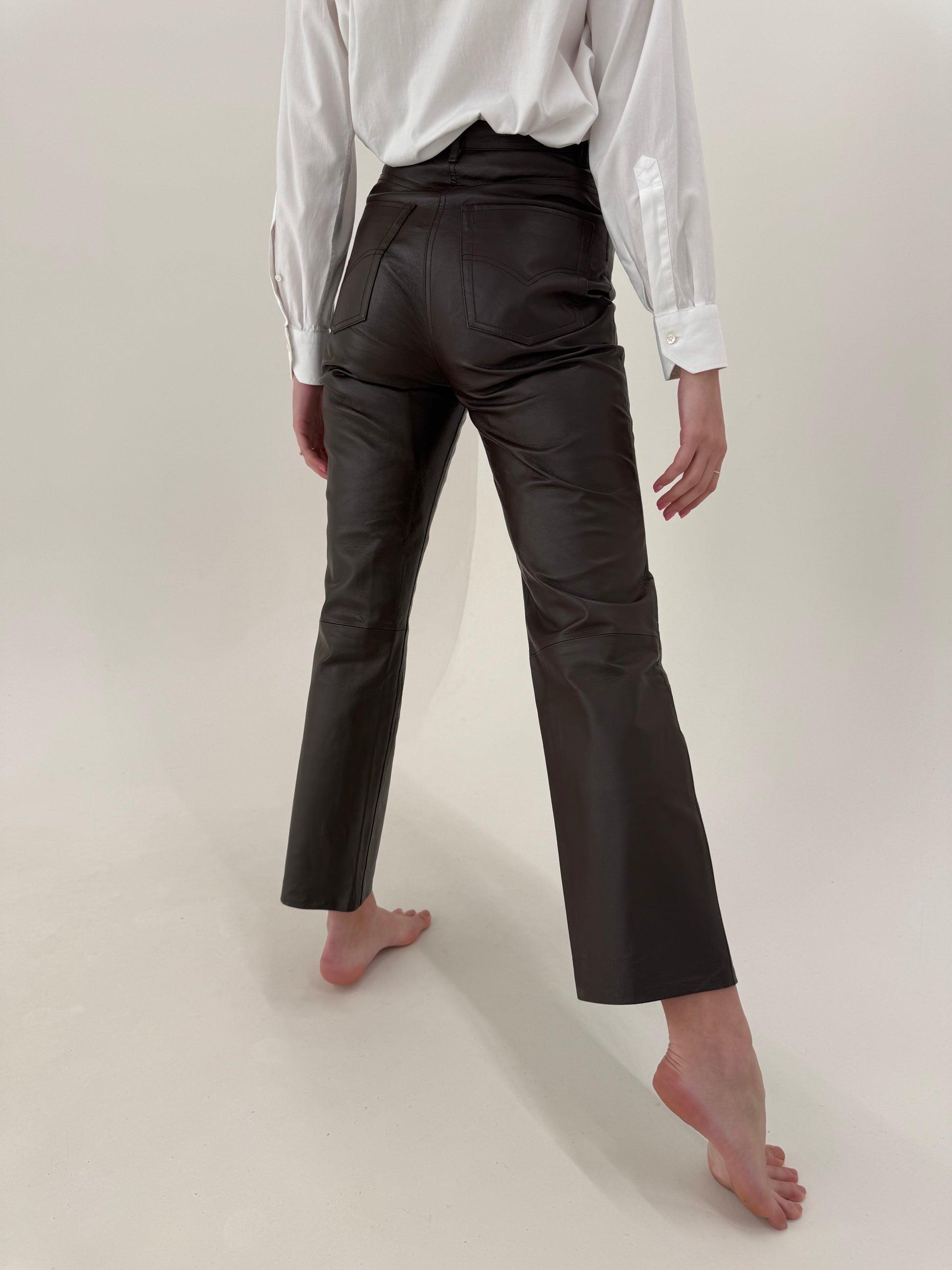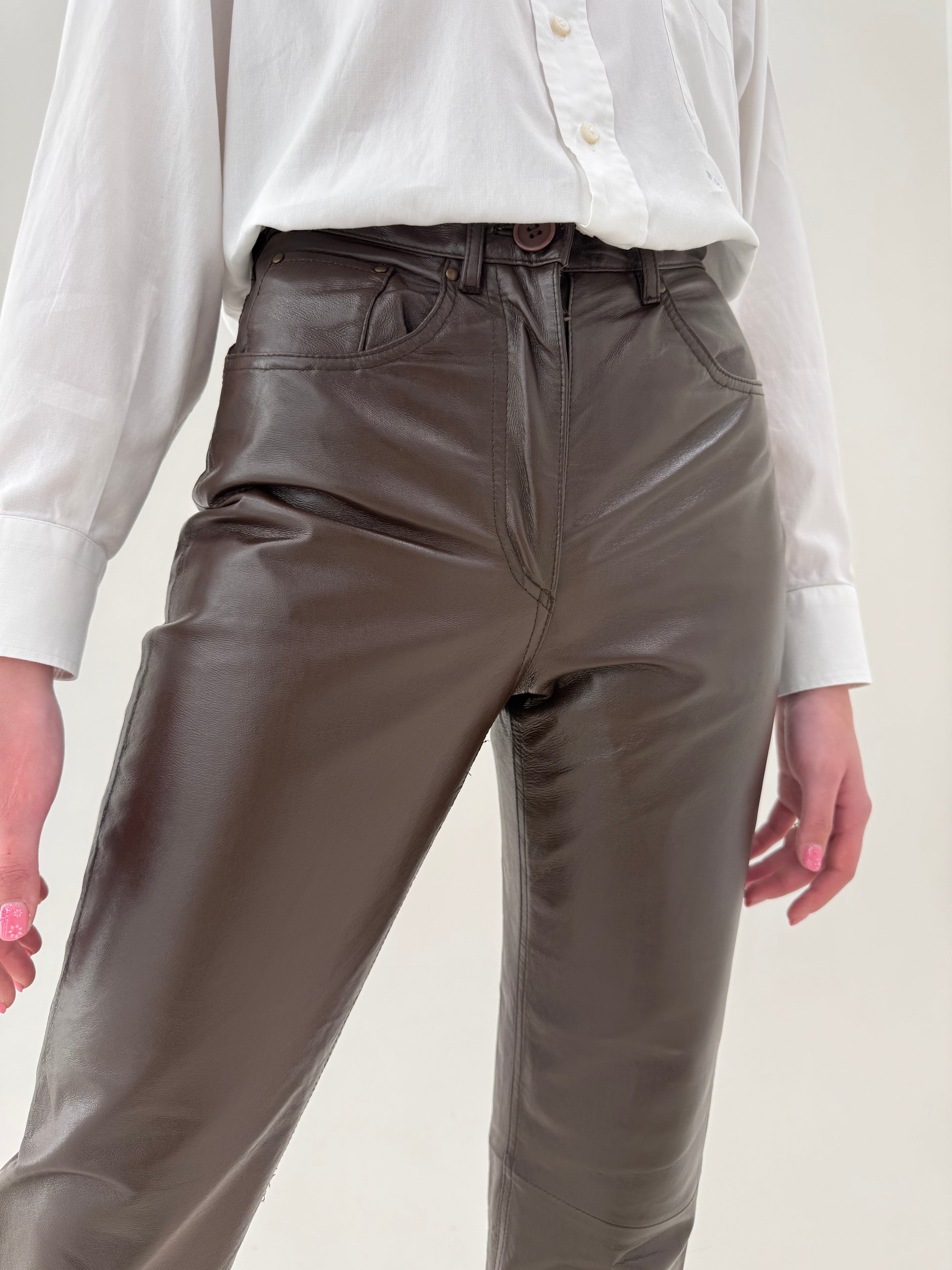 Pantaloni chocolate brown din piele naturală moale cu talie înaltă
