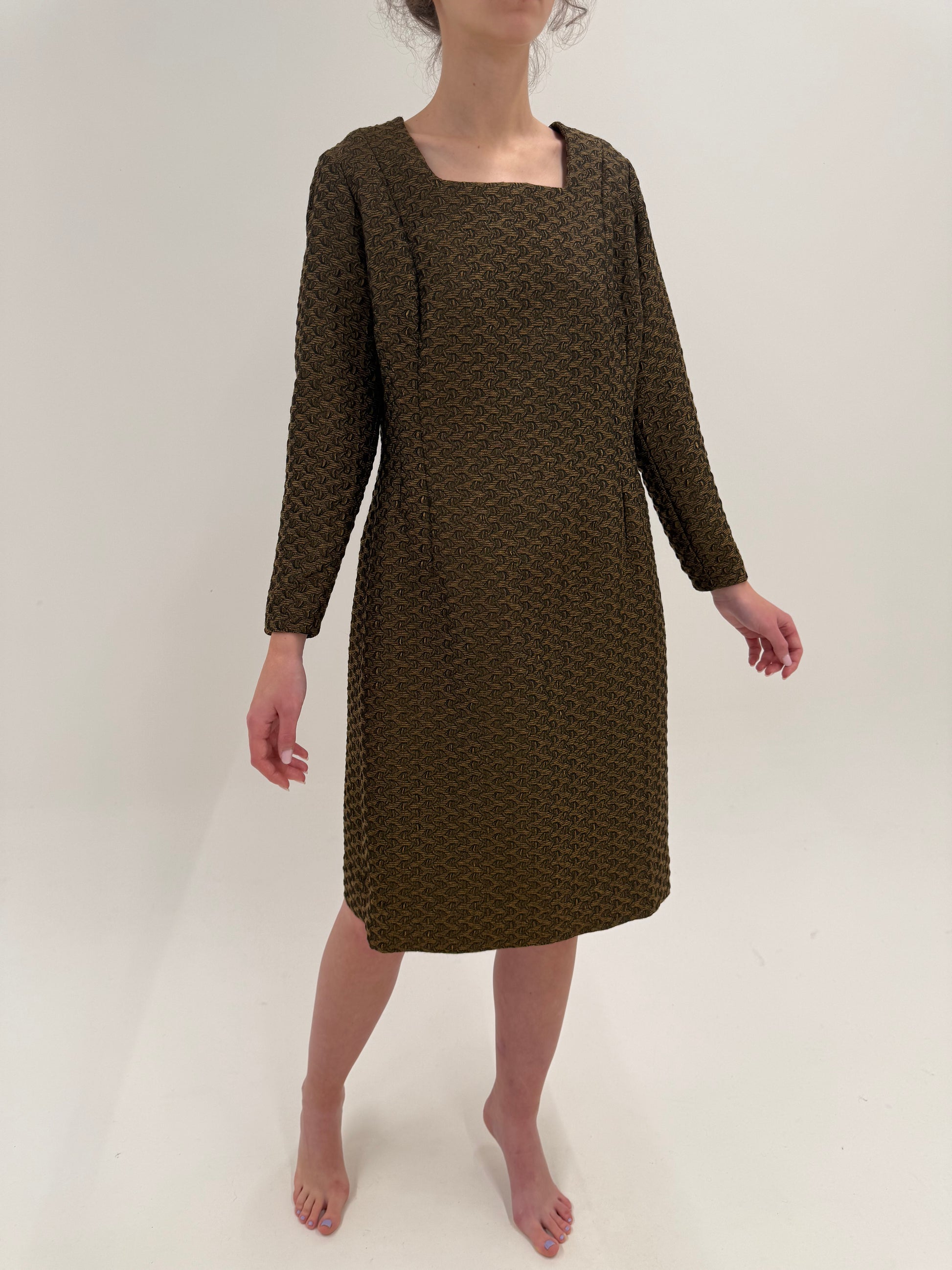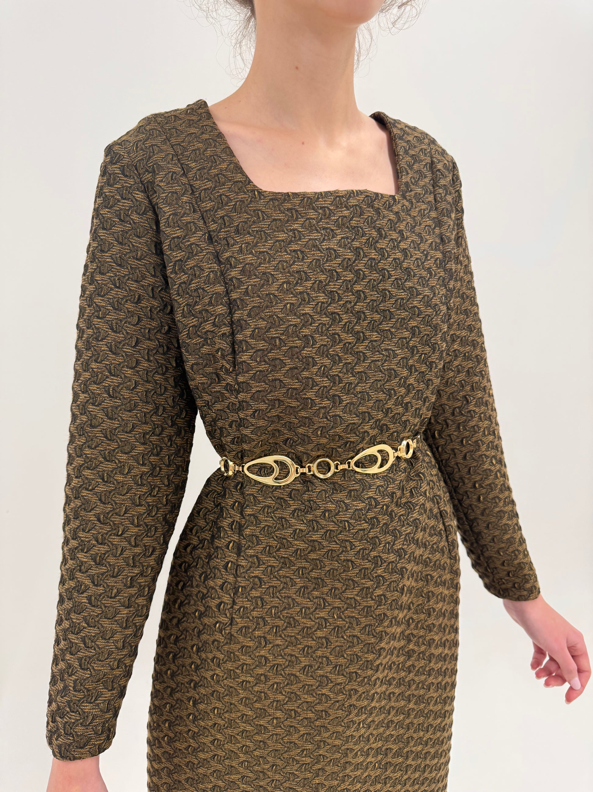 jacquard gros, cu model geometric repetitiv, cu fir discret auriu — extrem de comun în 1960–1963 la rochiile de zi elegante sau cocktail de iarnă