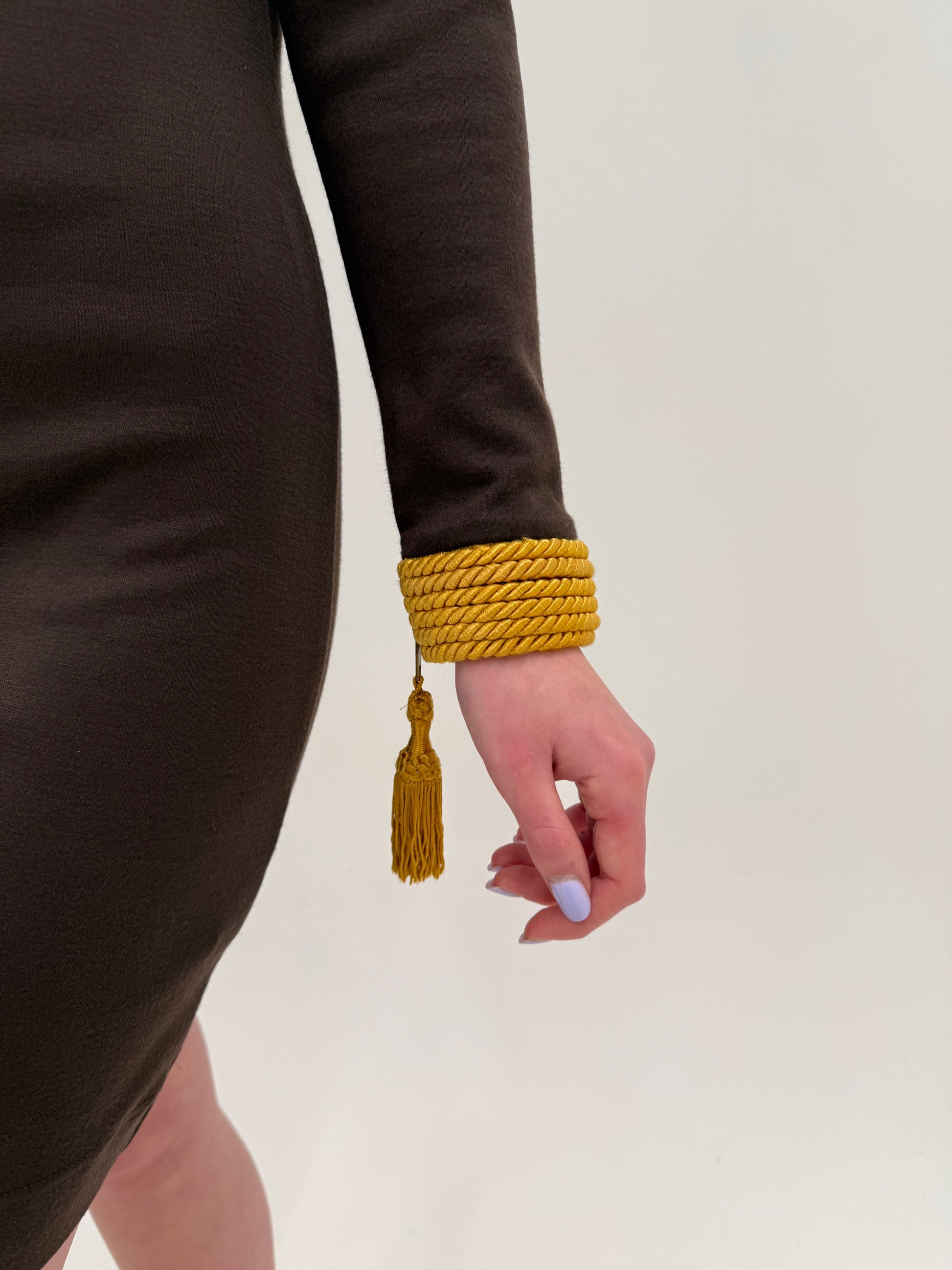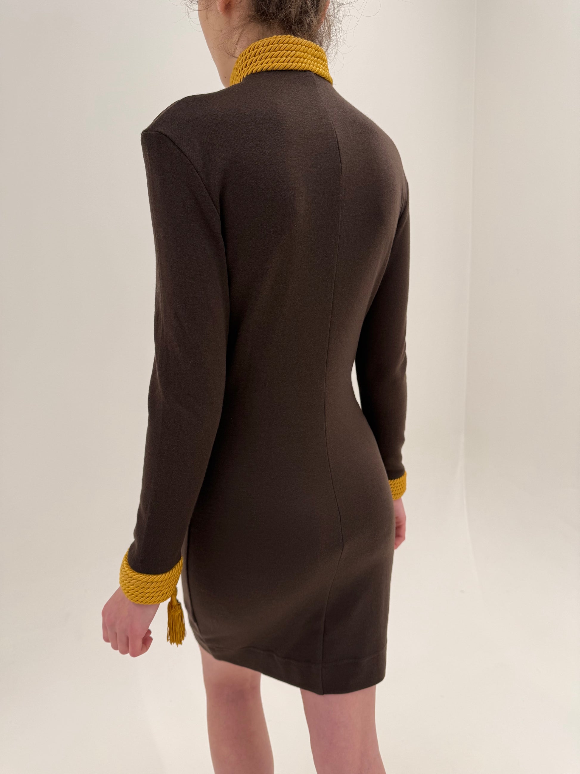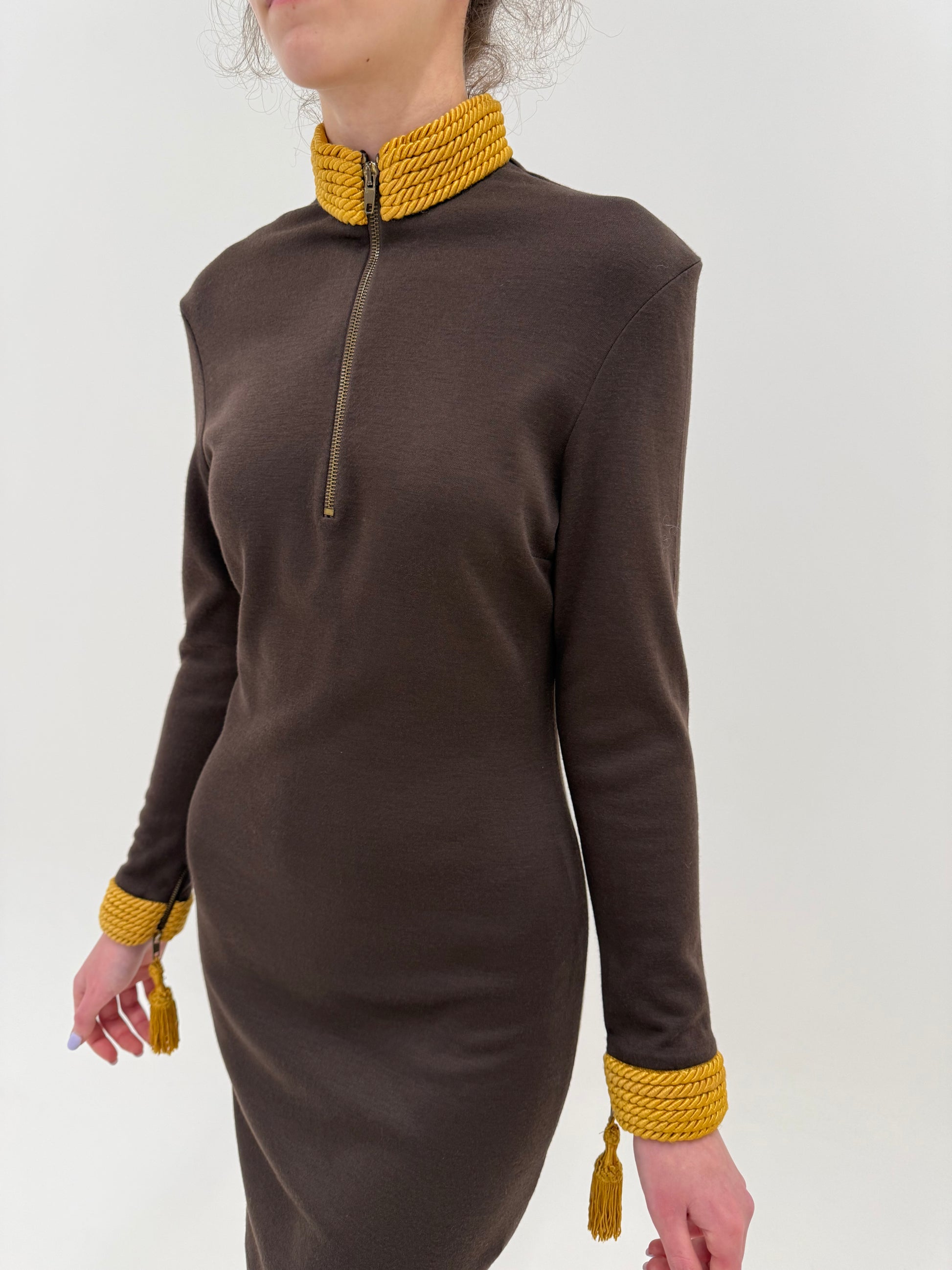 Estetica cu șnur gros decorativ, ciucuri și detalii aproape militare sau aristocrat-baroque este tipică Moschino din anii 90