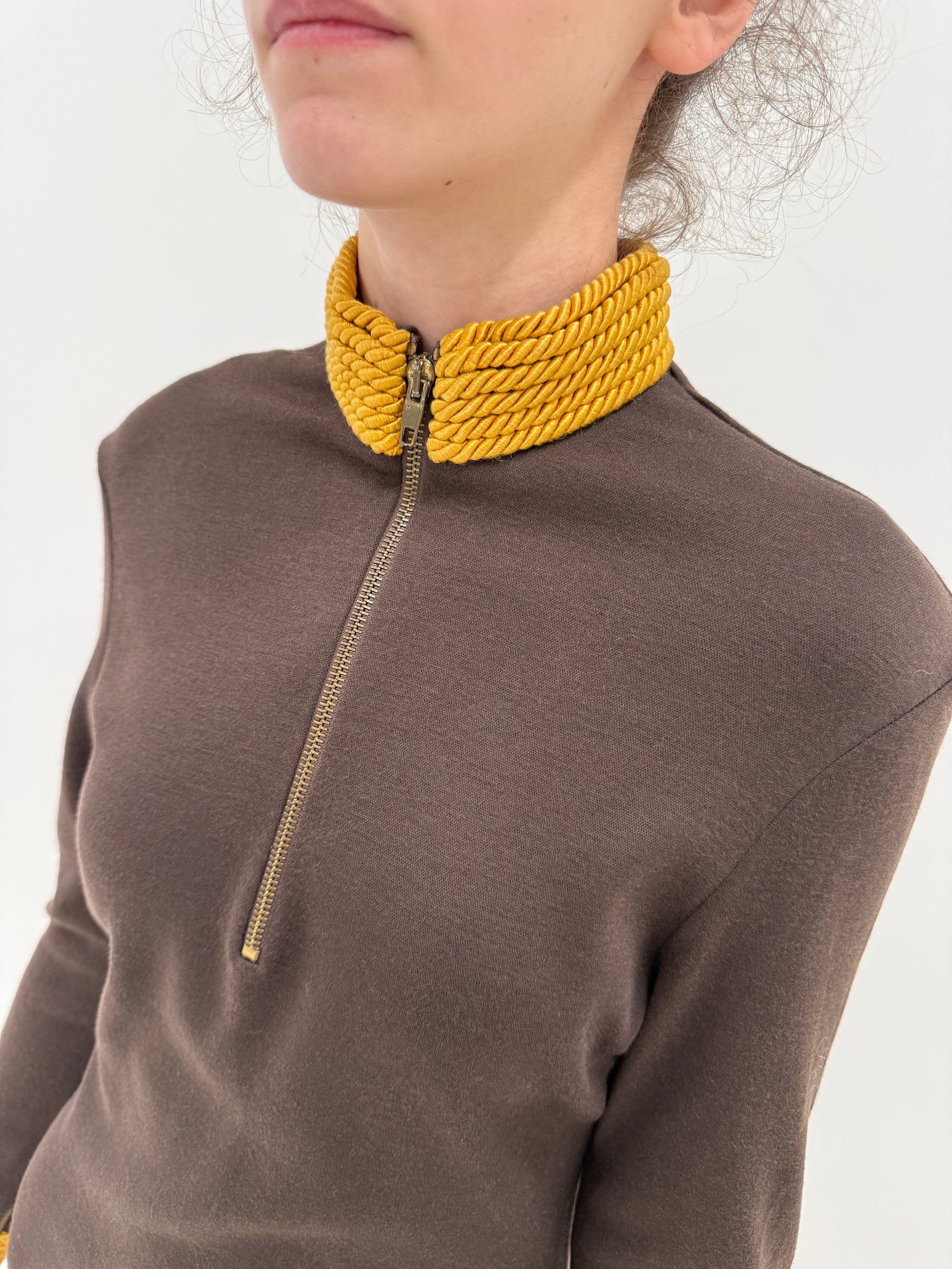 Fermoarul scurt frontal la gât apare frecvent în colecțiile de final de 90