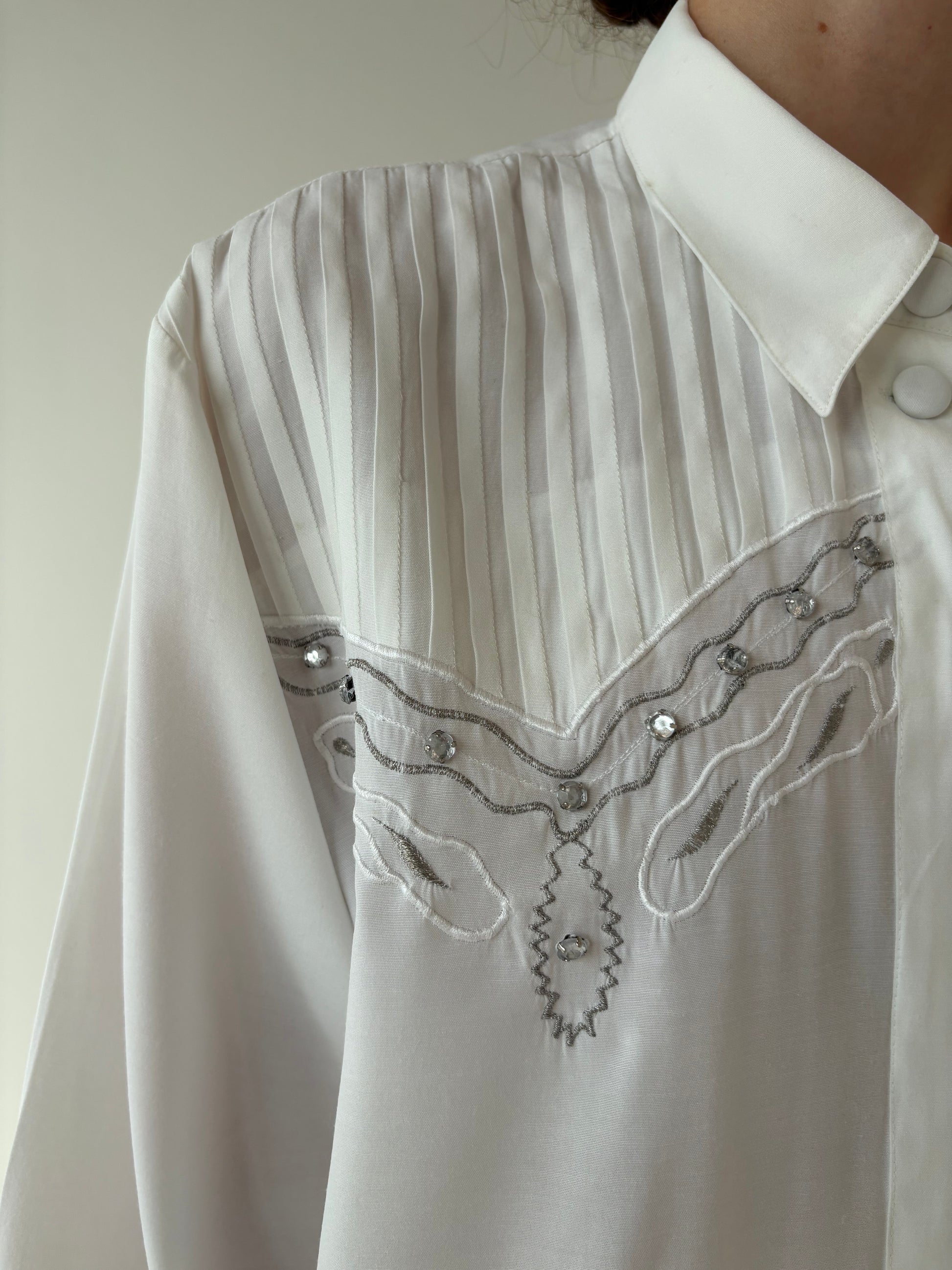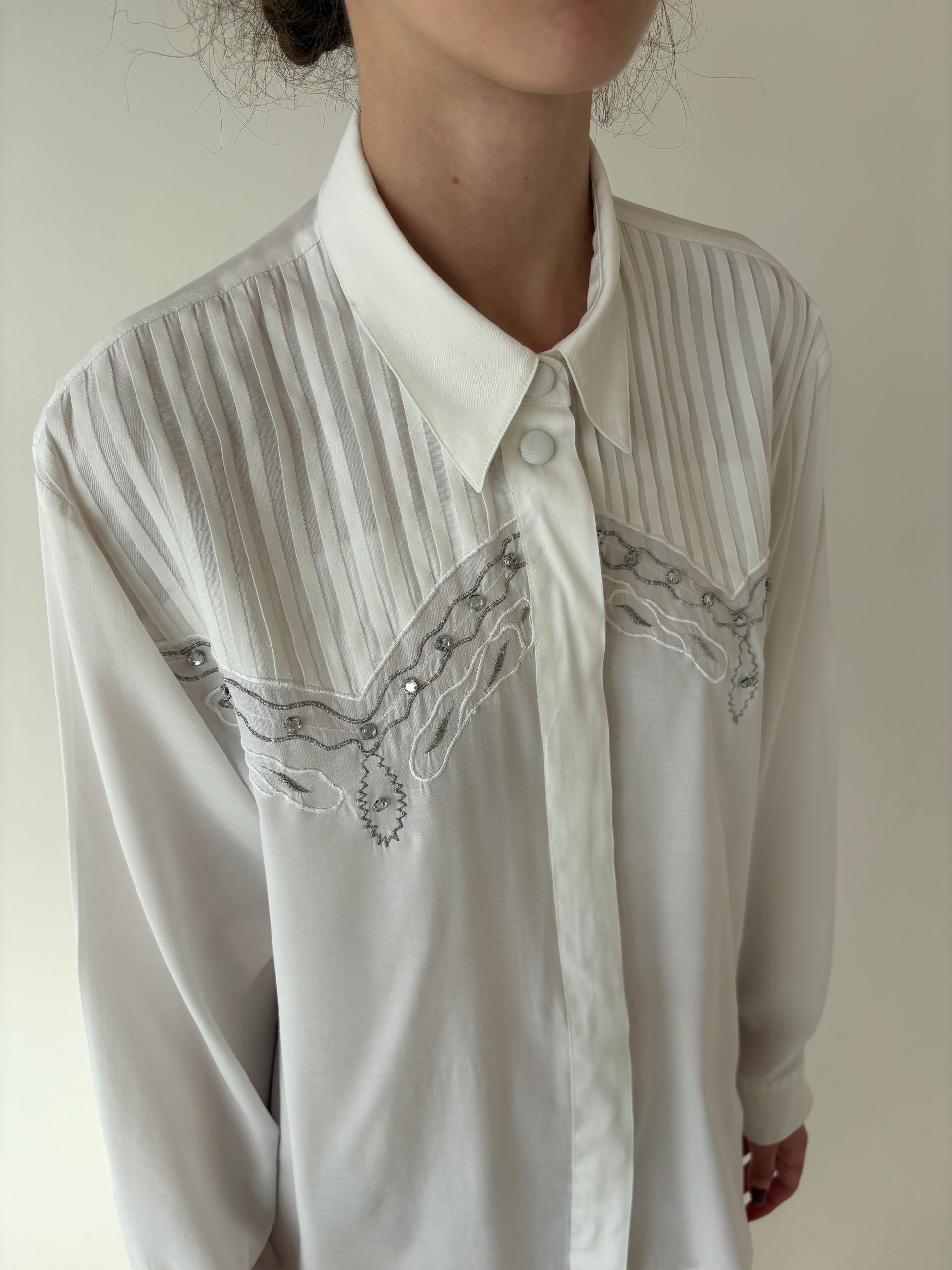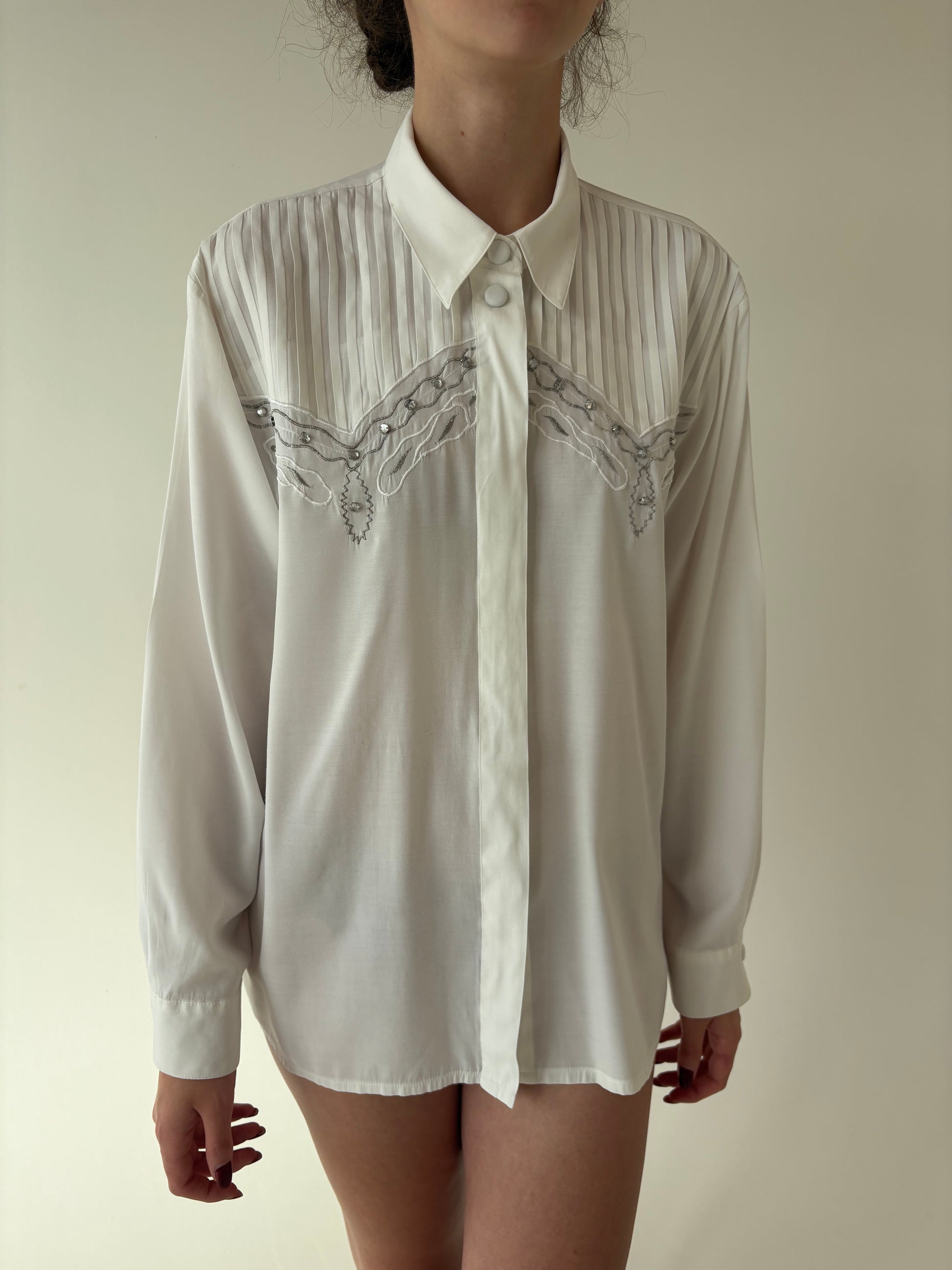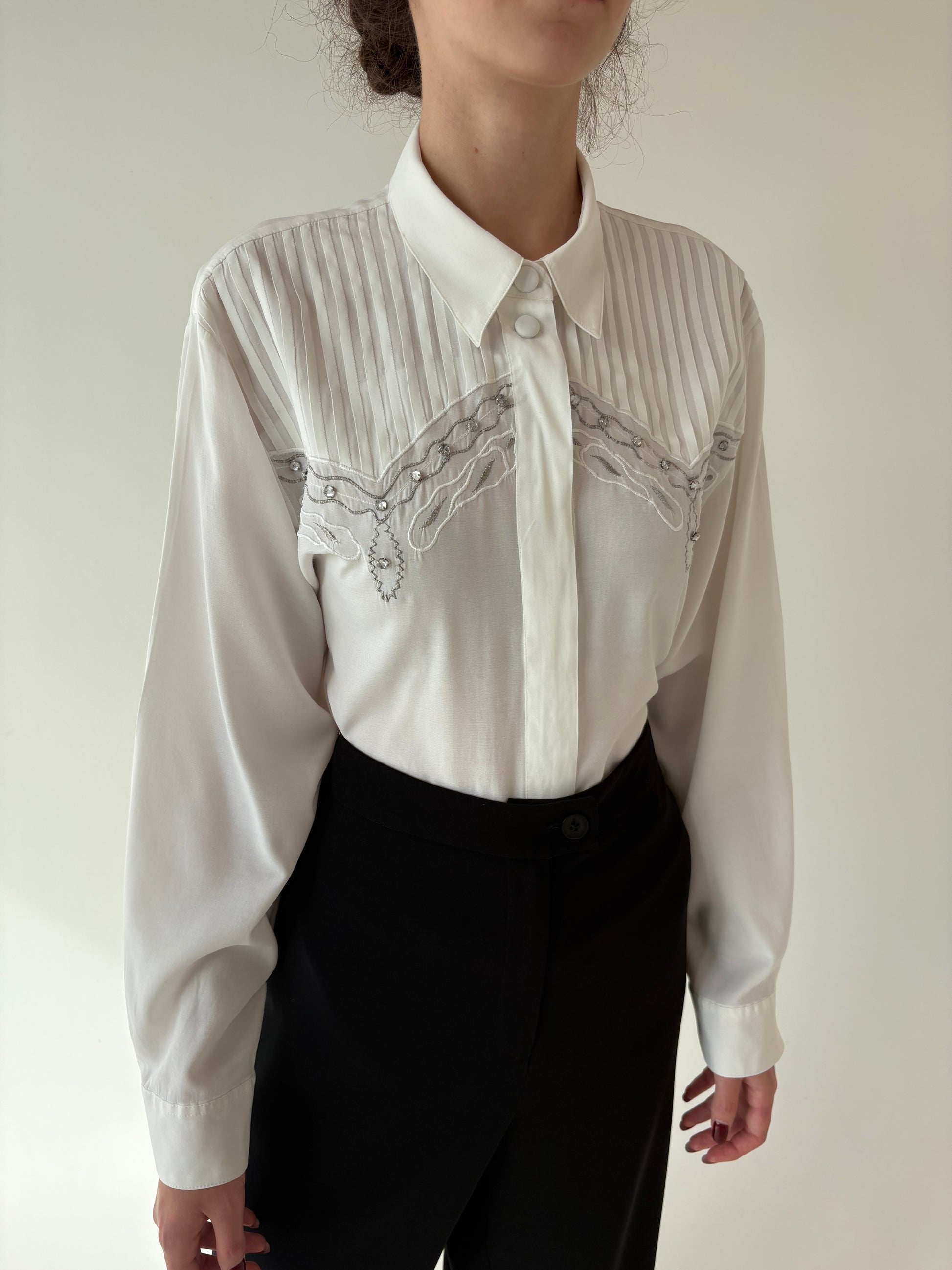 Cămașa vintage în croi elaborat cu pliseuri decorative și aplicații manuale