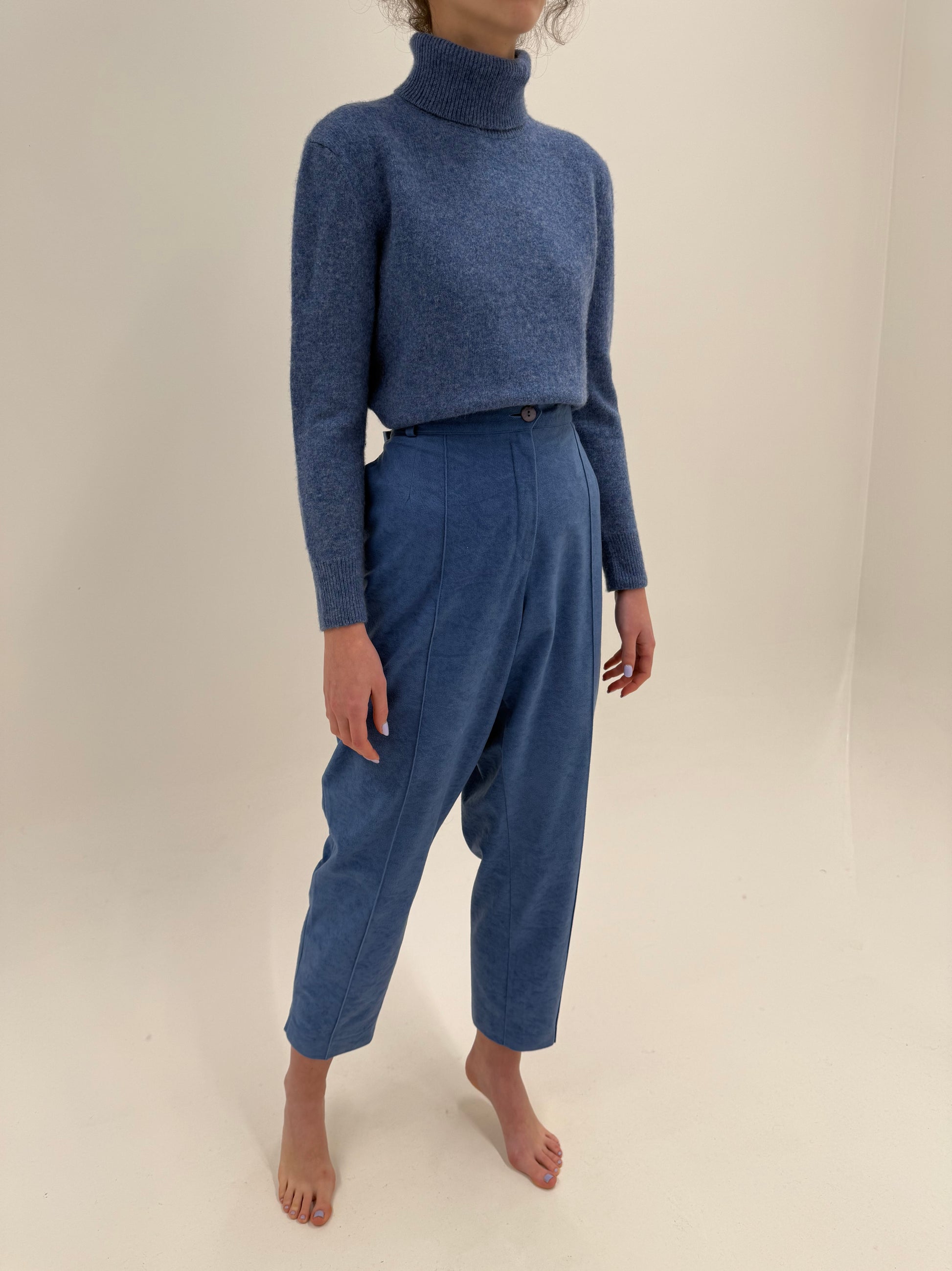 Pantaloni cu talie înaltă și aspect de piele întoarsă albastru ciel