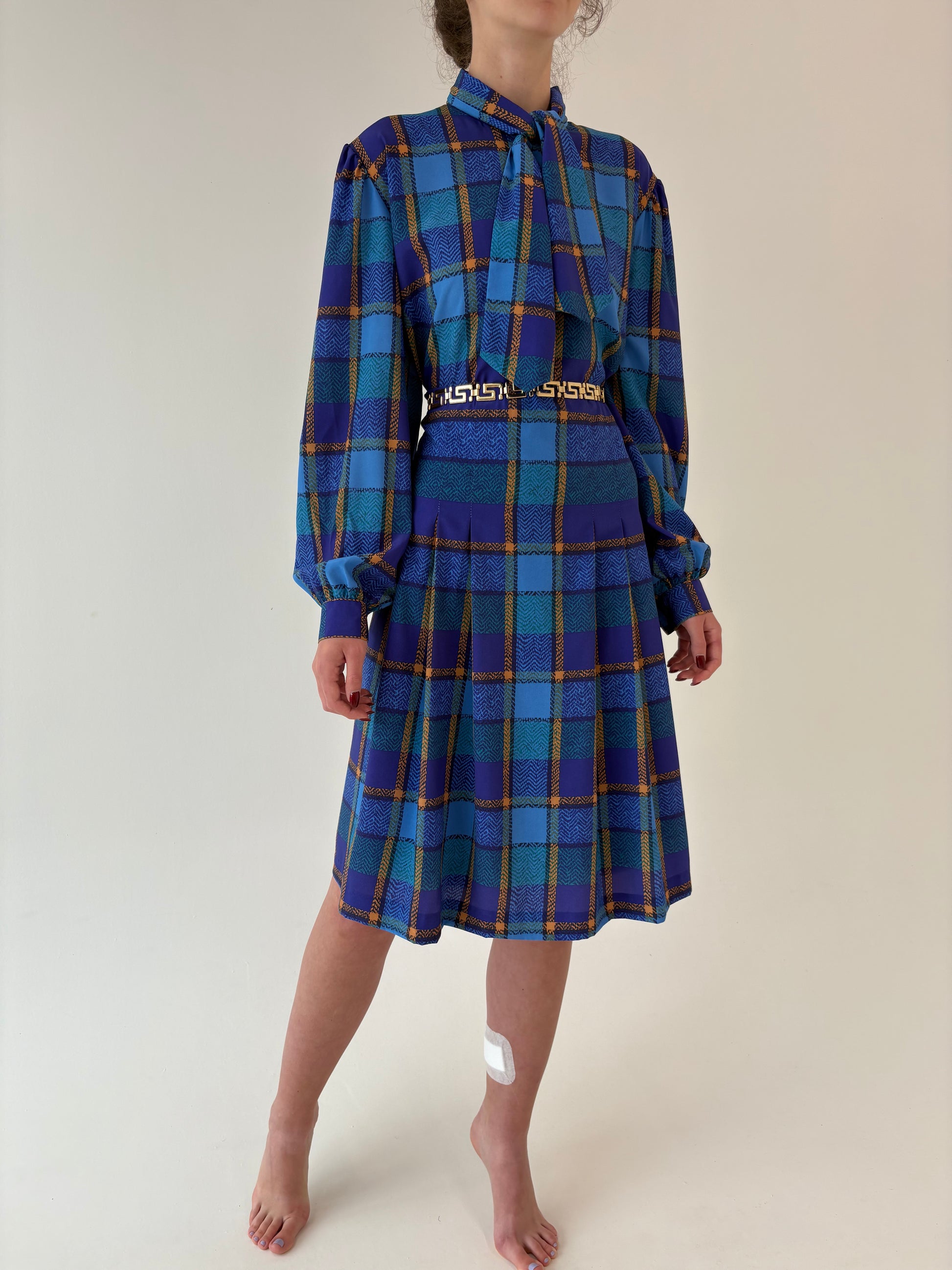 Rochie vintage în carouri cu talie marcată, fustă plisată și buzunare