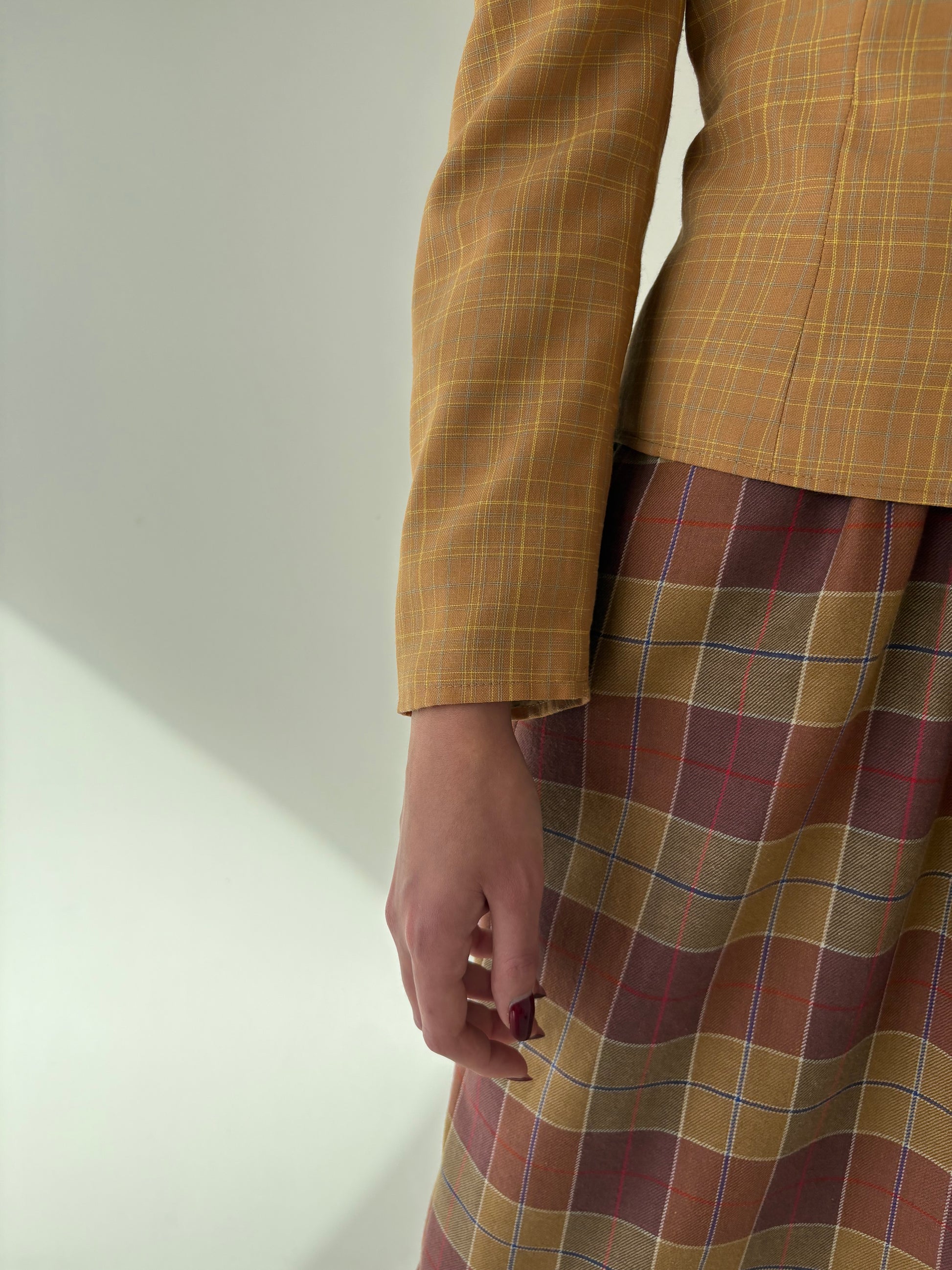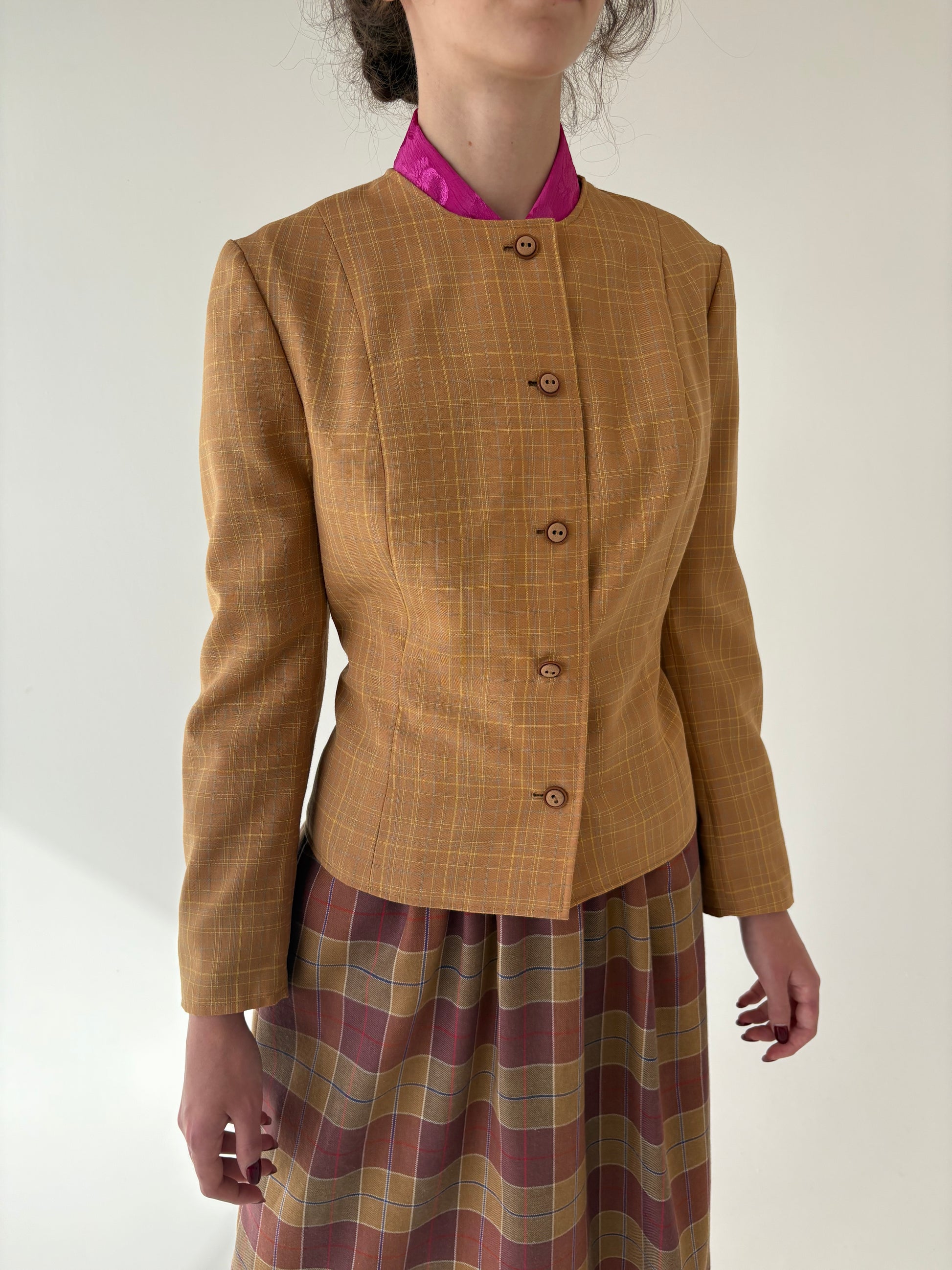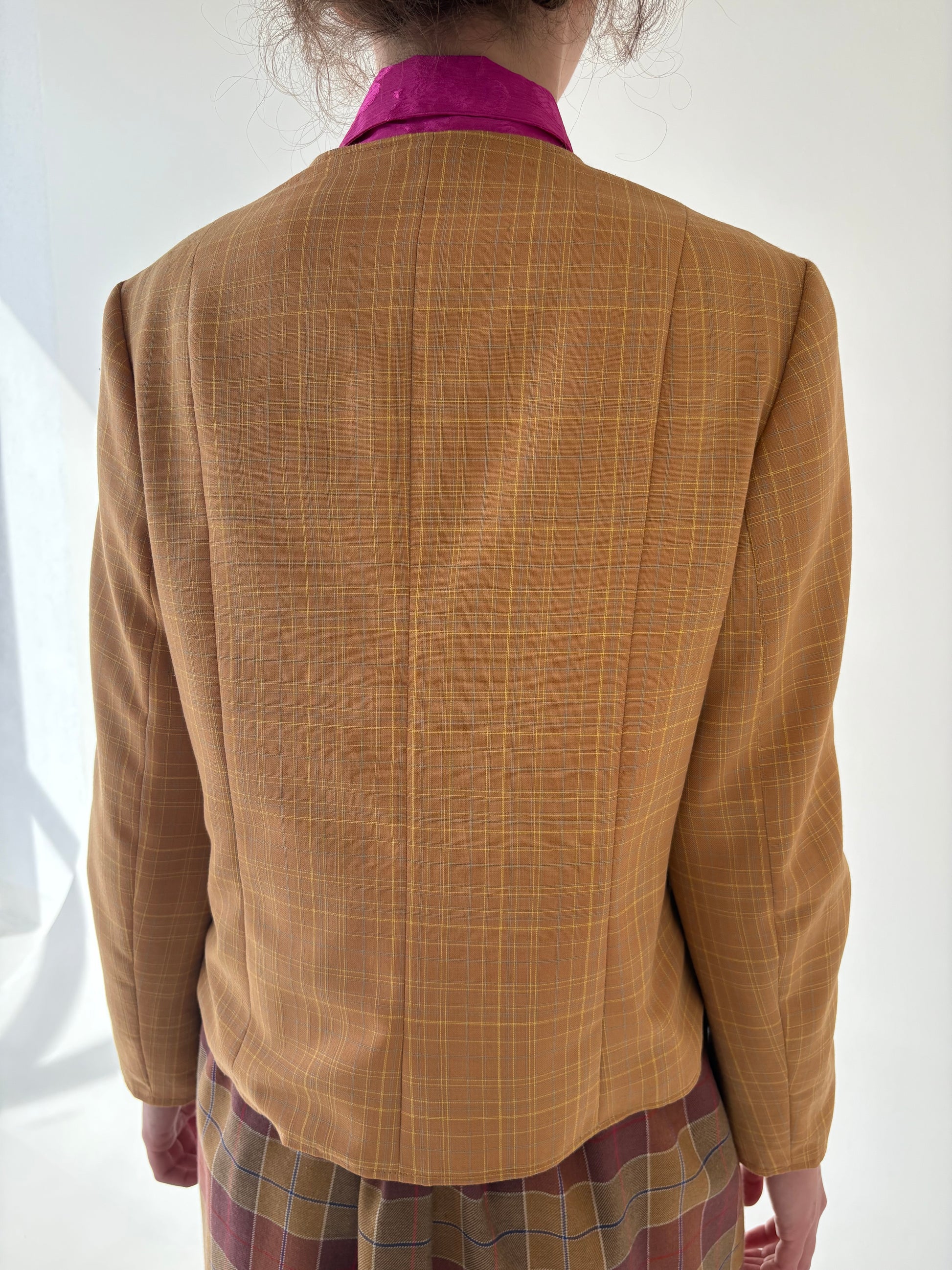 Sacou camel în stil Chanel din stofita de lana extrafina în carouri delicate