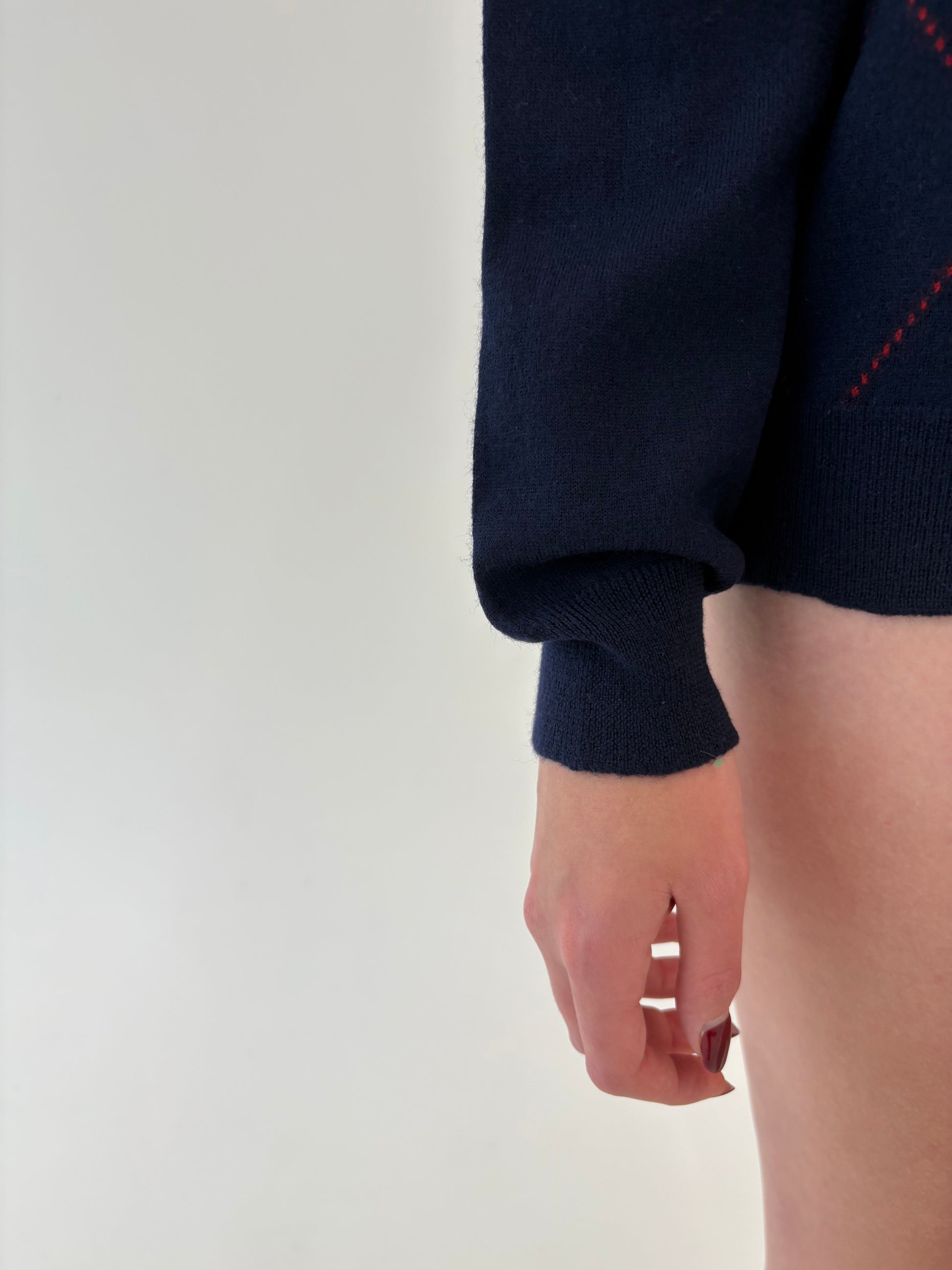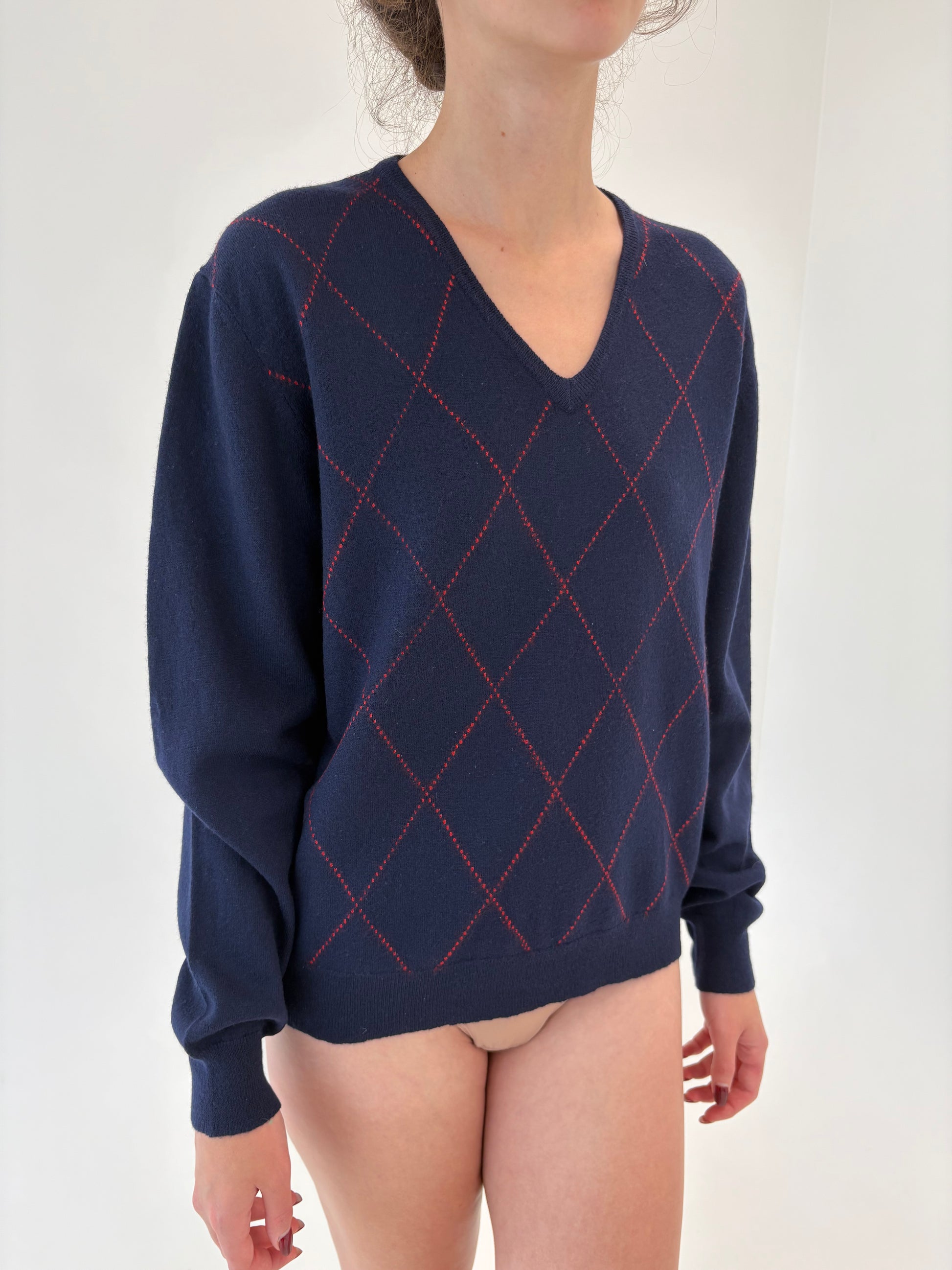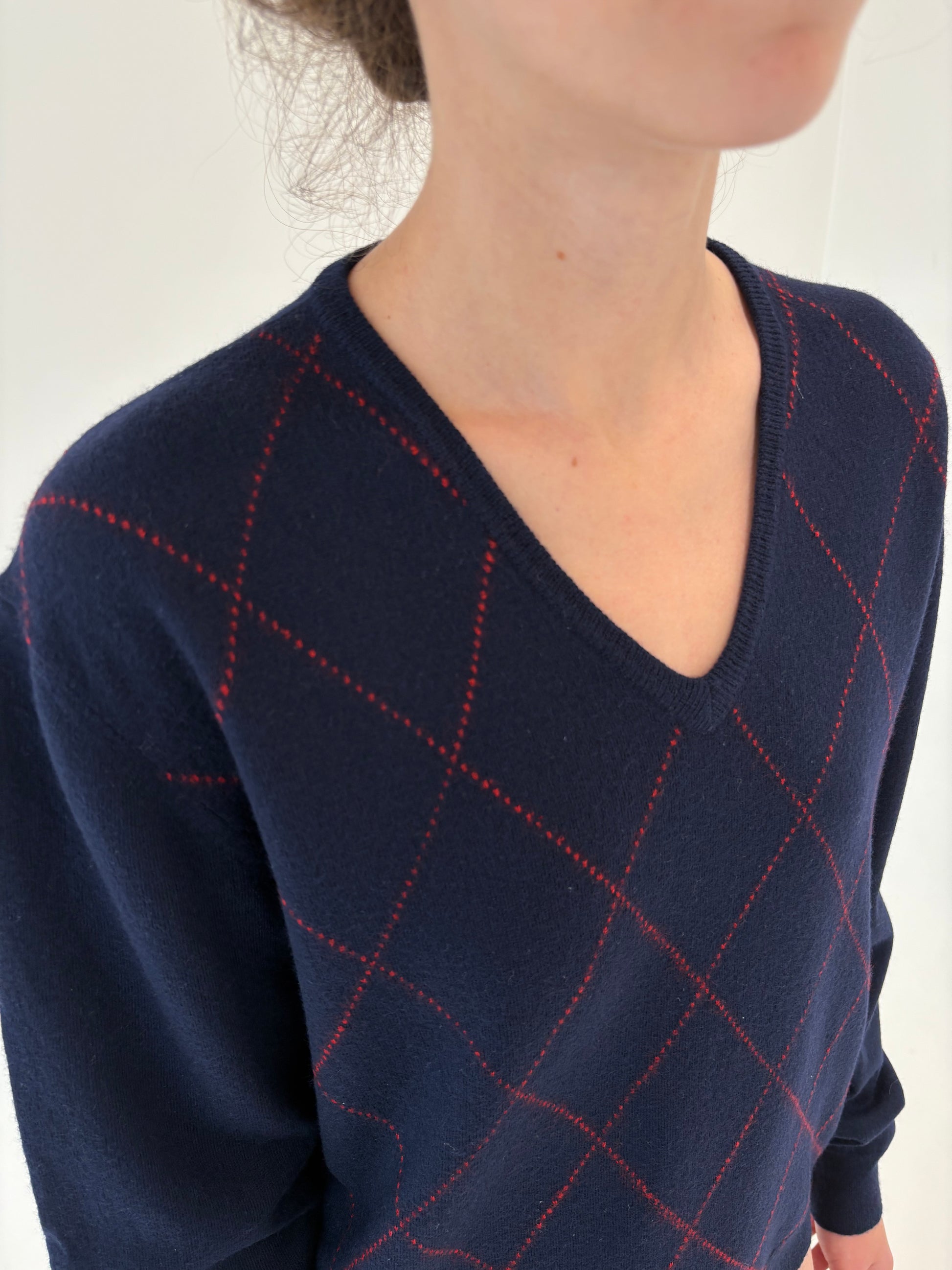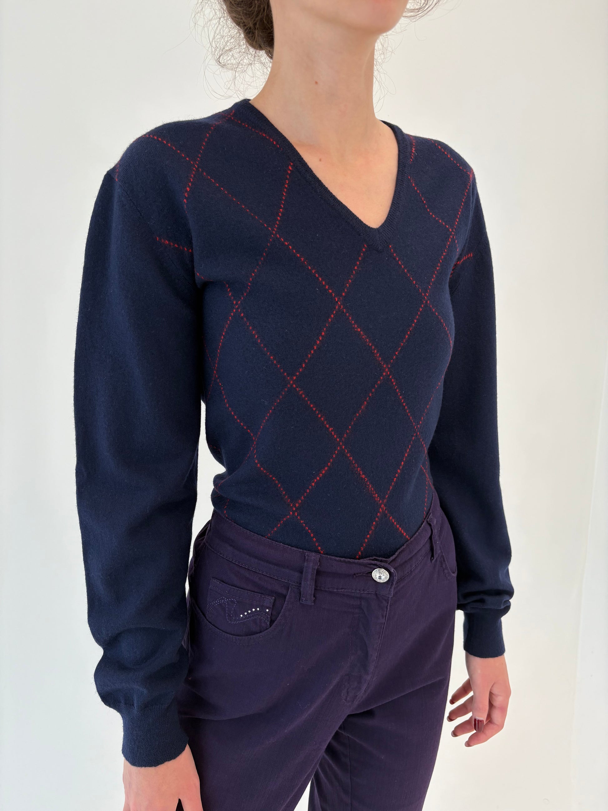 Pulover tall italian din lana merino extrafina de gramaj mare cu romburi burgundy