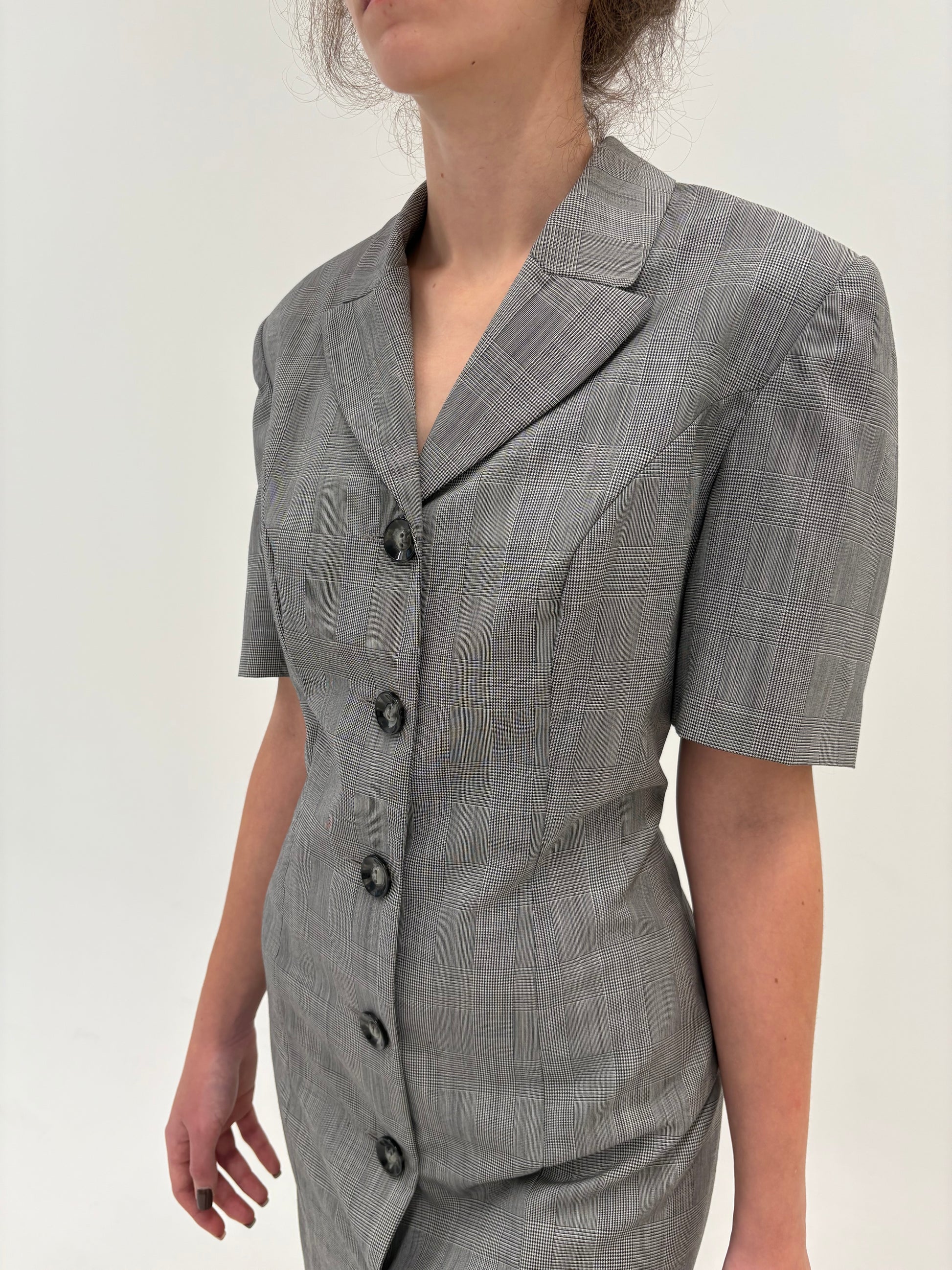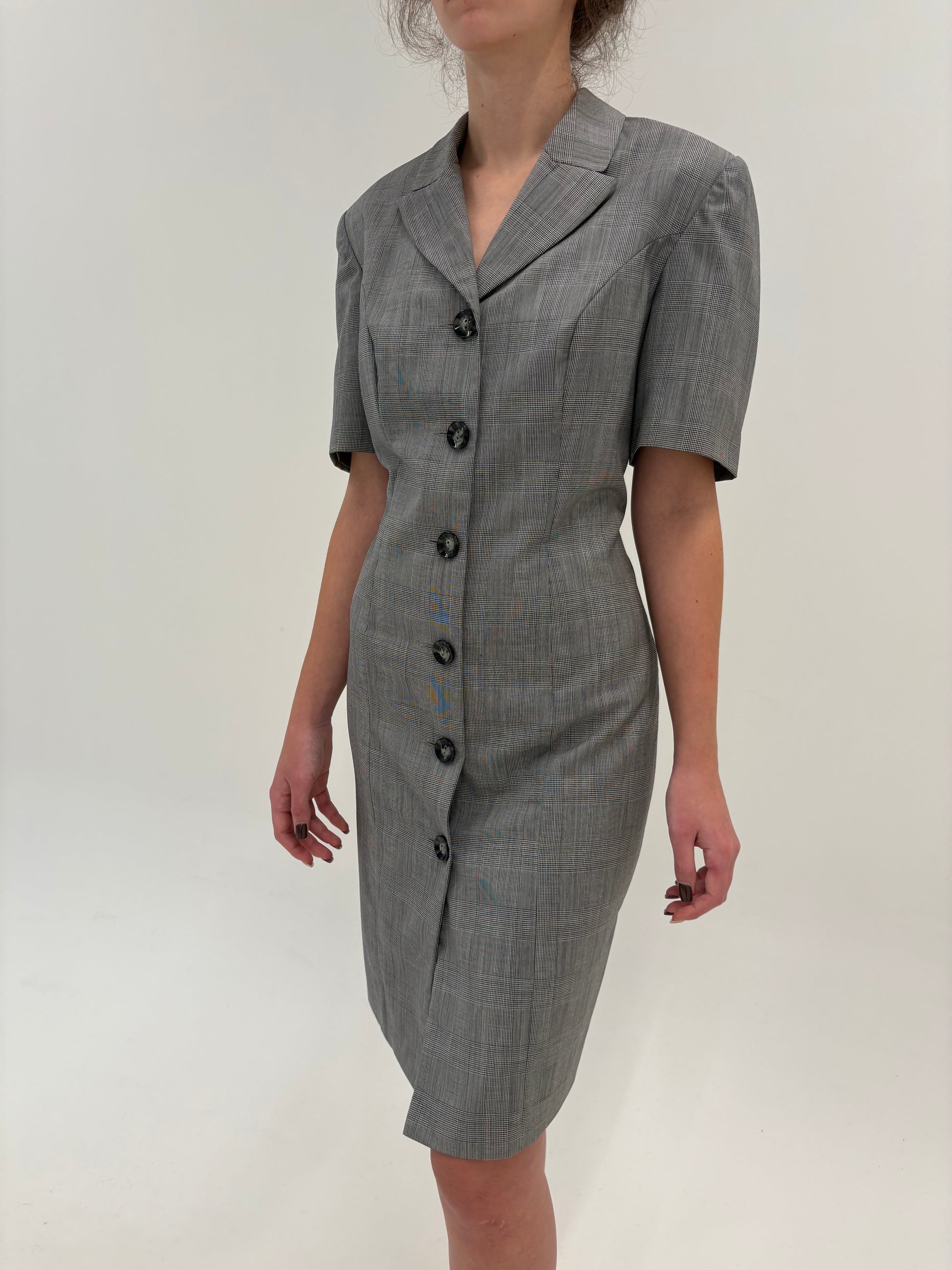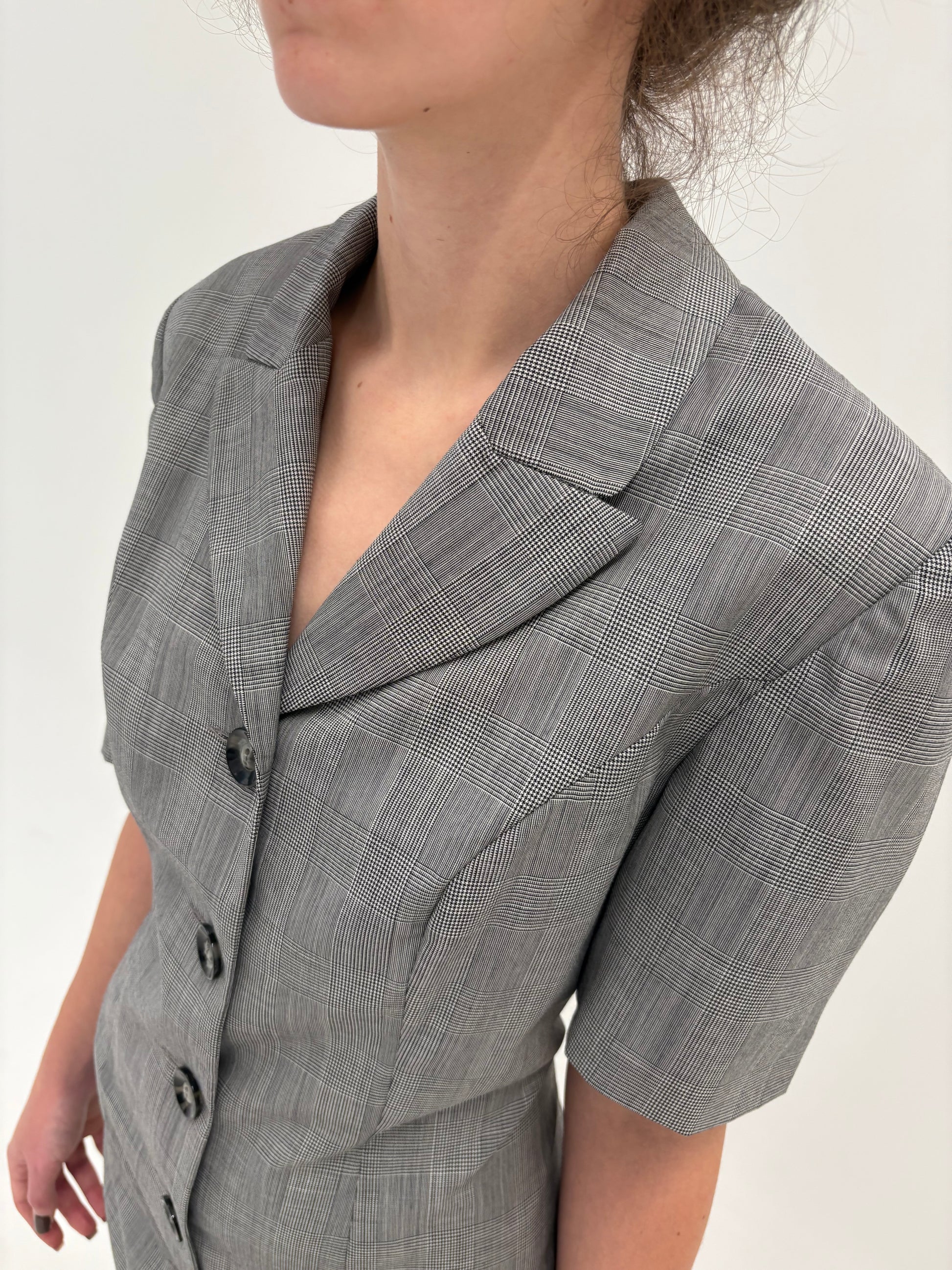 Rochie în carouri fine alb negru din stofă de lana extrafina