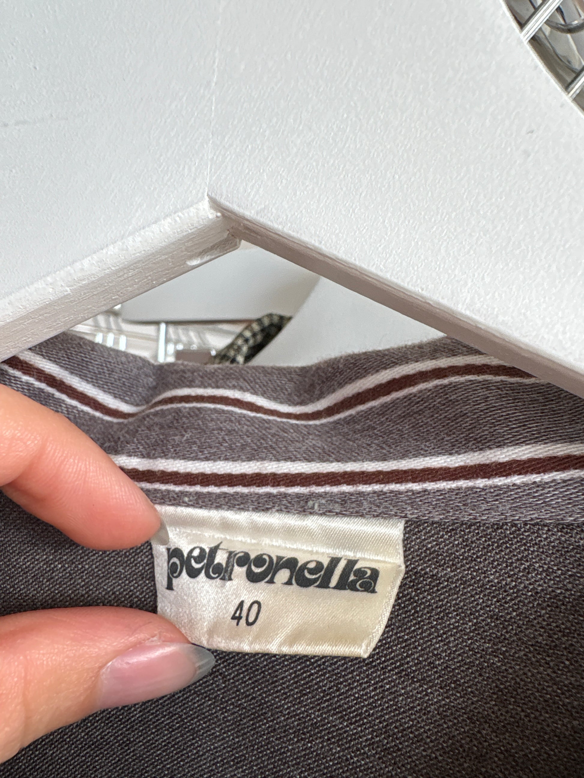Croiala cu elastic lat în talie, buzunare aplicate pe piept și guler mare cu colțuri ascuțite confirmă perioada mid 70s