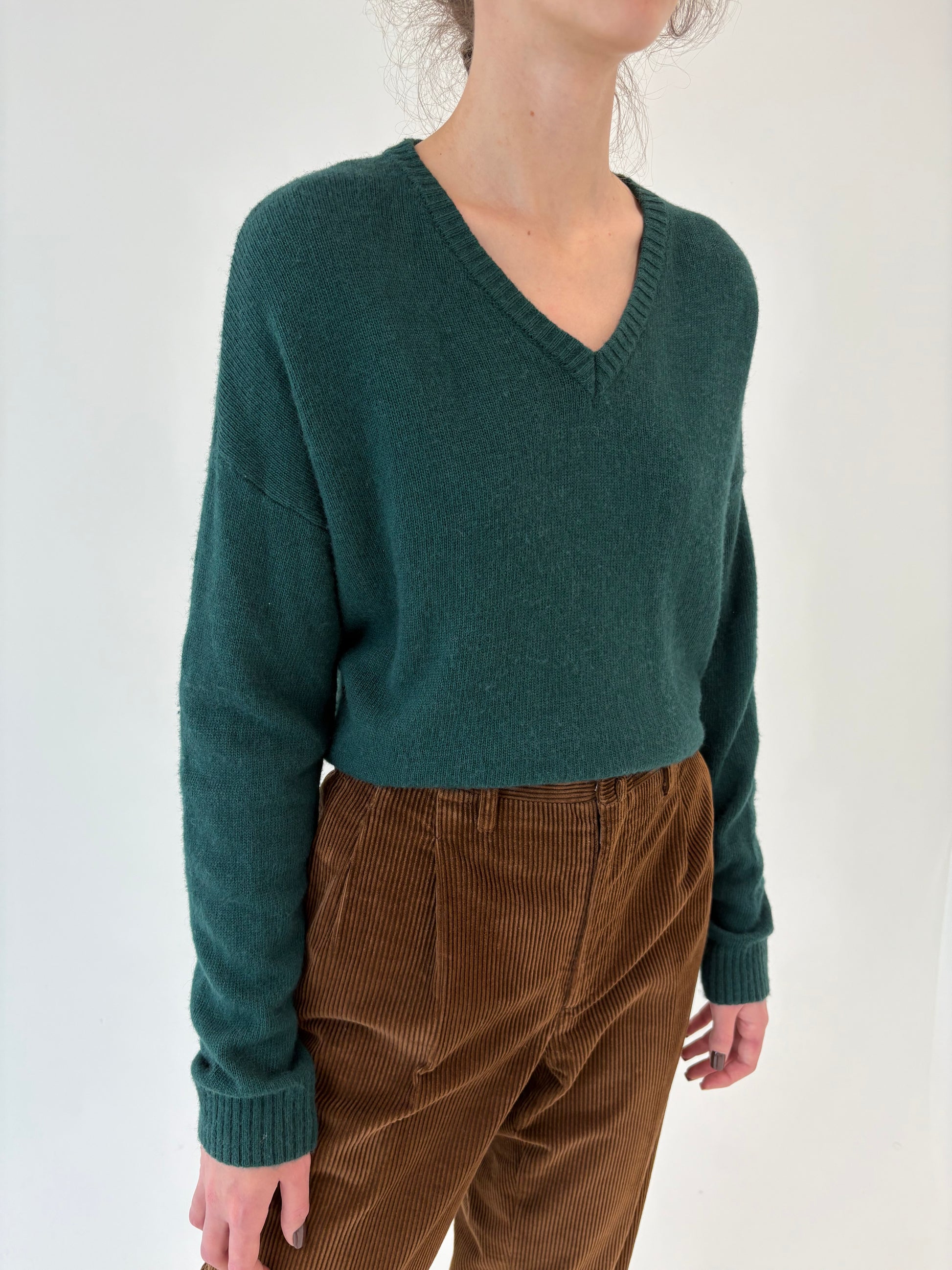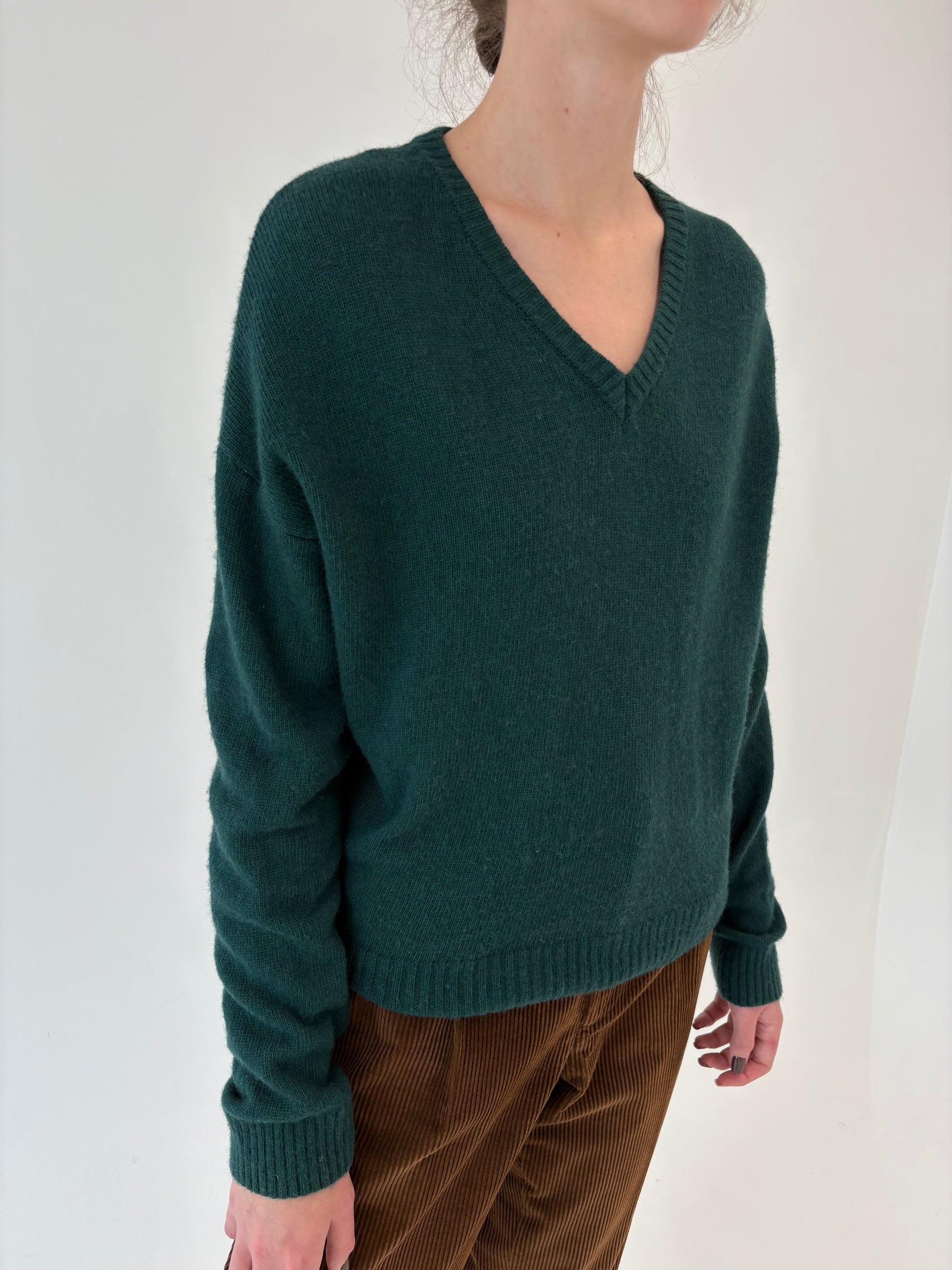 Pulover tall pine green din lana merino extrafina în croi lejer cu mânecă căzută
